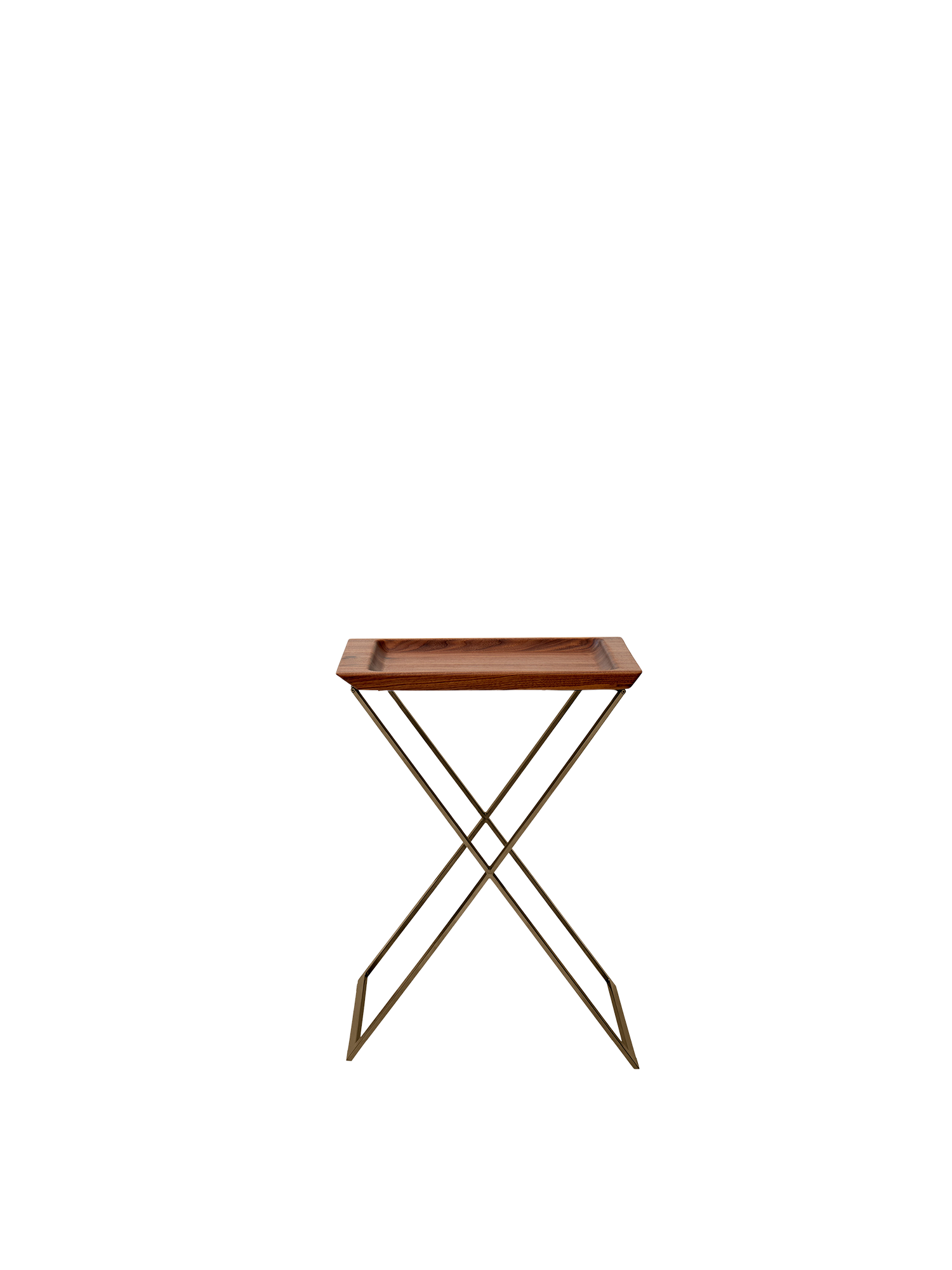 Mit seinen gekreuzten Beinen zitiert der Nate Butler’s Tray den Stil klassischer Serviertische. Aus feinen Edelstahlprofilen gefertigt und poliert oder bronziert, verbindet er Stabilität mit Leichtigkeit. Auf einem farblich abgestimmten ledernen Träger ruht passgenau ein zart geschwungenes Tablett aus amerikanischem Nussbaum.