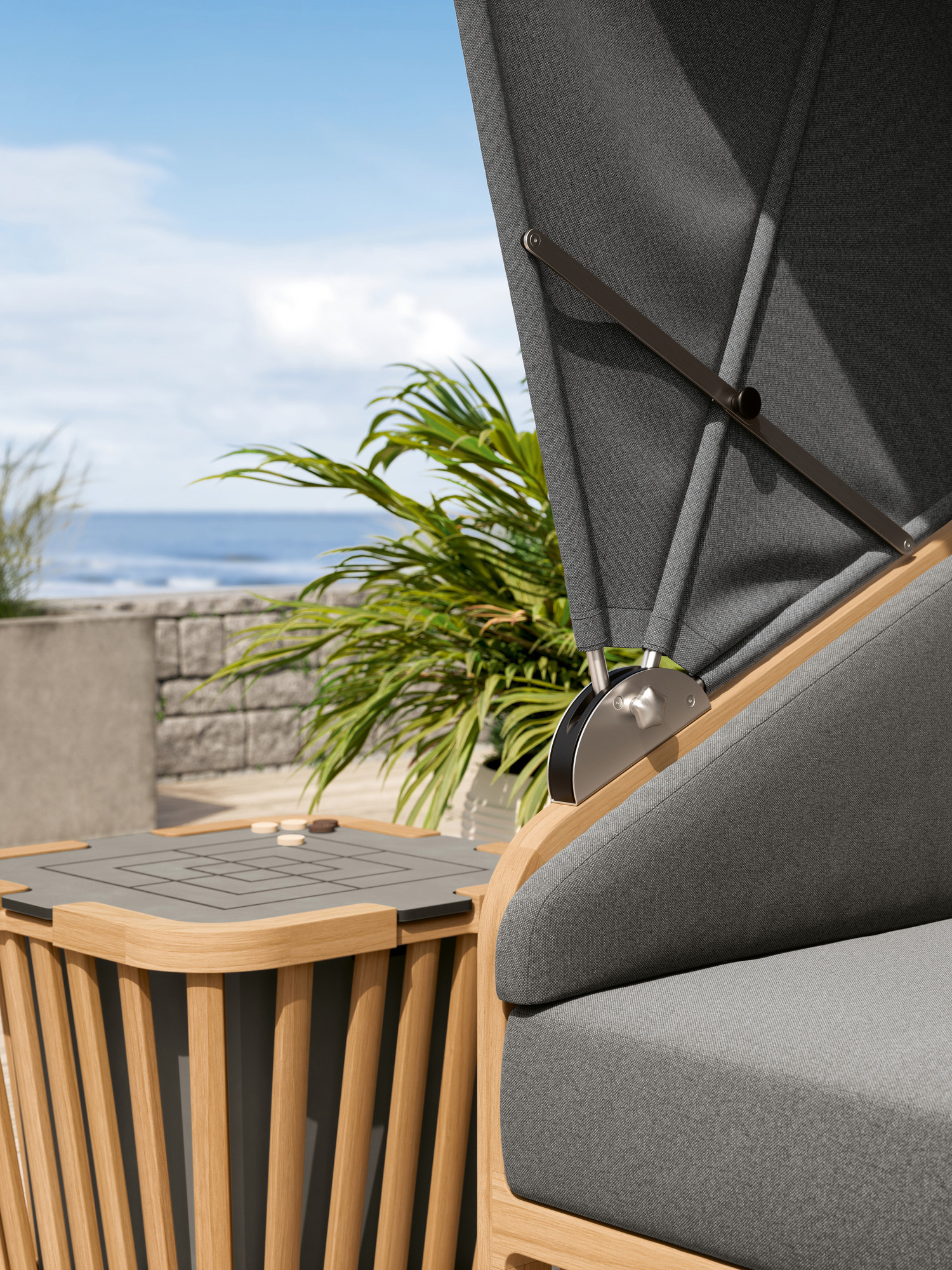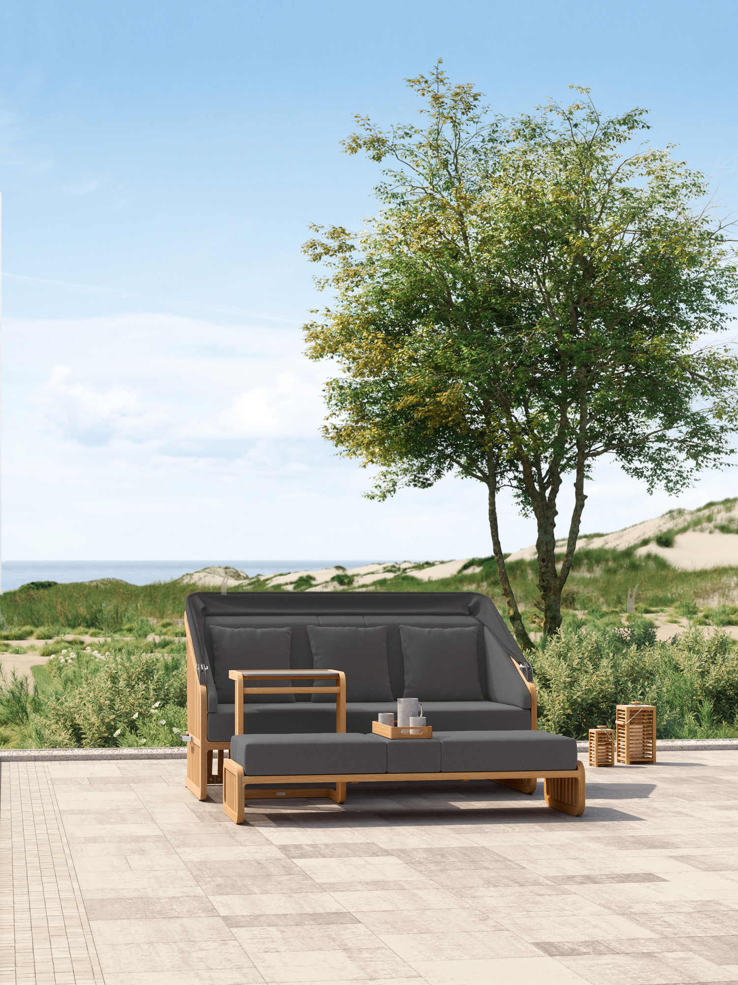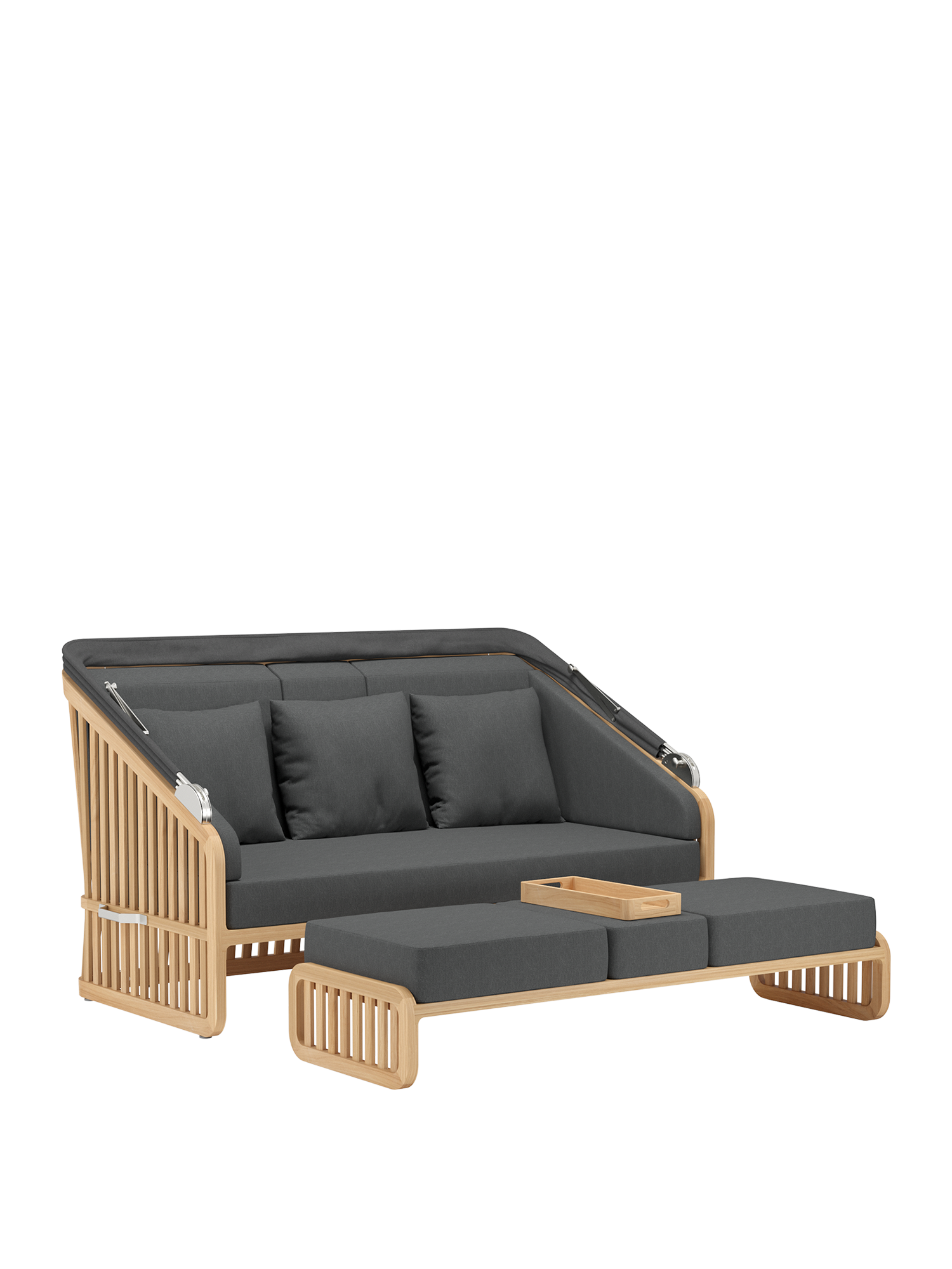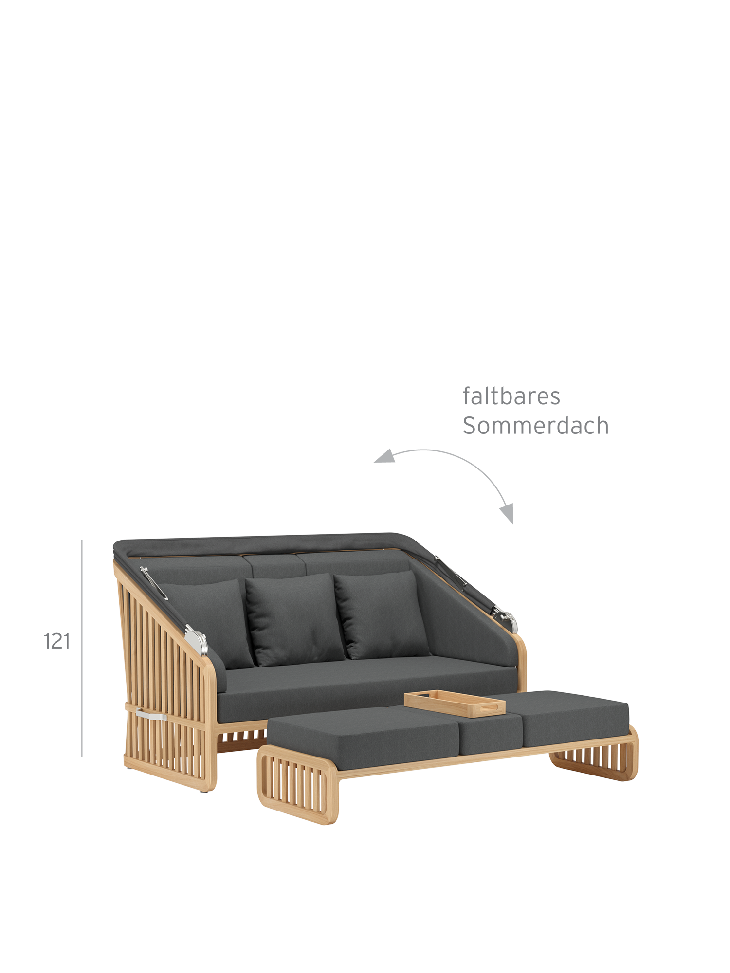 Eine großzügige Privatinsel birgt alle Annehmlichkeiten, um jeden Sommertag in eine glückliche Fügung zu verwandeln. Platz und Polster zum Sitzen, Liegen und Anlehnen gibt es genug. Das integrierte Sommerdach schirmt ab vor Blicken, schützt vor Sonne oder Wind und verlängert die Saison. Im Handumdrehen ist das Homeoffice darunter eingerichtet – in entspannter Atmosphäre, mit bester Aussicht auf schöpferische Pausen. Eine gepolsterte Bank schafft Platz zum Ausstrecken der Beine, aber auch für ein separates Bad in der Sonne.