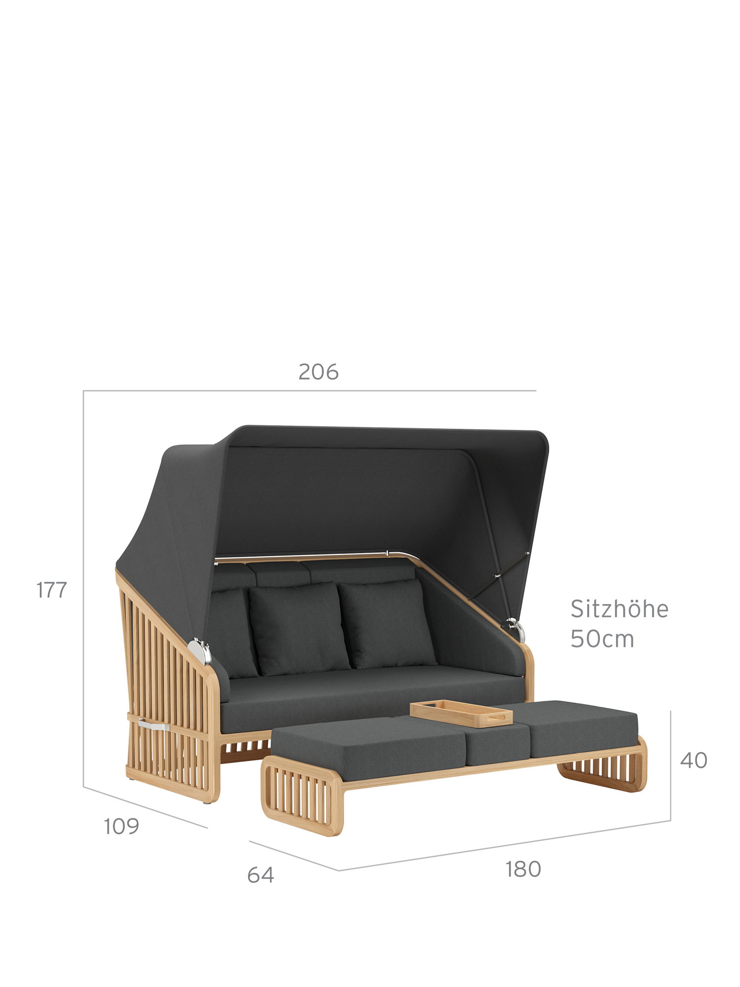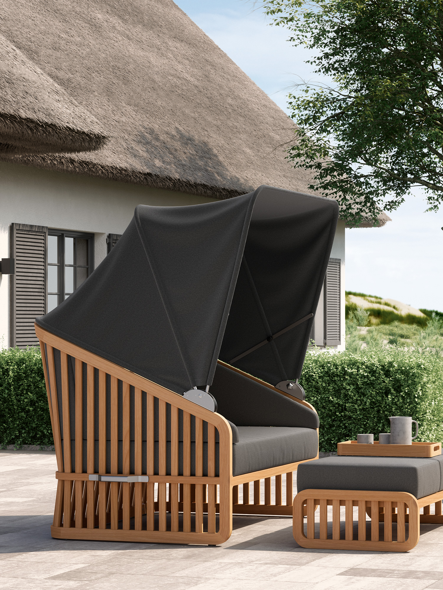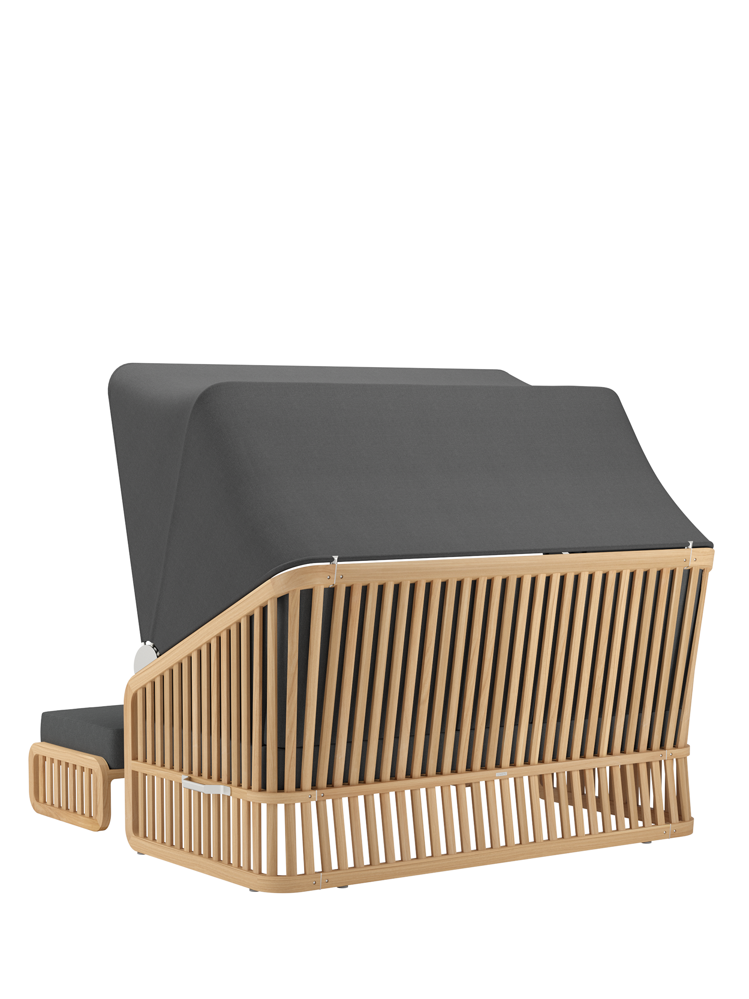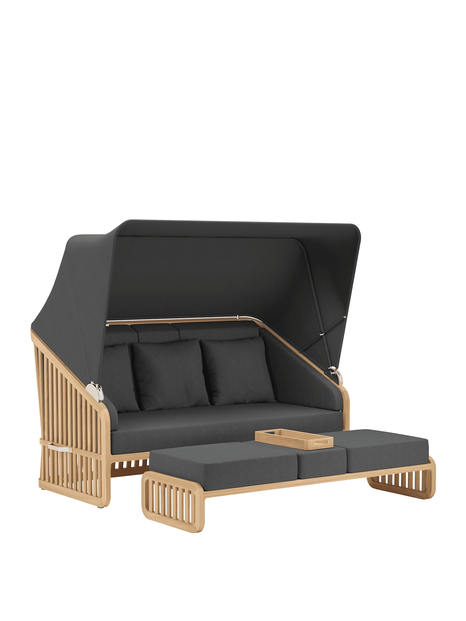 Eine großzügige Privatinsel birgt alle Annehmlichkeiten, um jeden Sommertag in eine glückliche Fügung zu verwandeln. Platz und Polster zum Sitzen, Liegen und Anlehnen gibt es genug. Das integrierte Sommerdach schirmt ab vor Blicken, schützt vor Sonne oder Wind und verlängert die Saison. Im Handumdrehen ist das Homeoffice darunter eingerichtet – in entspannter Atmosphäre, mit bester Aussicht auf schöpferische Pausen. Eine gepolsterte Bank schafft Platz zum Ausstrecken der Beine, aber auch für ein separates Bad in der Sonne.