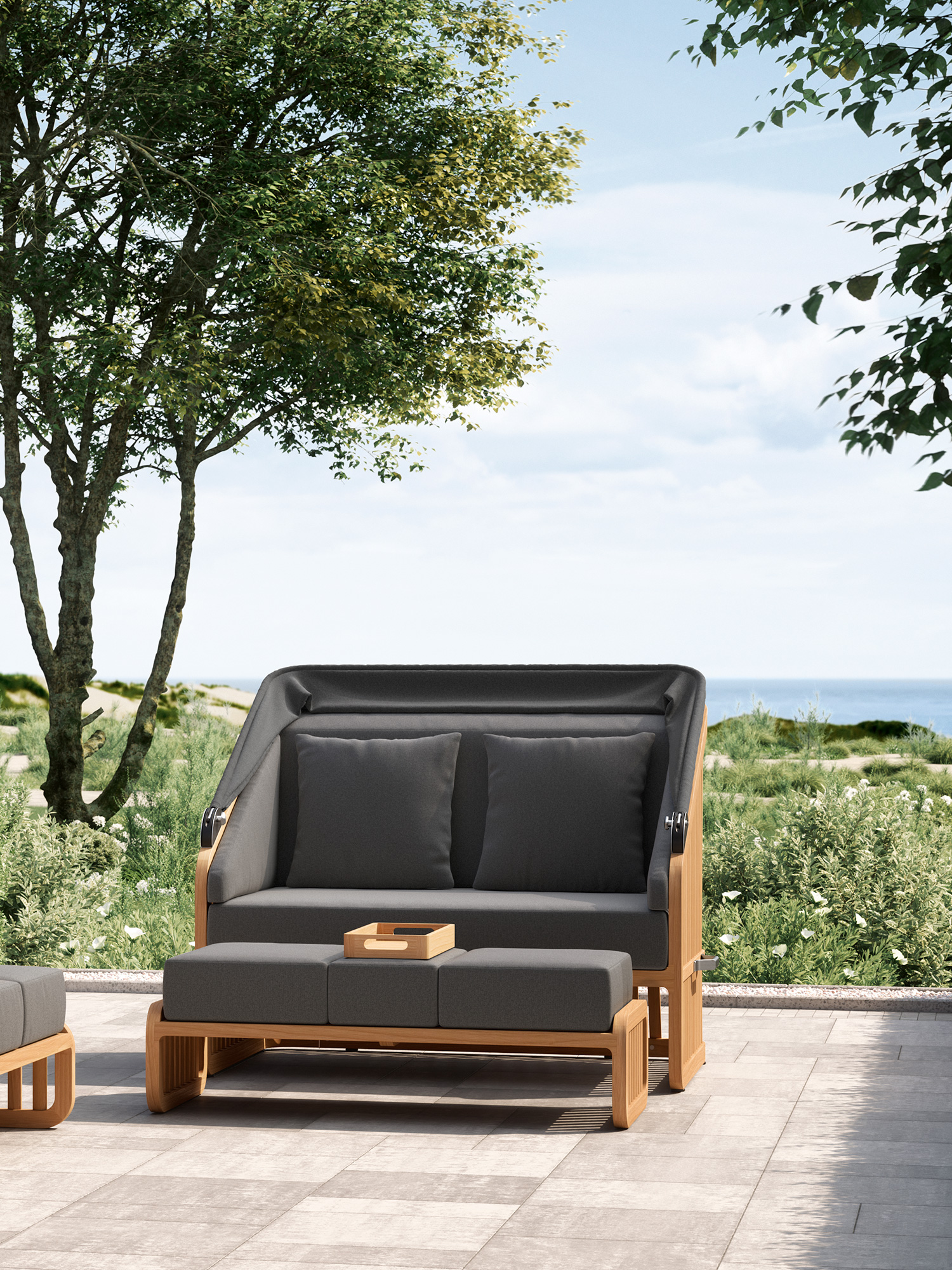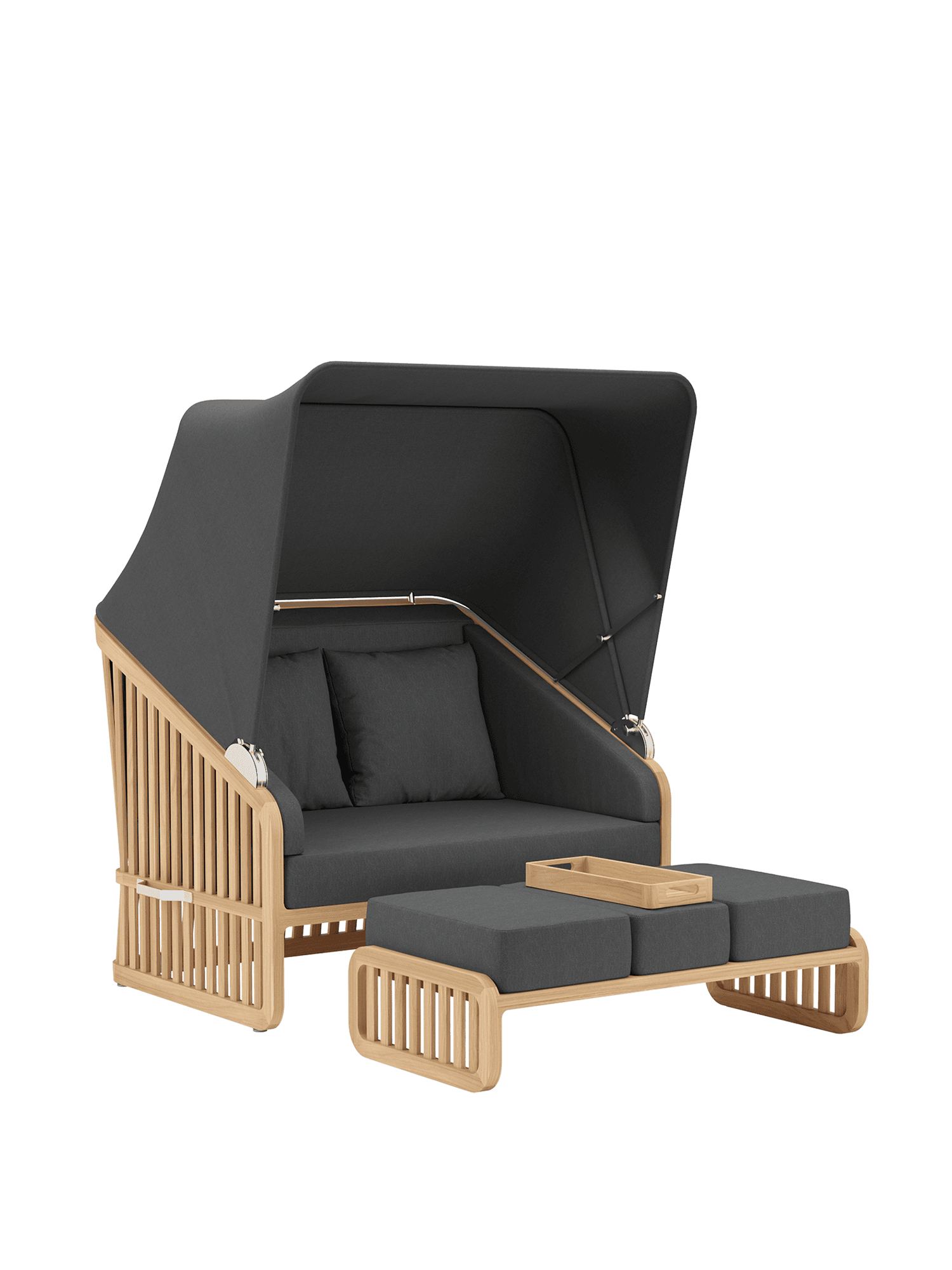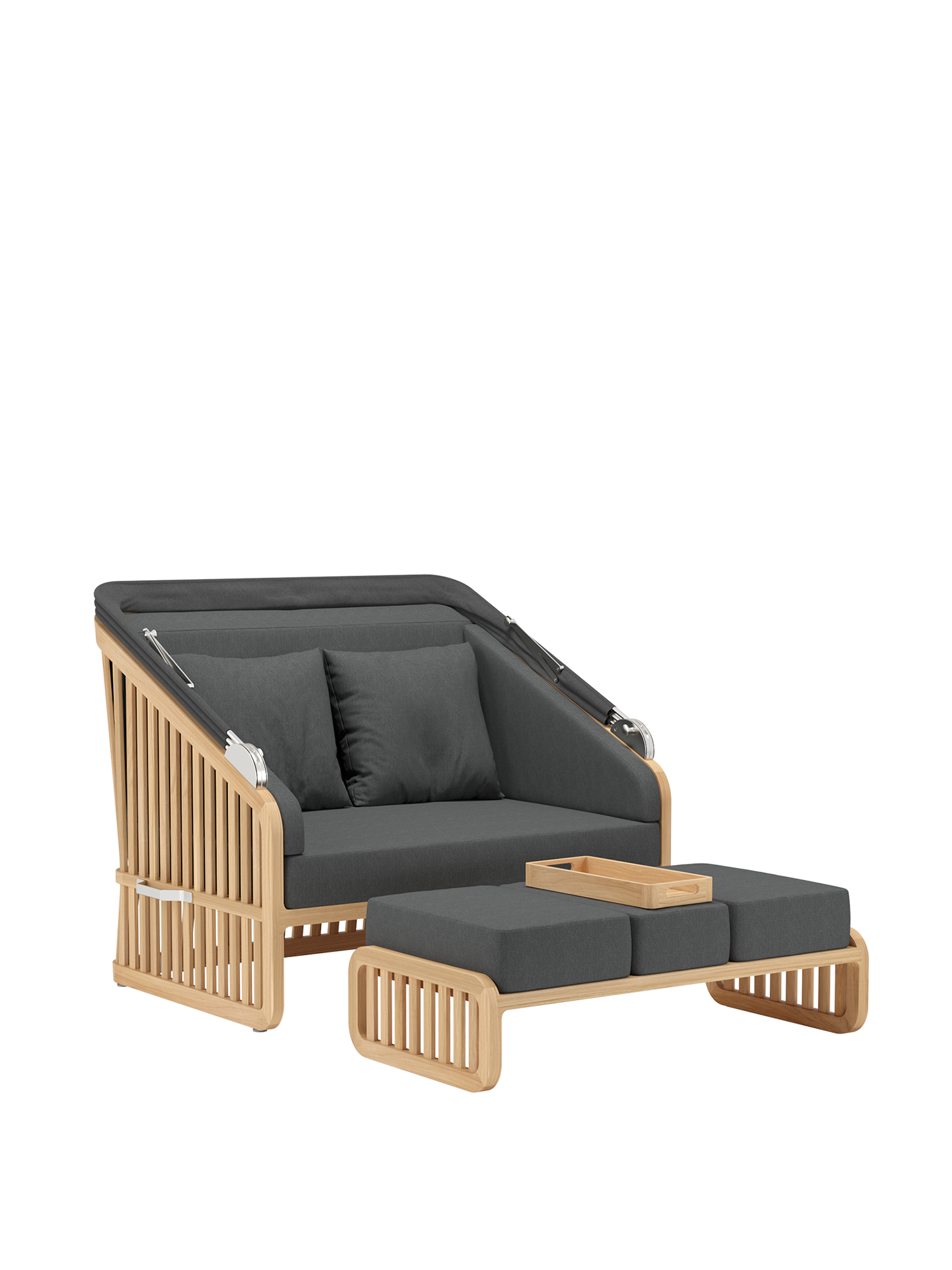Der Wechsel zwischen Sonneninsel und Schattenplatz gestaltet sich äußerst flexibel: Zurückgeklappt umrahmt das Sommerdach dezent die Kissenlandschaft, aufgespannt wölbt es sich wie ein Kokon über der privaten Nische. Das luftige Design der Streben und ihre Taillierung im Rücken verleihen dem massiven Material eine ungewöhnlich leichte Optik. Newcastle gibt es als Zwei- oder Dreisitzer – immer mit einer gepolsterten Bank, die ohne Kissen unter der Sitzfläche verschwindet, wenn sie nicht gebraucht wird. Das mitgelieferte Teaktablett sichert den Nachschub an Snacks und Drinks.