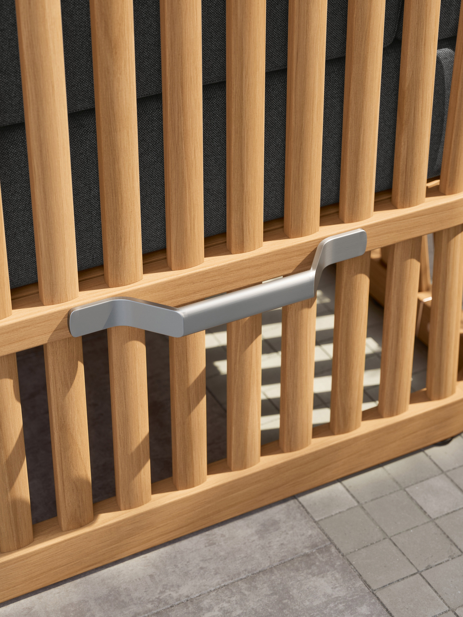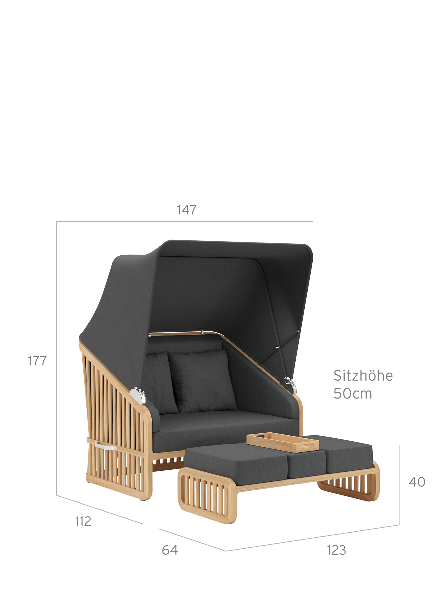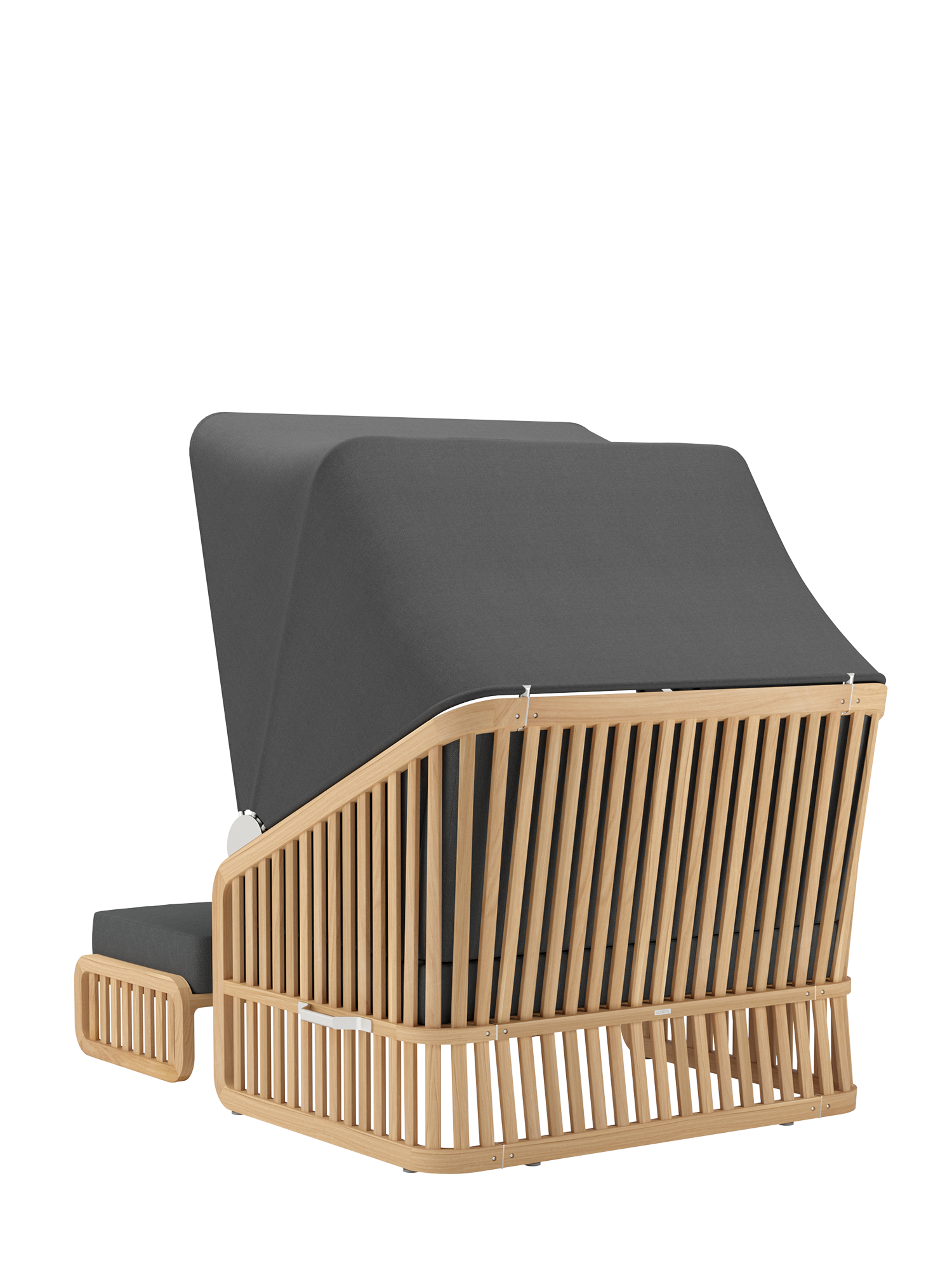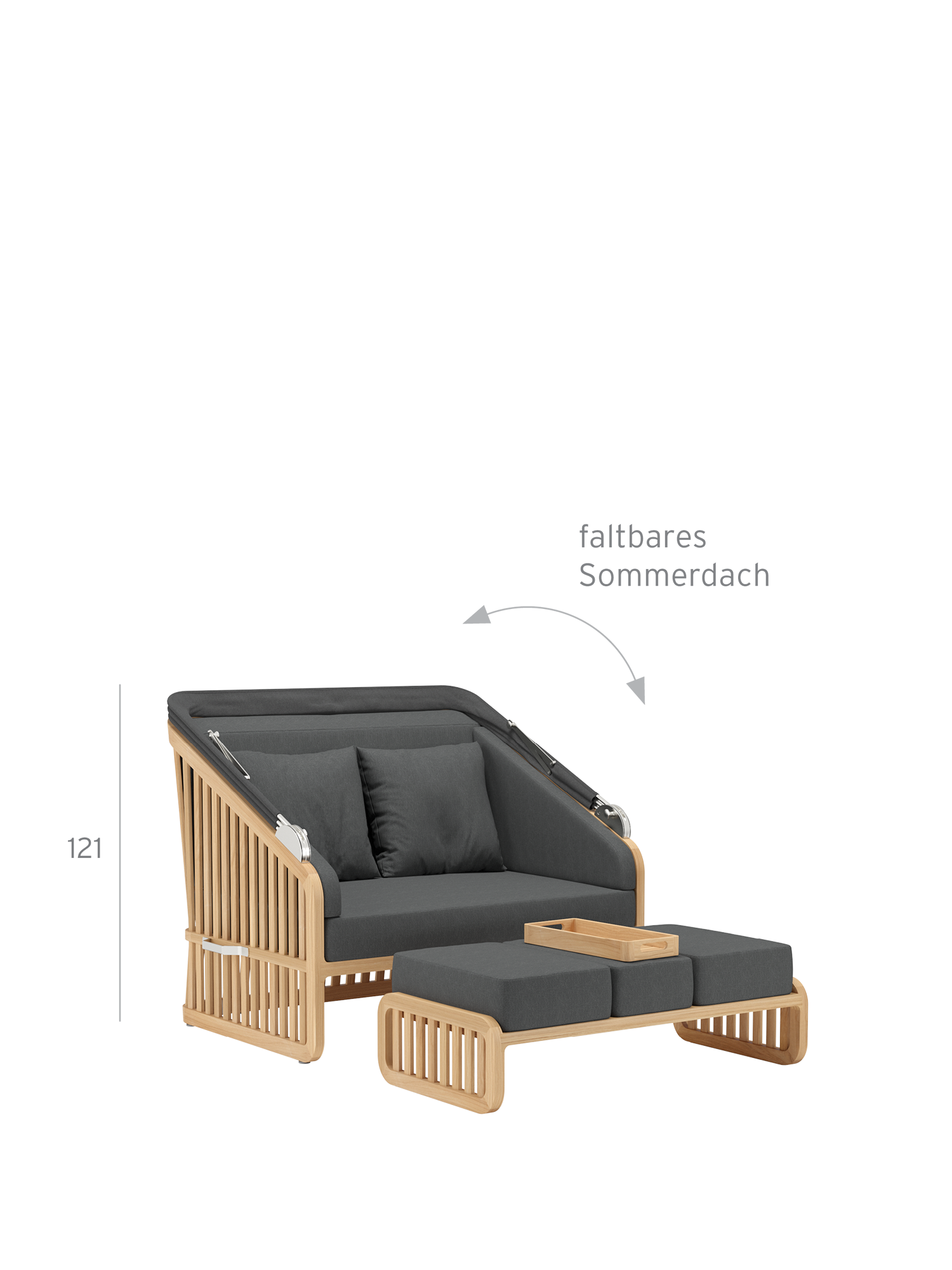 Der Wechsel zwischen Sonneninsel und Schattenplatz gestaltet sich äußerst flexibel: Zurückgeklappt umrahmt das Sommerdach dezent die Kissenlandschaft, aufgespannt wölbt es sich wie ein Kokon über der privaten Nische. Das luftige Design der Streben und ihre Taillierung im Rücken verleihen dem massiven Material eine ungewöhnlich leichte Optik. Newcastle gibt es als Zwei- oder Dreisitzer – immer mit einer gepolsterten Bank, die ohne Kissen unter der Sitzfläche verschwindet, wenn sie nicht gebraucht wird. Das mitgelieferte Teaktablett sichert den Nachschub an Snacks und Drinks.