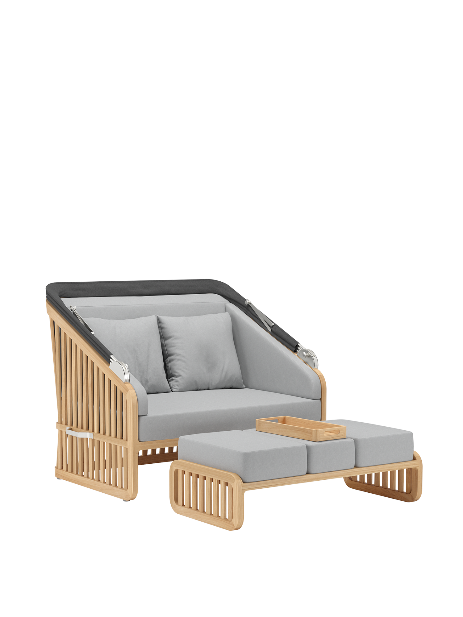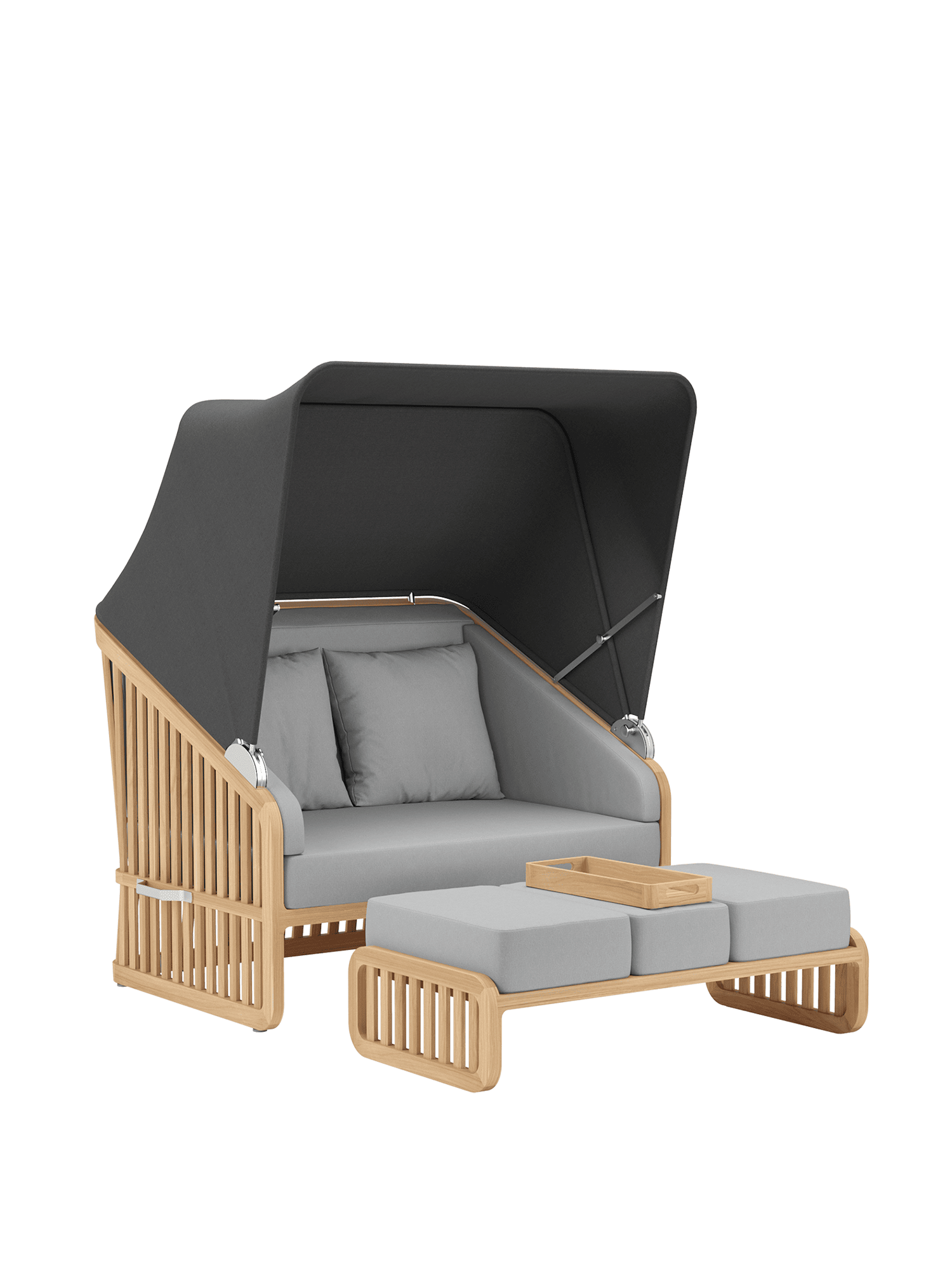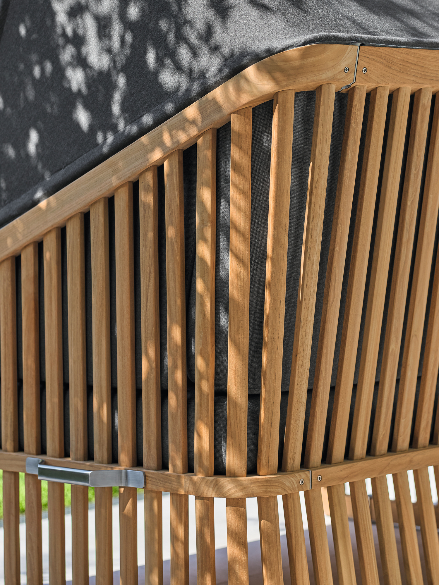 Der Wechsel zwischen Sonneninsel und Schattenplatz gestaltet sich äußerst flexibel: Zurückgeklappt umrahmt das Sommerdach dezent die Kissenlandschaft, aufgespannt wölbt es sich wie ein Kokon über der privaten Nische. Das luftige Design der Streben und ihre Taillierung im Rücken verleihen dem massiven Material eine ungewöhnlich leichte Optik. Newcastle gibt es als Zwei- oder Dreisitzer – immer mit einer gepolsterten Bank, die ohne Kissen unter der Sitzfläche verschwindet, wenn sie nicht gebraucht wird. Das mitgelieferte Teaktablett sichert den Nachschub an Snacks und Drinks.