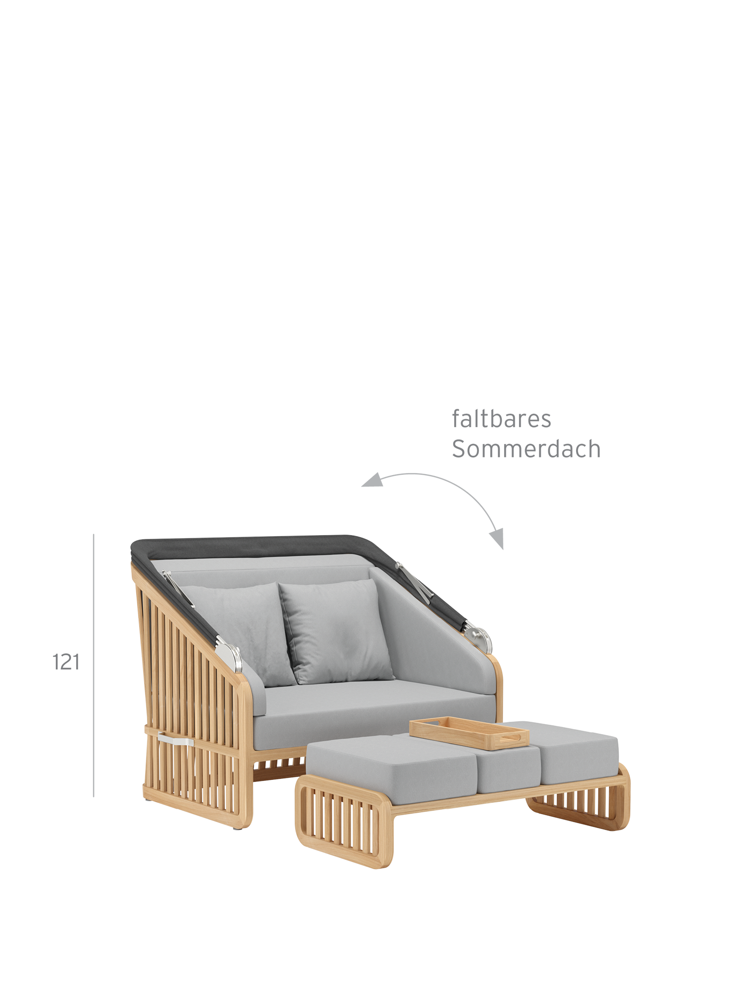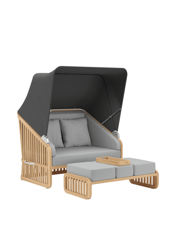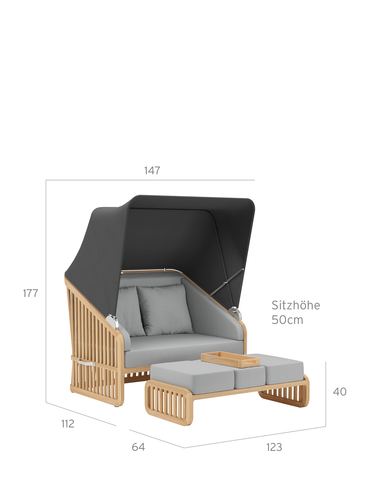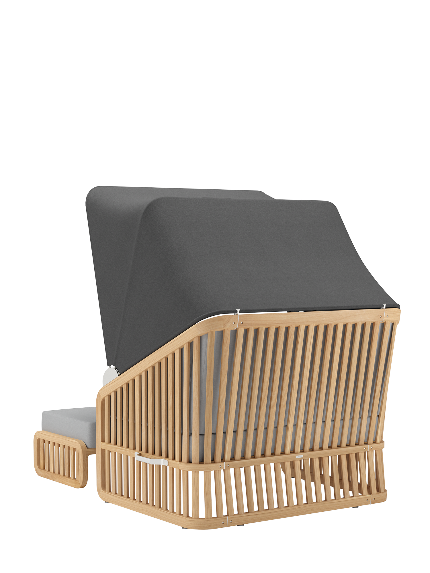 Der Wechsel zwischen Sonneninsel und Schattenplatz gestaltet sich äußerst flexibel: Zurückgeklappt umrahmt das Sommerdach dezent die Kissenlandschaft, aufgespannt wölbt es sich wie ein Kokon über der privaten Nische. Das luftige Design der Streben und ihre Taillierung im Rücken verleihen dem massiven Material eine ungewöhnlich leichte Optik. Newcastle gibt es als Zwei- oder Dreisitzer – immer mit einer gepolsterten Bank, die ohne Kissen unter der Sitzfläche verschwindet, wenn sie nicht gebraucht wird. Das mitgelieferte Teaktablett sichert den Nachschub an Snacks und Drinks.