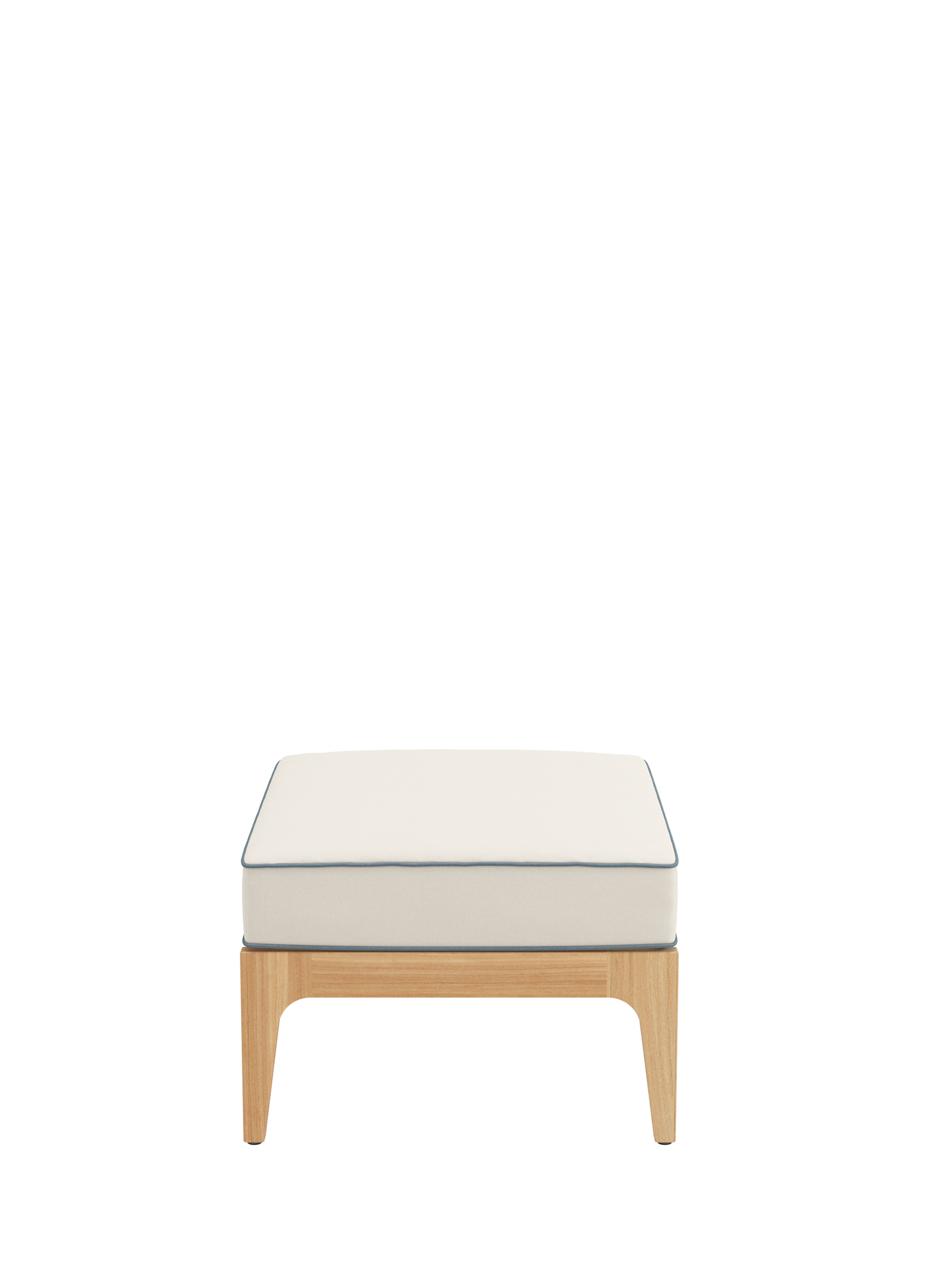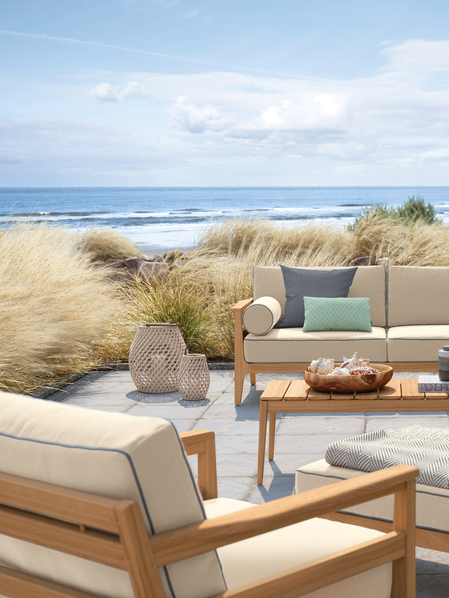 In die großzügigen Polstermöbel im Loungeformat zieht man sich gerne zurück. Ihre Rahmen sind aus hochwertigem Plantagenteakholz gefertigt, die Sitzflächen mit einem Gewebe bespannt, das die komfortablen Polster sicher trägt. Als markantes Merkmal verleihen aufwendig verarbeitete Keder dem klassischen Refugium seine maritime Anmutung. Alle Kissen sind farbig umrandet.