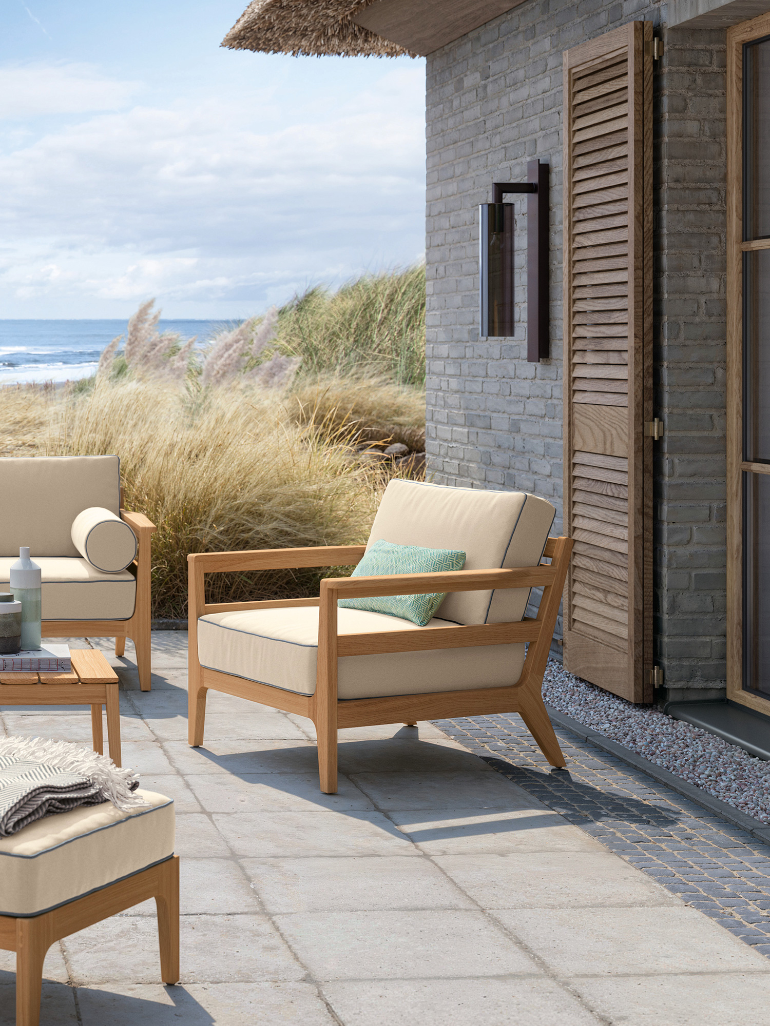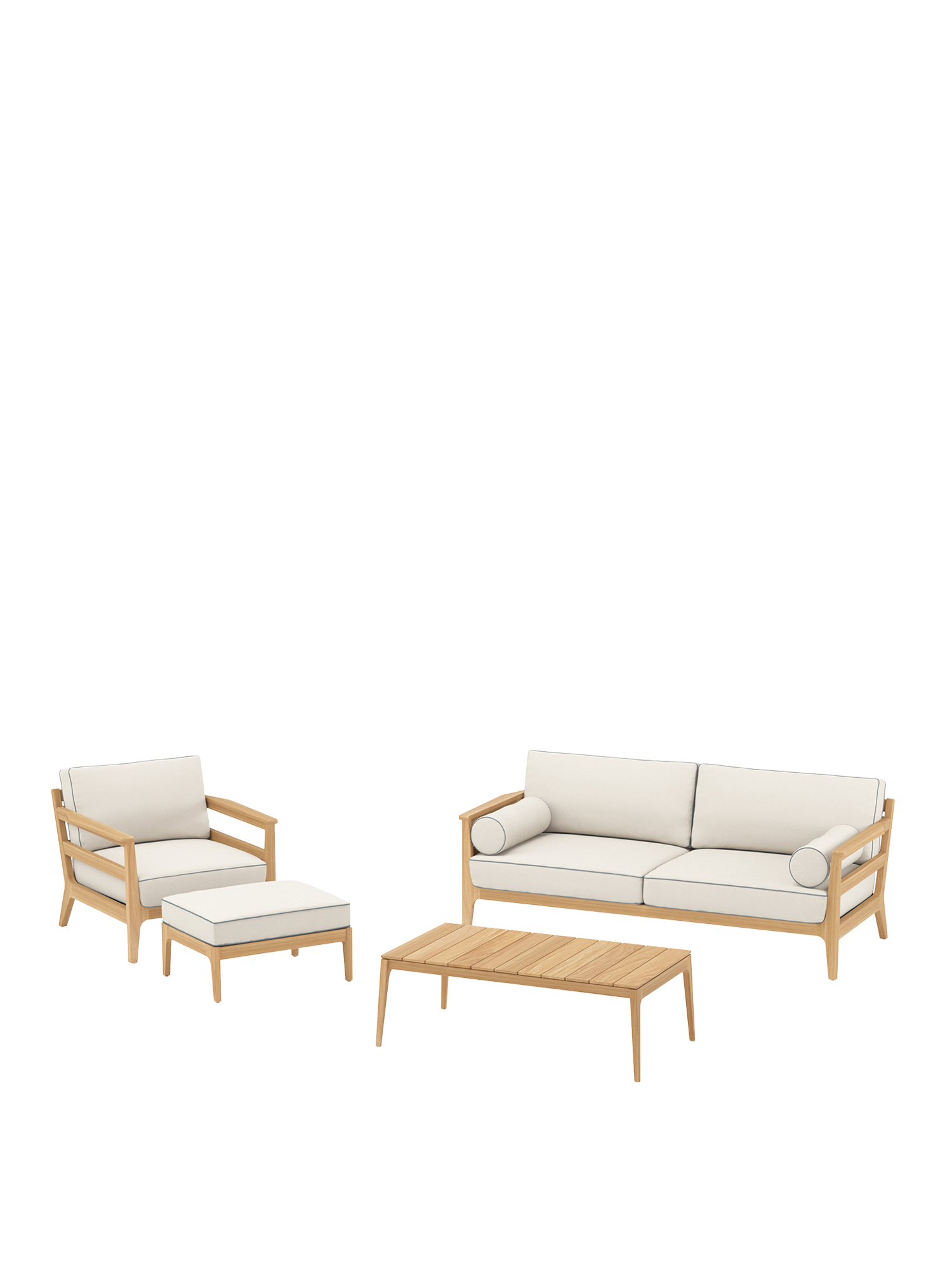 Die Polstermöbel der Newhaven Kollektion mit einem Rahmen aus hochwertigem Teakholz überzeugen unabhängig von ihrer Umgebung. Ob im Garten, auf der Terrasse oder im Wintergarten platziert – die aufwendig verarbeiteten Keder als markantes Merkmal ziehen stets die Blicke auf sich. Als überaus praktischer Mittelpunkt der Lounge Gruppe dient der Couchtisch.