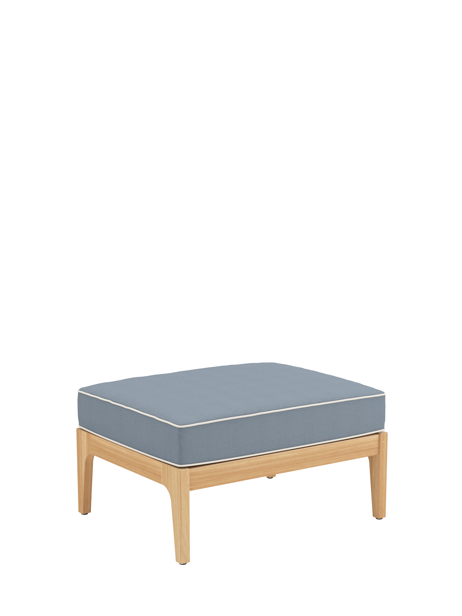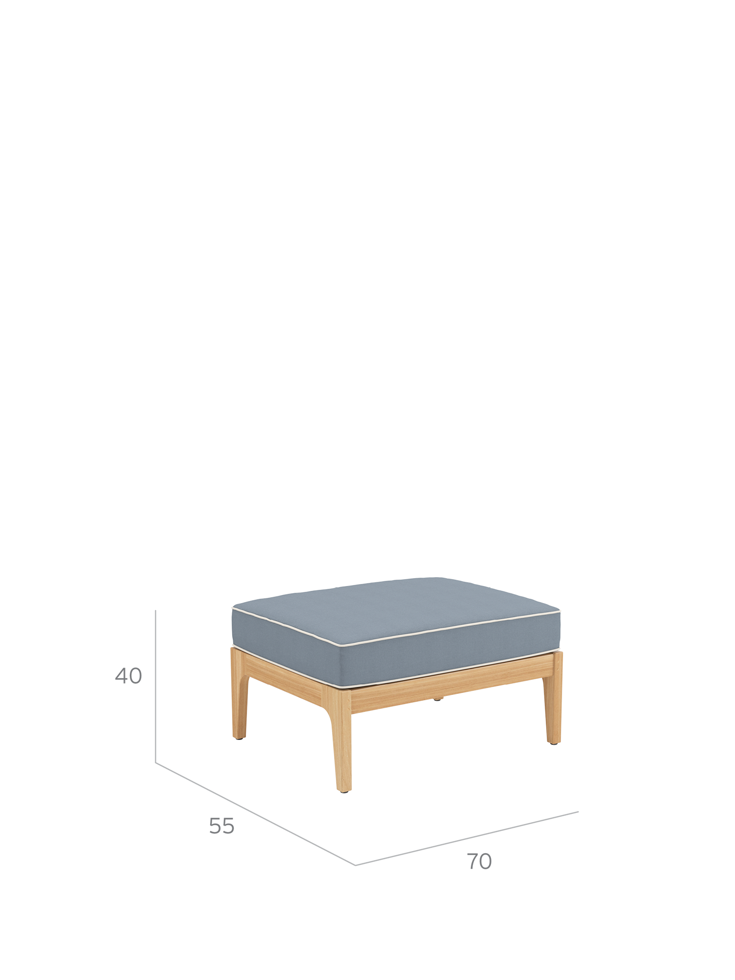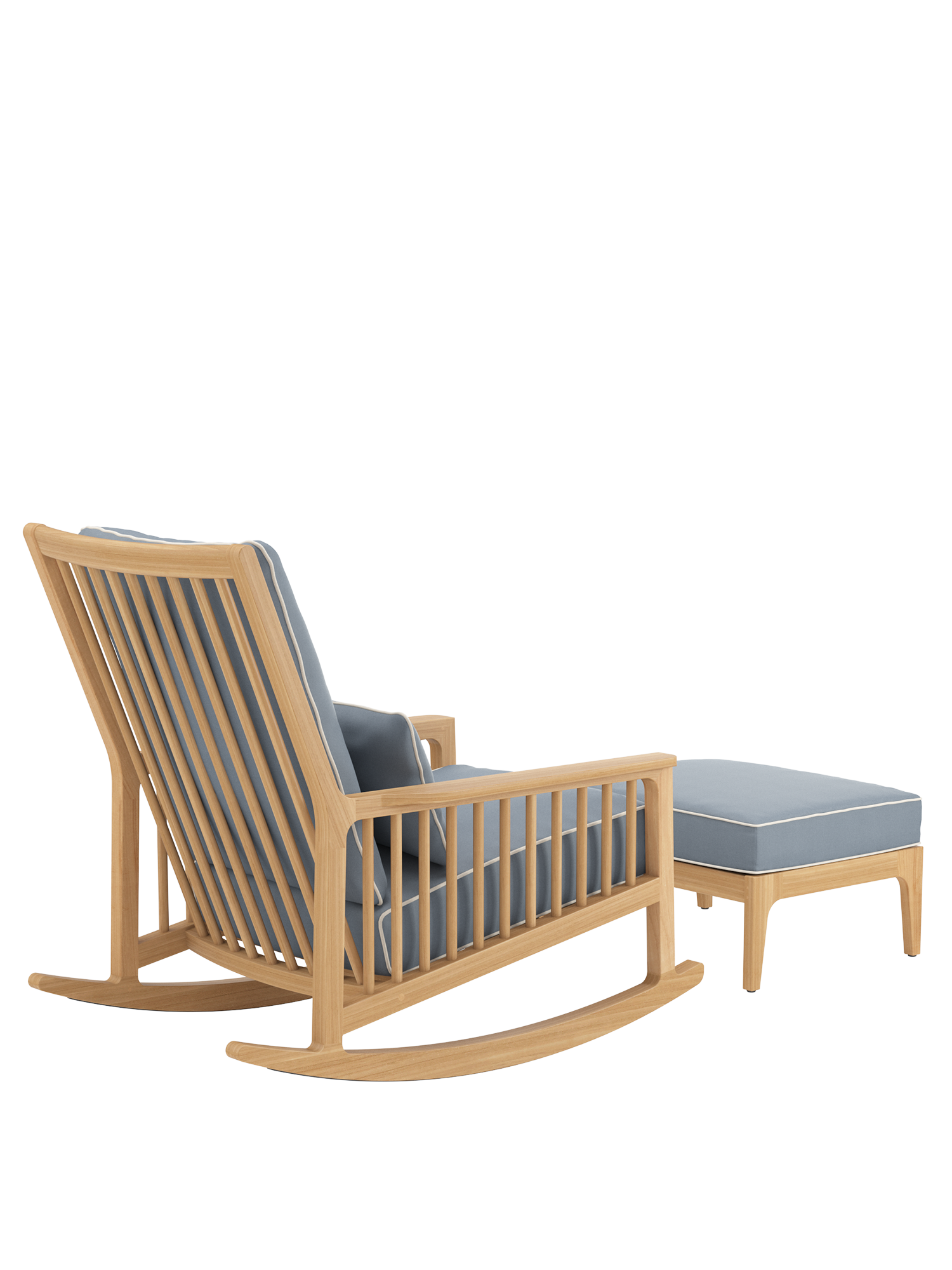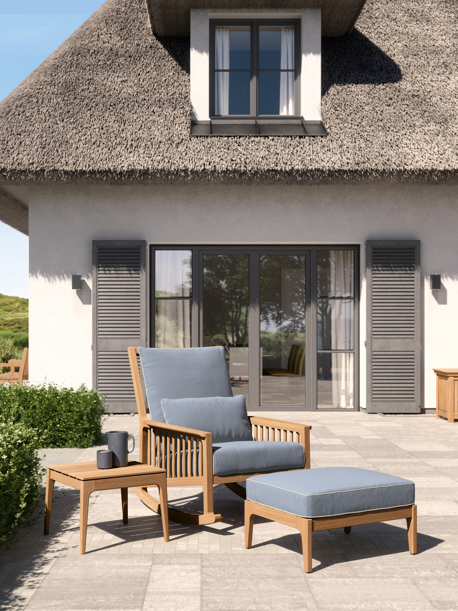Mit schulterhohem Rücken ist er zum Anlehnen geschaffen. Kurz Schwung holen und sich auf eleganten Teakkufen wiegen – in den traumhaft weichen Polstern des Schaukelstuhls aus hochwertigem Teakholz versinkt man gern. Eine unter seinen Kufen angebrachte schmale Kunststoffschiene schützt empfindliche Böden. Der passende Hocker lädt ein, die Beine hochzulegen.