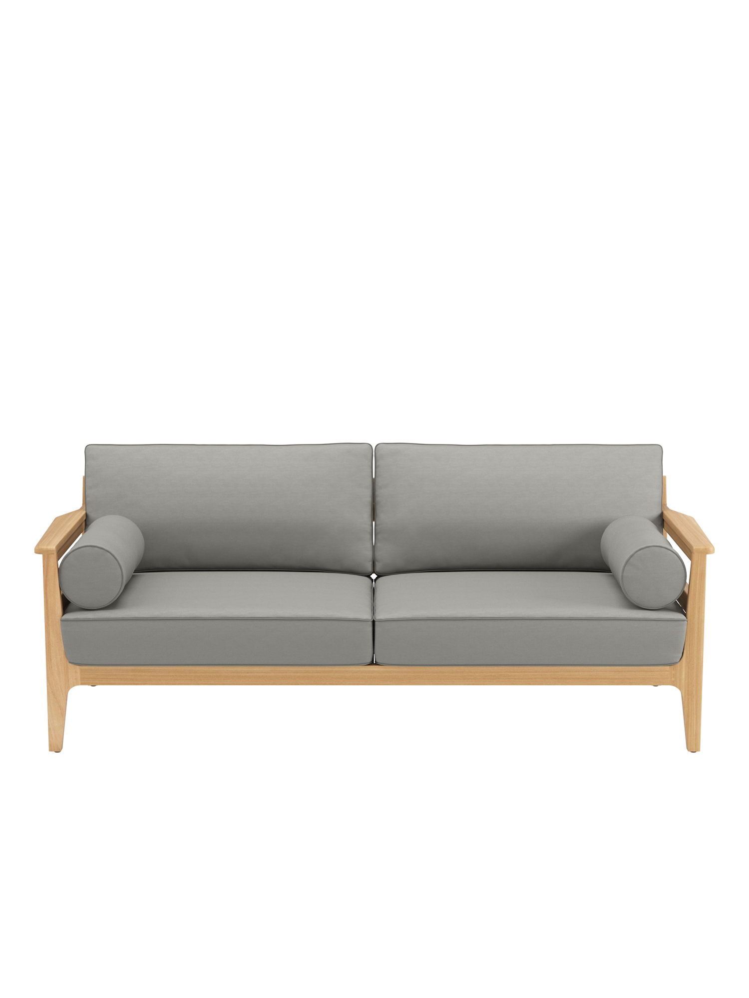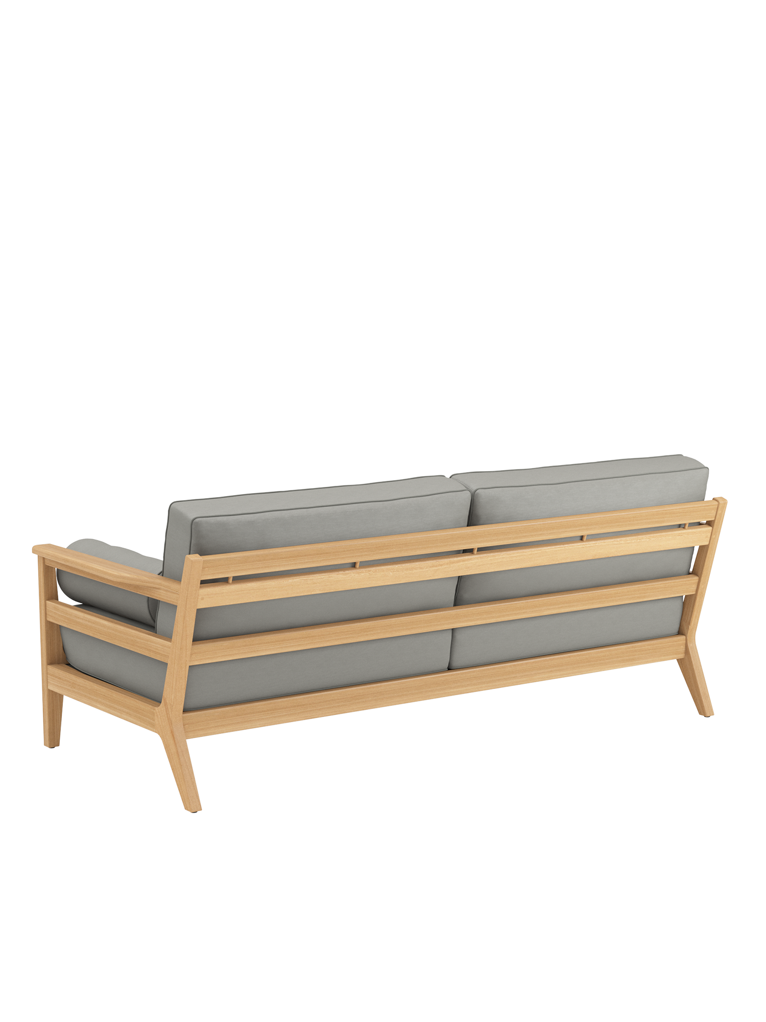 In die großzügigen Polstermöbel im Loungeformat zieht man sich gerne zurück. Ihre Rahmen sind aus hochwertigem Plantagenteakholz gefertigt, die Sitzflächen mit einem Gewebe bespannt, das die komfortablen Polster sicher trägt. Als markantes Merkmal verleihen aufwendig verarbeitete Keder dem klassischen Refugium seine maritime Anmutung. Alle Kissen sind farbig umrandet, auch die Polsterrollen, die den Sofas als Armlehnen dienen.