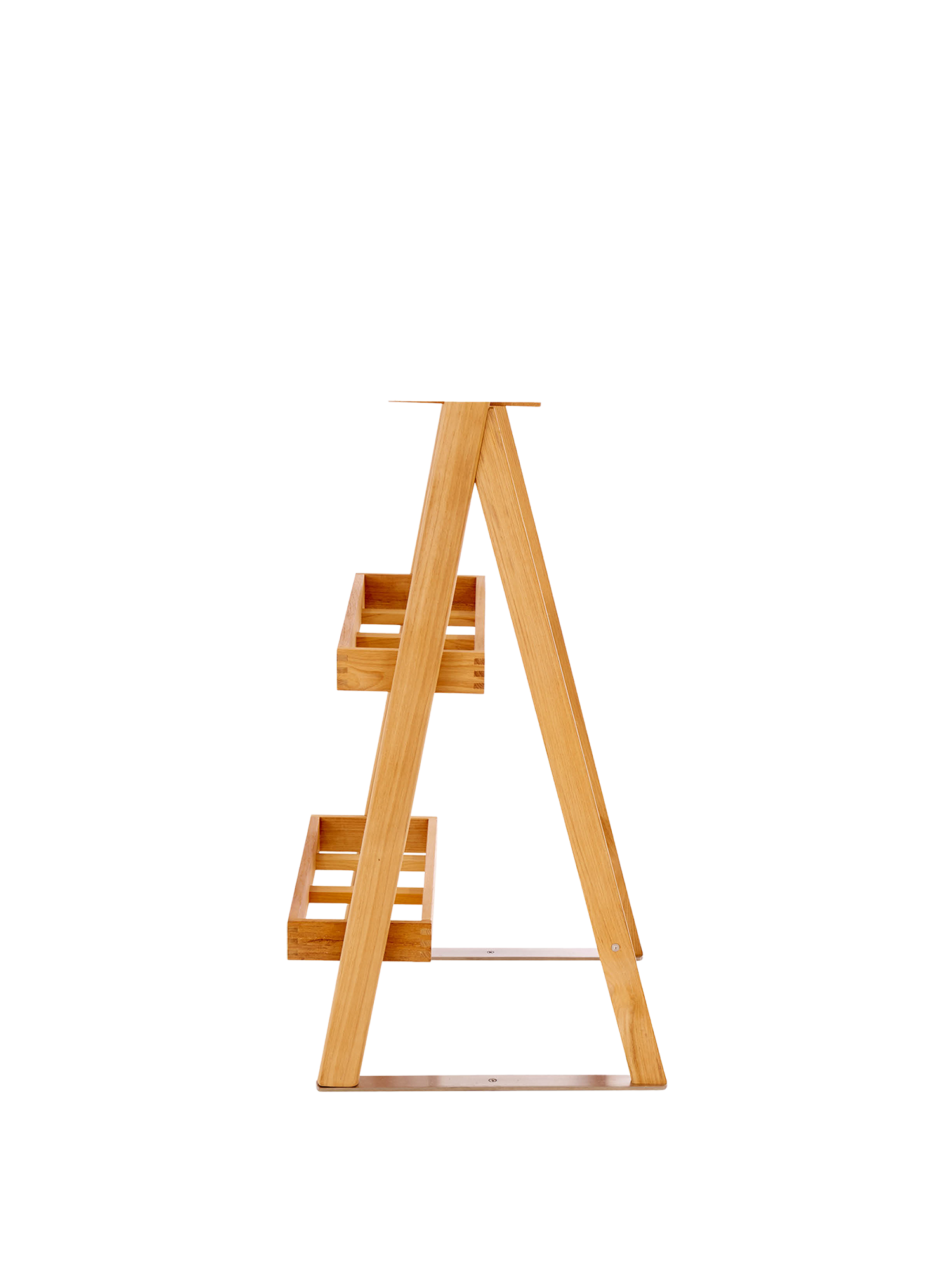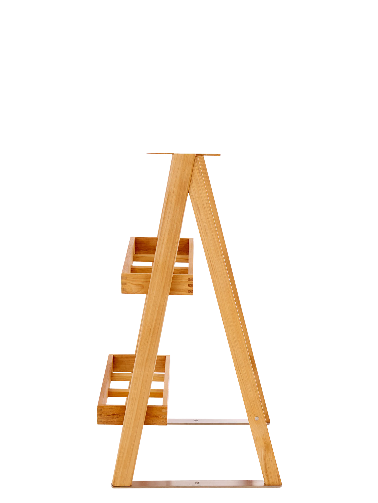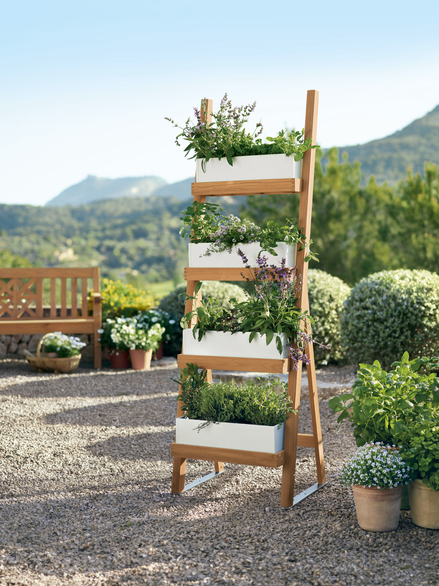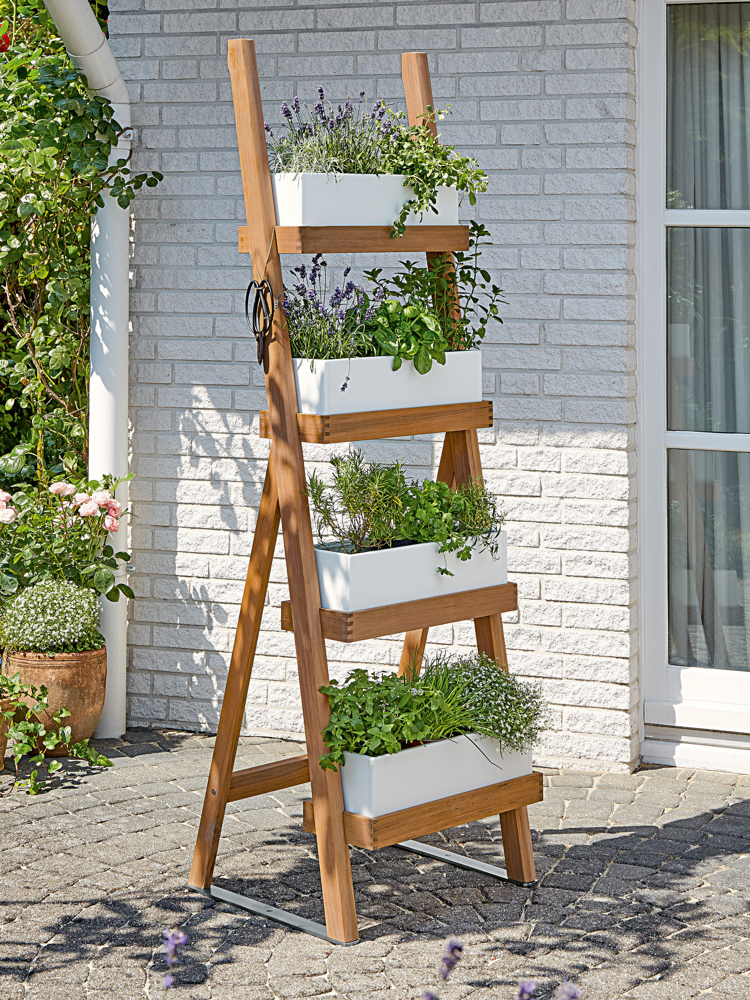 Das Aufstellset für die Normandie Kräuterleiter besteht aus einem Aufstellbügel aus Teakholz sowie zwei Edelstahlschienen, die fest mit dem Untergrund verschraubt werden können.