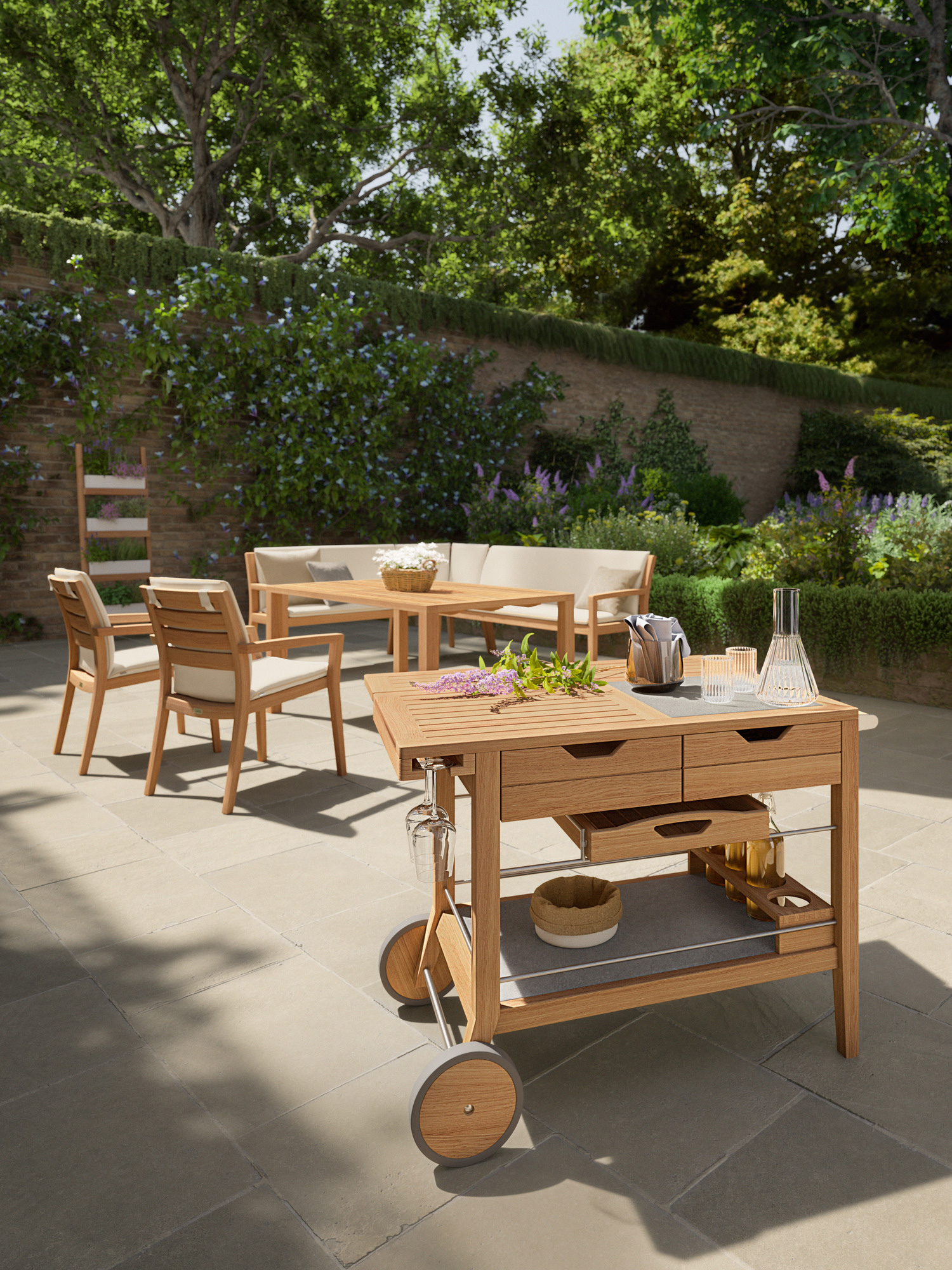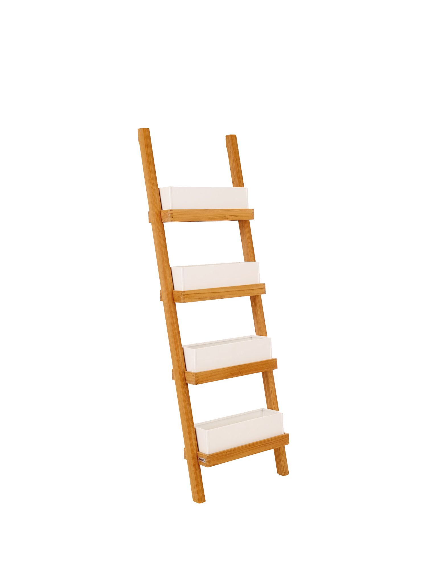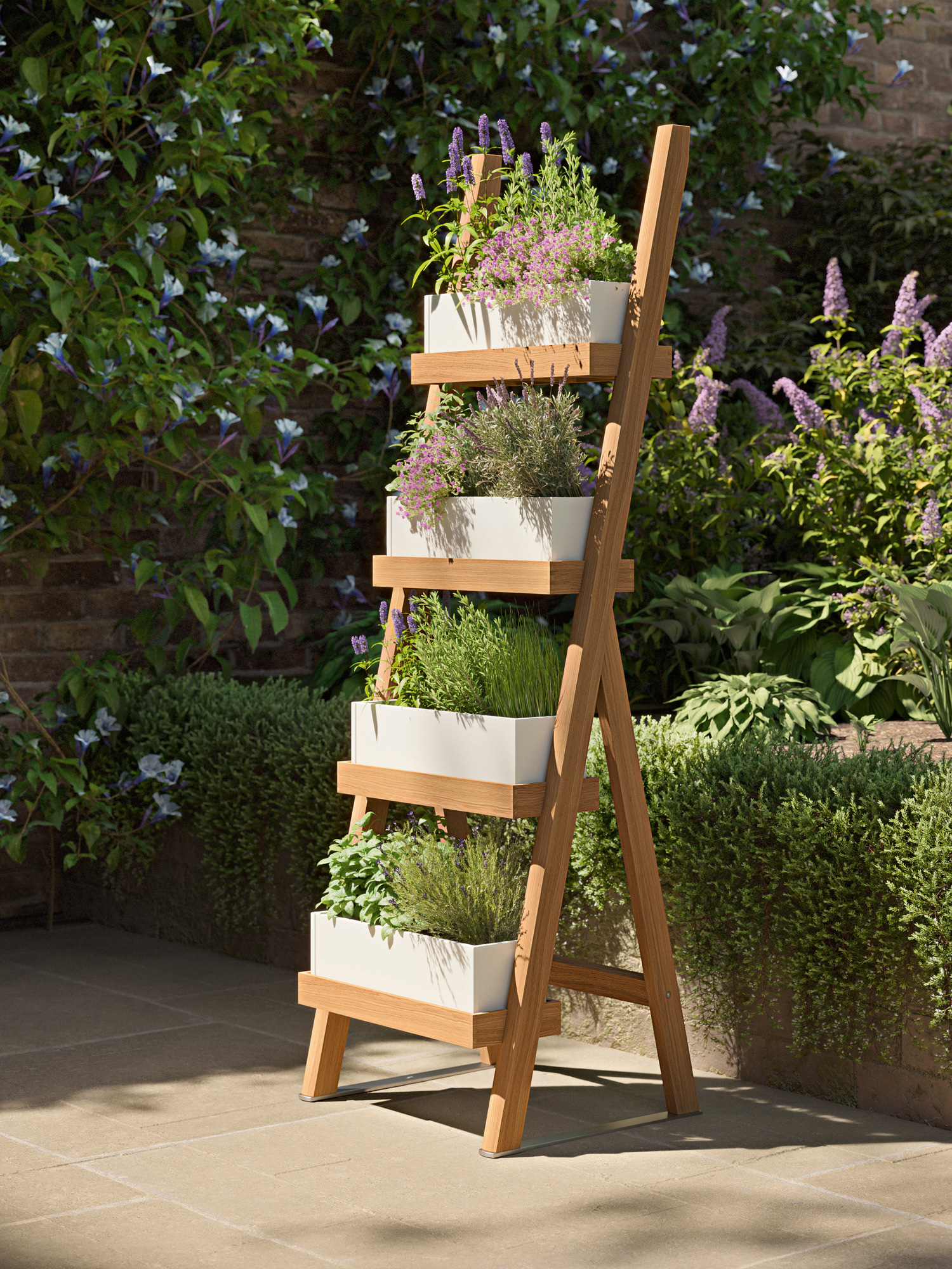 Für passionierte Stadt- und Balkongärtner eröffnet sich mit der Pflanzleiter aus wetterfestem Teak eine neue Dimension. In den vier mitgelieferten Pflanzkästen aus weiß pulverbeschichtetem Aluminium lassen sich Basilikum, Minze oder Schnittlauch ziehen - und pflückfrisch ernten. Die Kästen sind mit jeweils vier Löchern versehen, durch die das Wasser nach dem Gießen oder einem Regenschauer ablaufen kann. Passende Verschlüsse für die Abzugslöcher liefern wir mit.