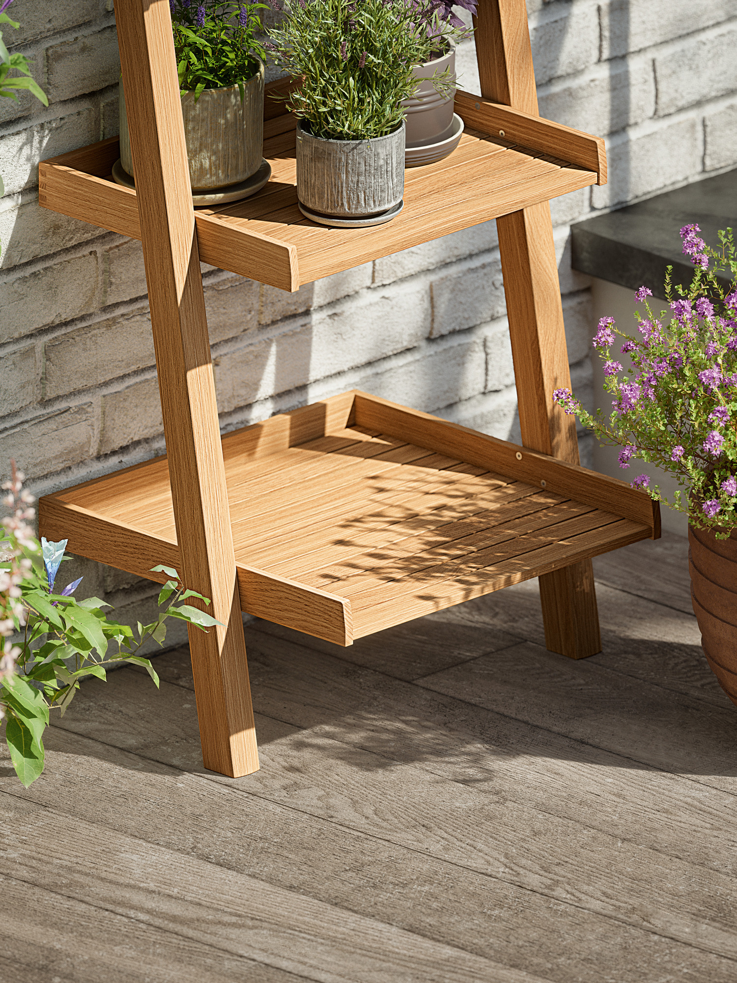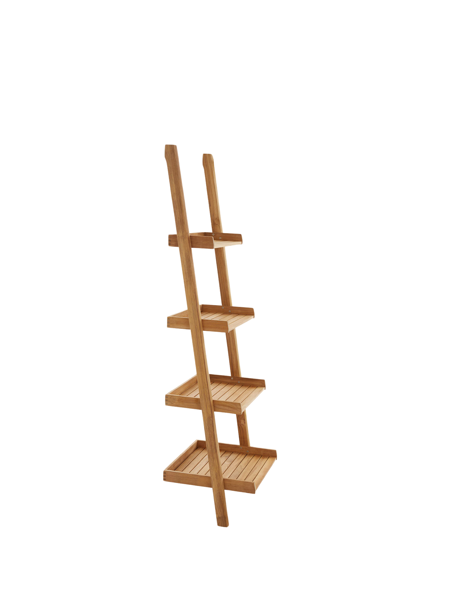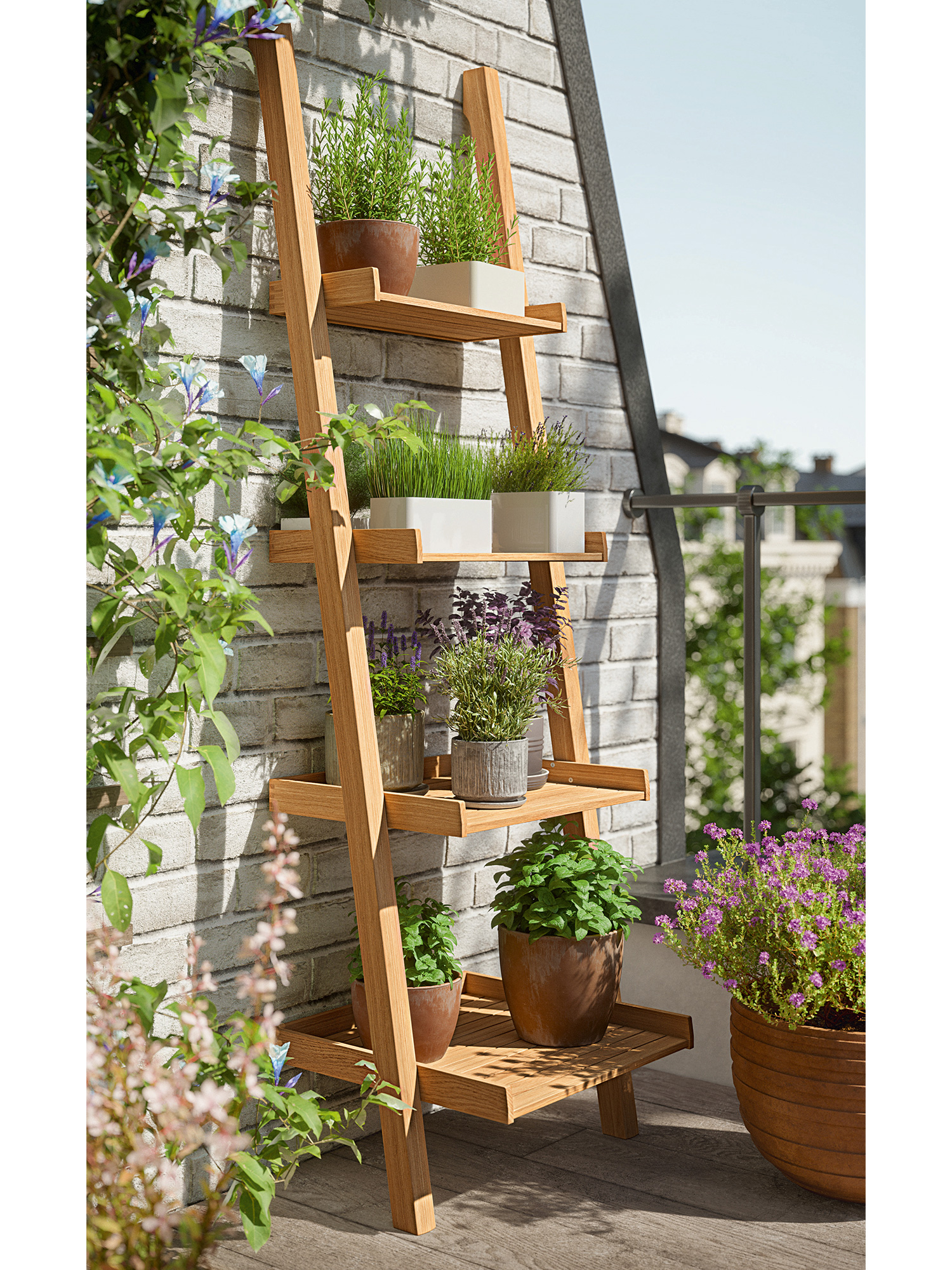 Das Regal aus witterungsbeständigem Teakholz trotzt allen Wetterlaunen. Es lehnt draußen an der Hauswand, trägt Windlichter und Kräutertöpfe, schafft Platz für Gießkanne und Gartenutensilien oder präsentiert die zur Jahreszeit passende Dekoration. Seine vier Fächer werden von oben nach unten tiefer; mit Kanten an drei Seiten wirkt jeder Regalboden fast wie ein Tablett. Die Pfosten sind an den Stirnseiten gerundet, die Regalböden bestehen aus eng stehenden Teakleisten – weitere Zeichen besonders hochwertiger Verarbeitung.