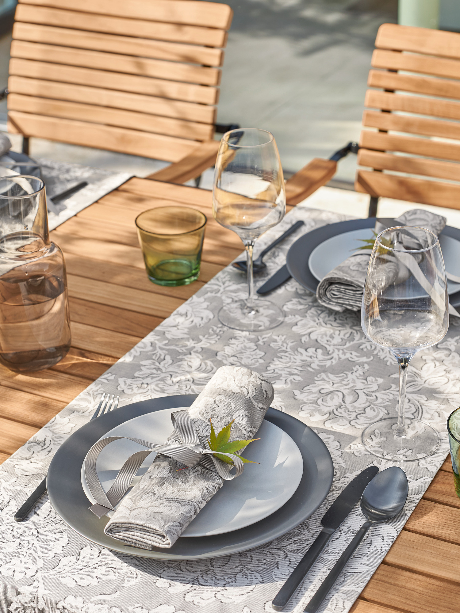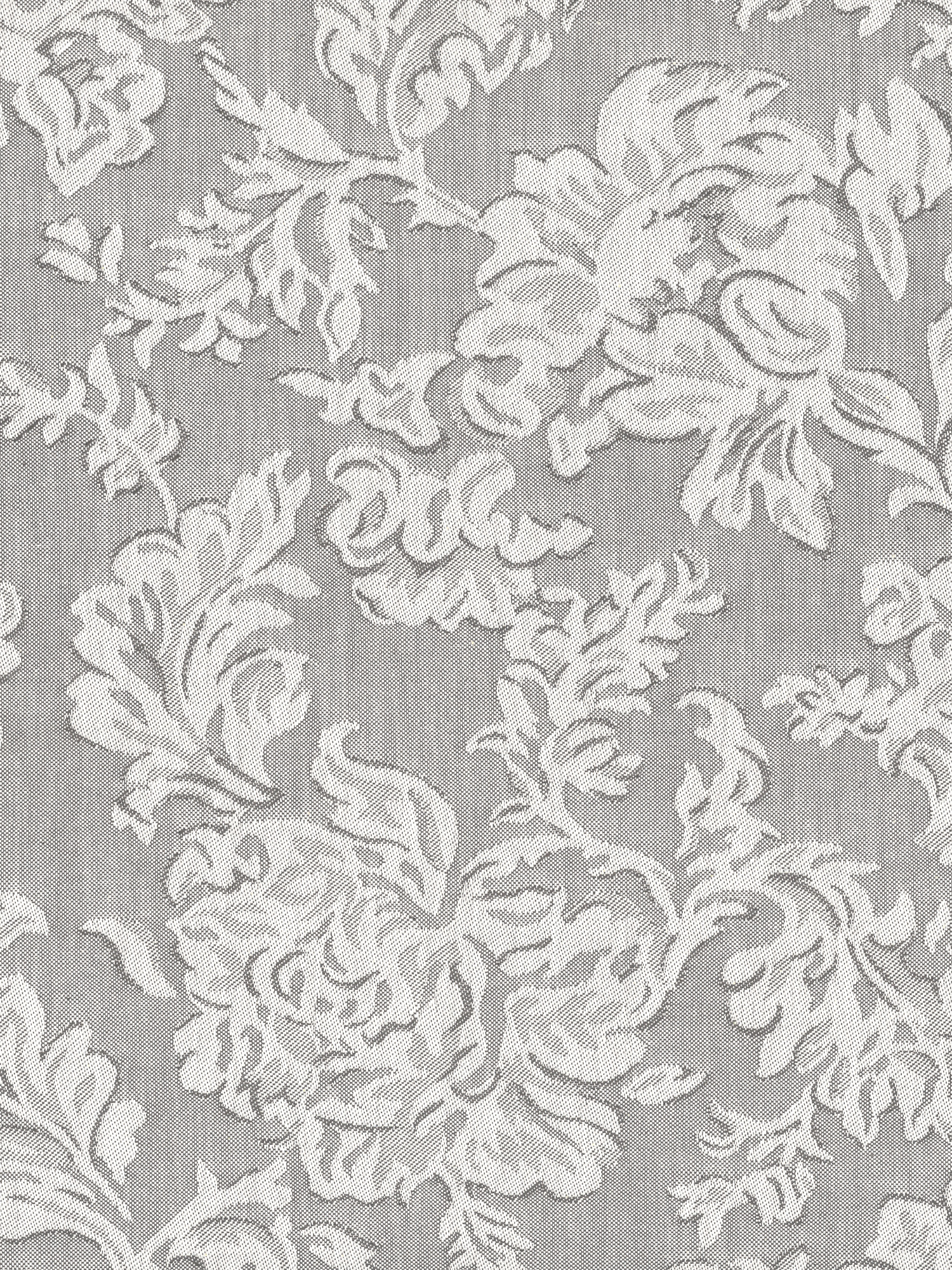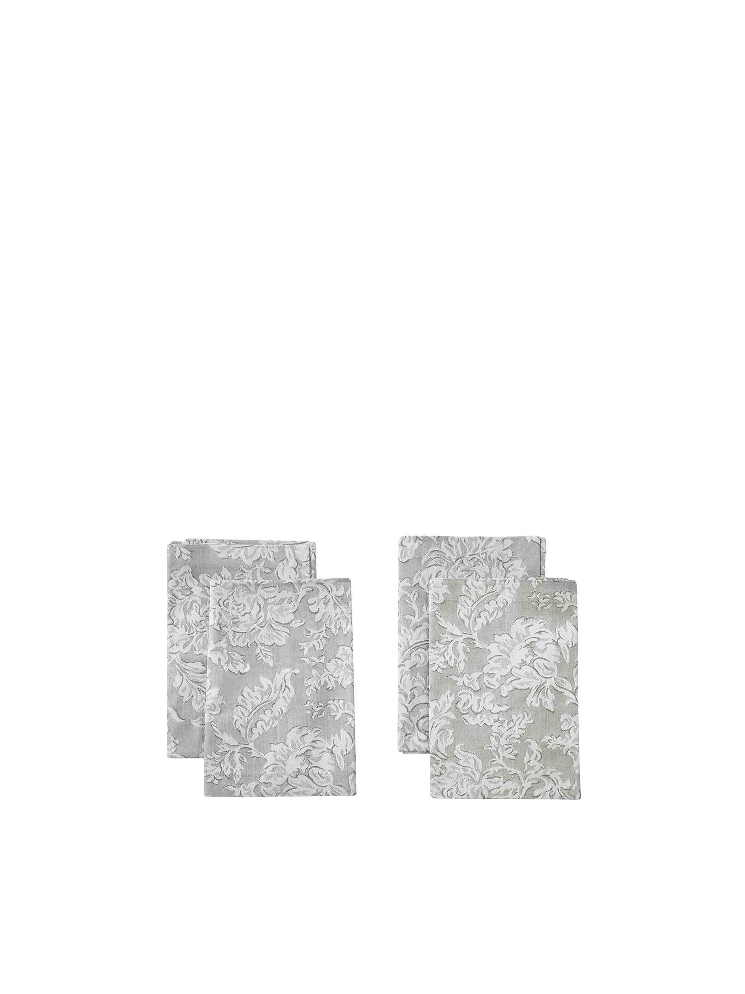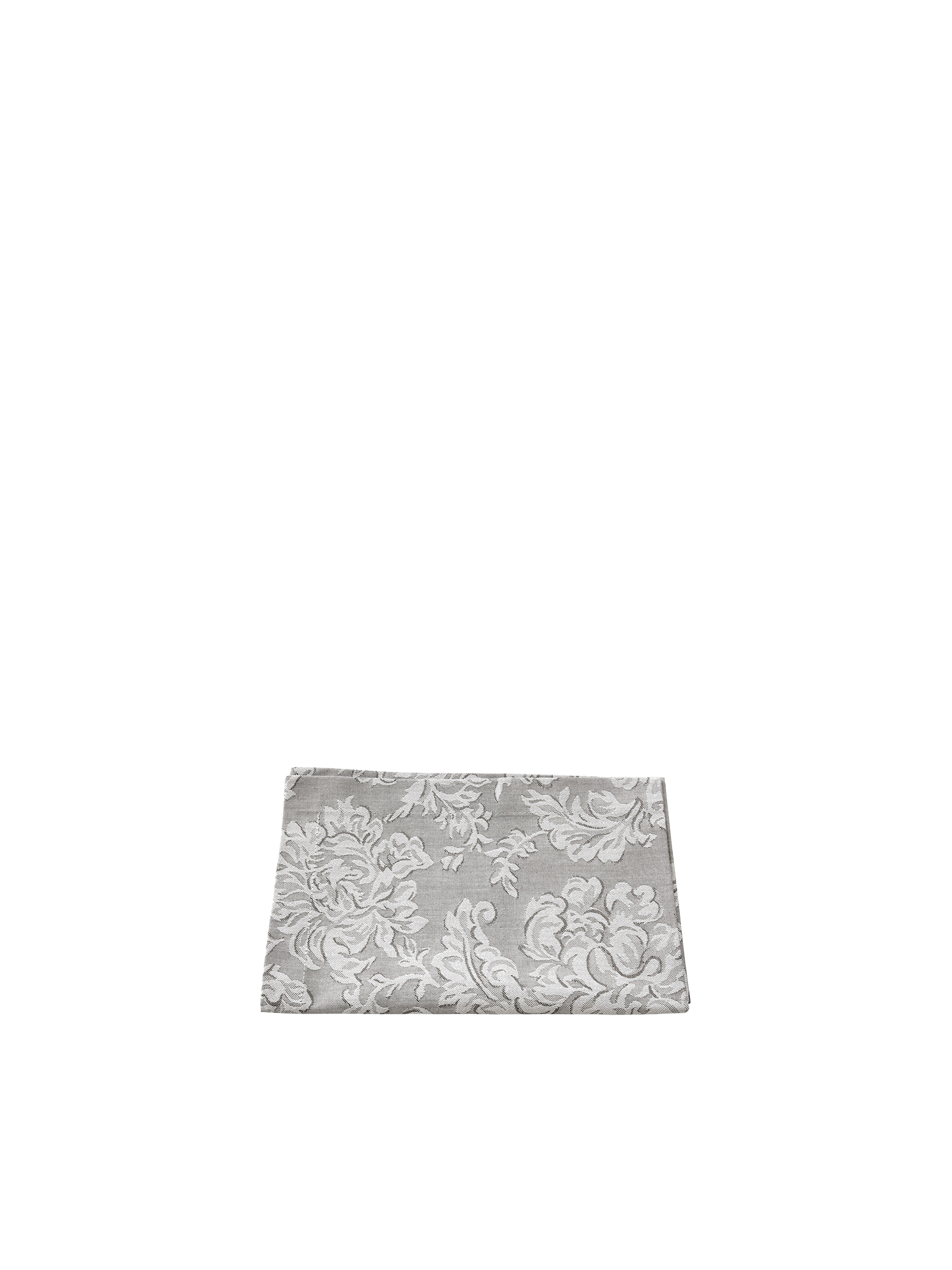 Hellgraue Blüten und Blätter mit dunkelgrauen Akzenten ranken über einen romantisch schimmernden mittelgrauen Grund. Die Servietten aus kostbarem italienischem Baumwoll-Jacquard setzen Glanzlichter auf die Tafel.