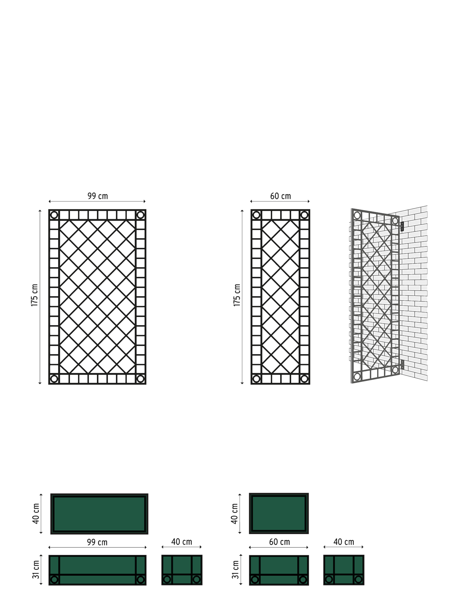 Ein Sichtschutz, der rankt und blüht und mit seinem schönen Rautenmuster auch im Winter eine Augenweide ist: Die Kletterhilfen und Pflanzkübel der Orangerie sind in zwei Breiten erhältlich. Während die Pflanzkübel einzeln verwendet werden können, müssen die Rankelemente von hinten an die Kübel geschraubt oder freistehend zwischen ihnen befestigt werden. Das Material besteht aus wetterfestem Aluminium, das schwarzgrün pulverbeschichtet ist. Abzugslöcher im Boden verhindern Staunässe und vier Höhenversteller gleichen Bodenunebenheiten aus.