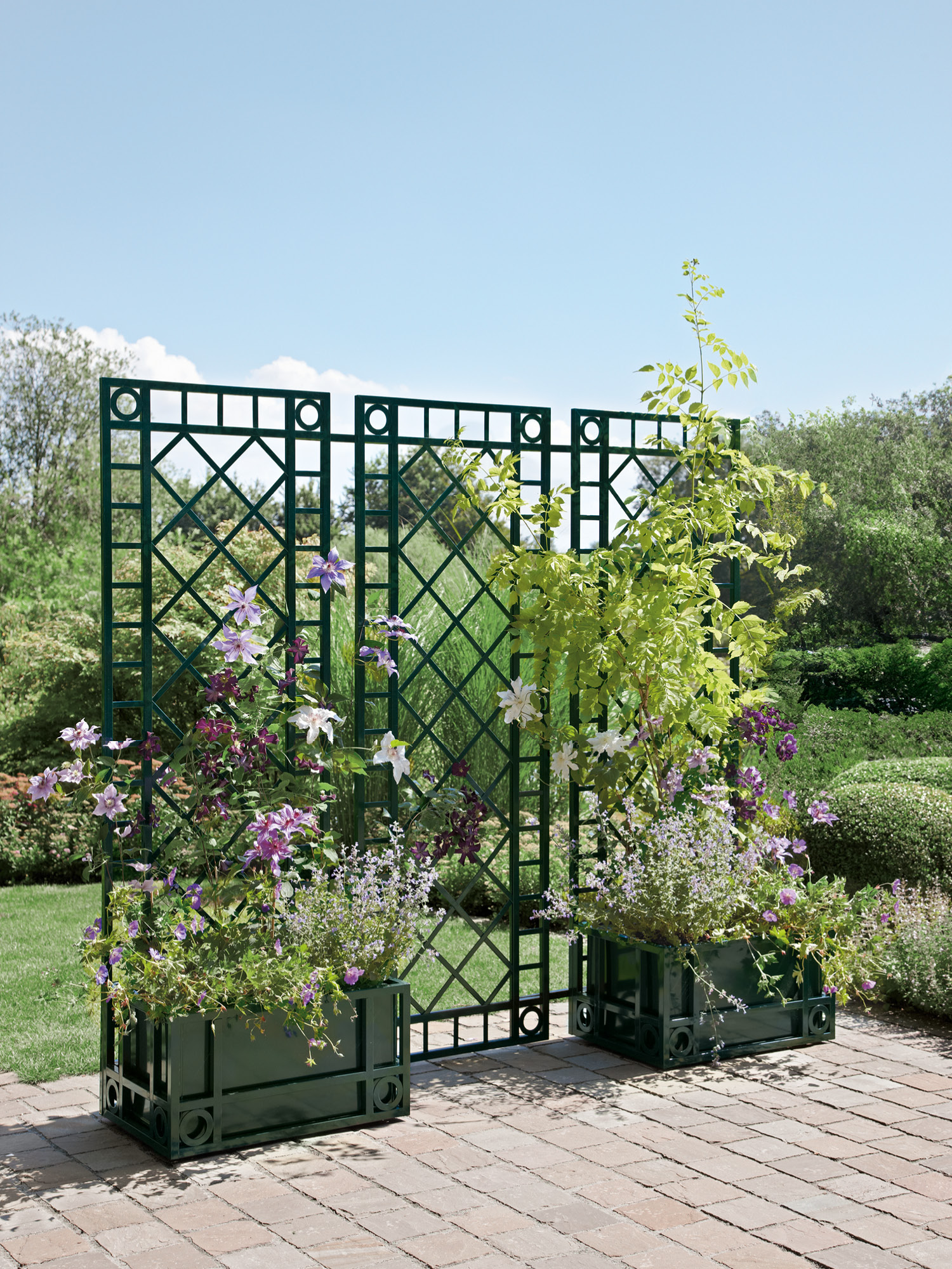 Ein Sichtschutz, der rankt und blüht und mit seinem schönen Rautenmuster auch im Winter eine Augenweide ist: Die Kletterhilfen und Pflanzkübel der Orangerie sind in zwei Breiten erhältlich. Während die Pflanzkübel einzeln verwendet werden können, müssen die Rankelemente von hinten an die Kübel geschraubt oder freistehend zwischen ihnen befestigt werden. Das Material besteht aus wetterfestem Aluminium, das schwarzgrün pulverbeschichtet ist. Abzugslöcher im Boden verhindern Staunässe und vier Höhenversteller gleichen Bodenunebenheiten aus.