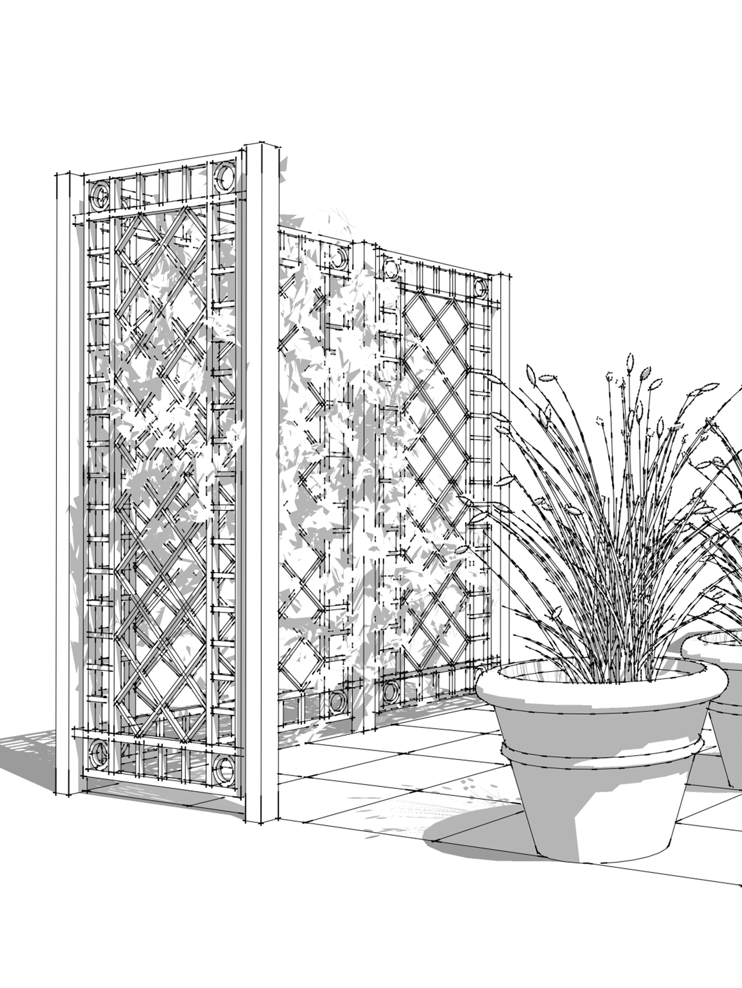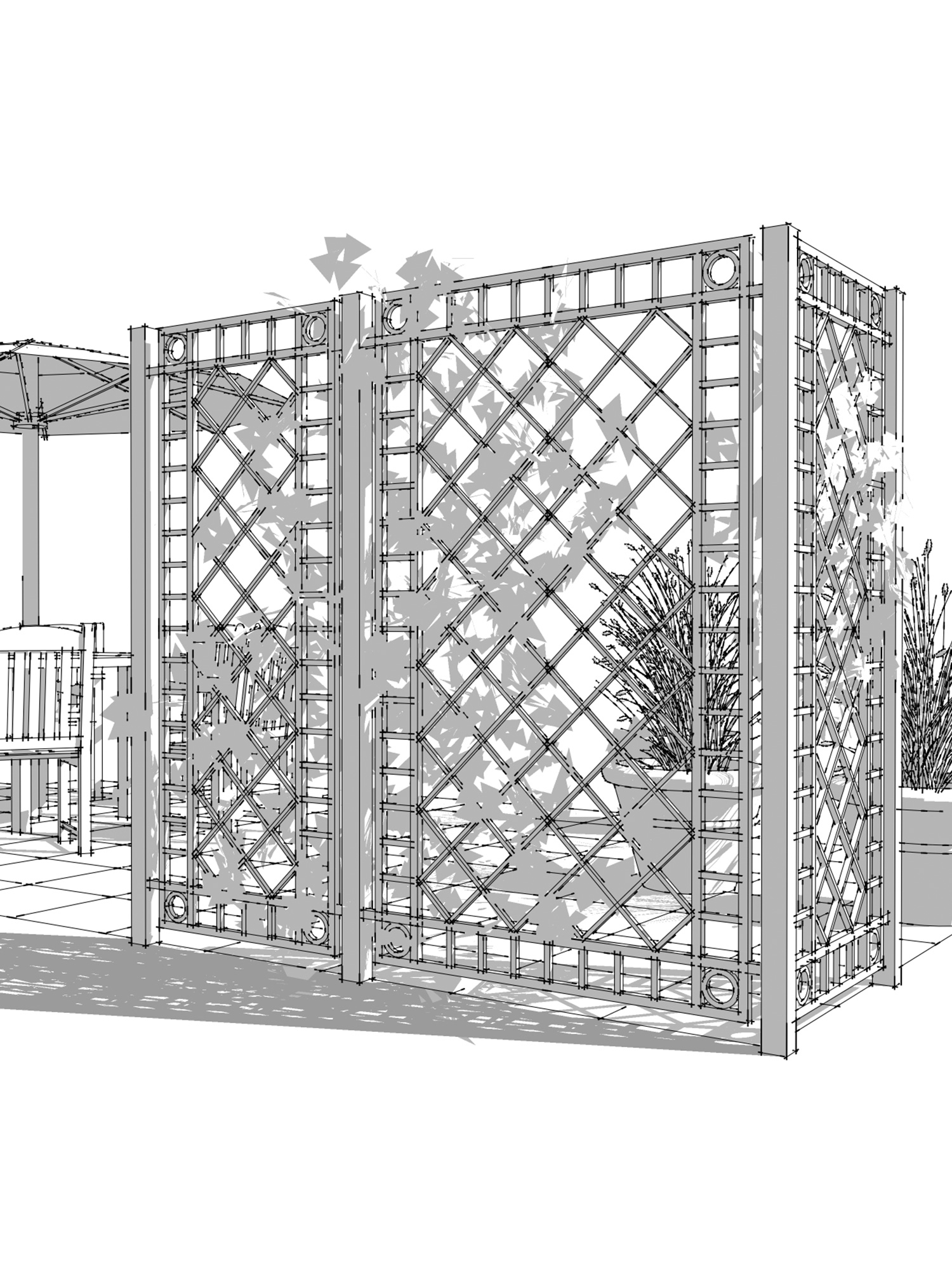 2. Fixierte Lösung mit 3 VariantenFür diese Lösung werden schmale oder breite Rankelemente durch Pfosten und verschiedene Verbindungsstücke zusammengefügt und fungieren so als Trennwand oder attraktive Abschirmung z.B. von Kompost oder Abfallbehältern.
