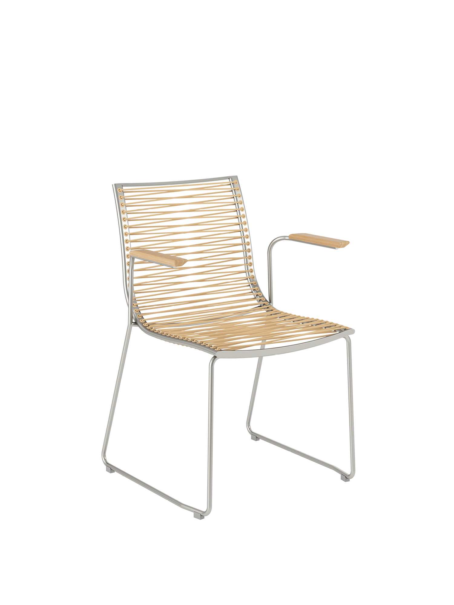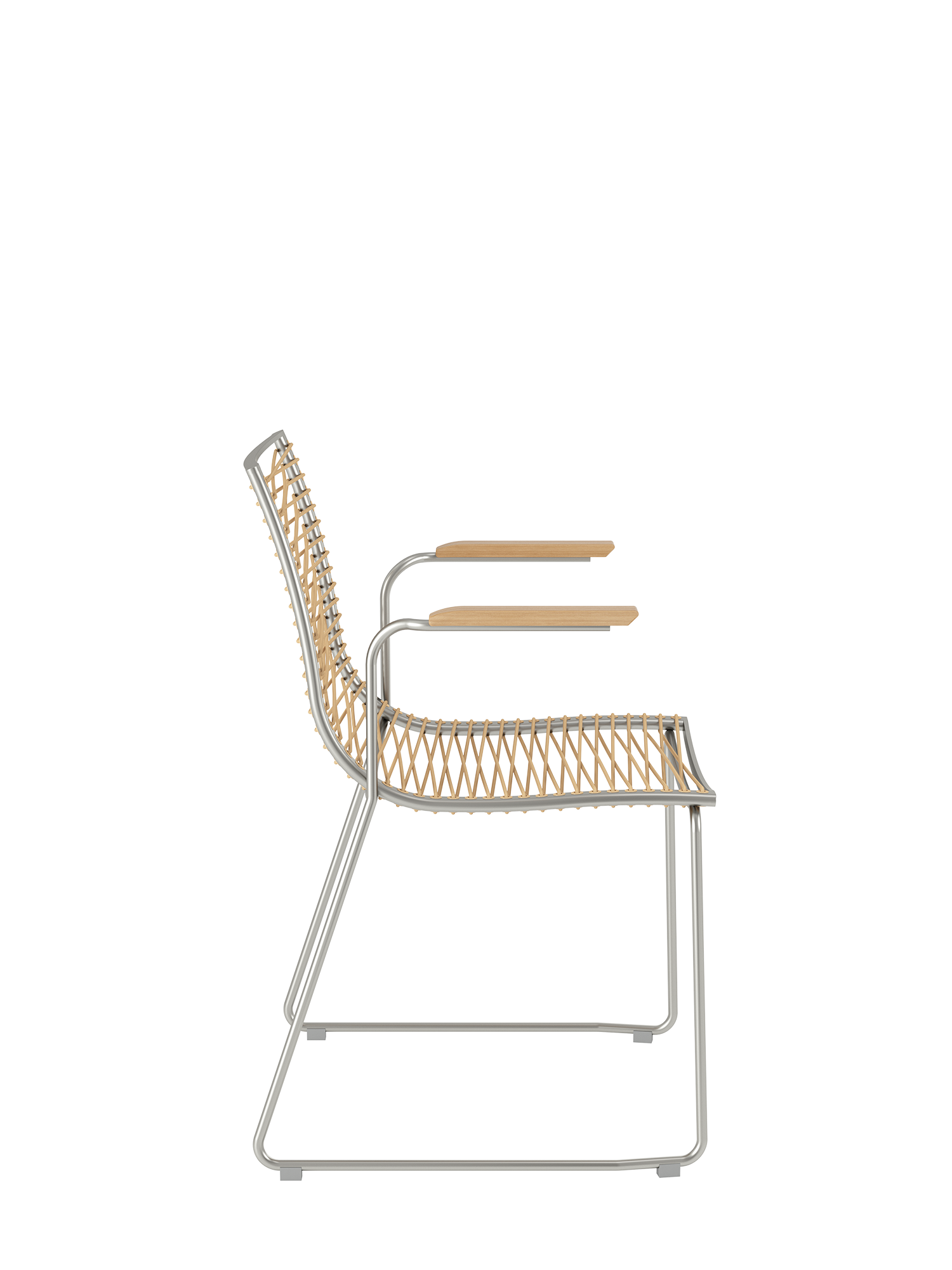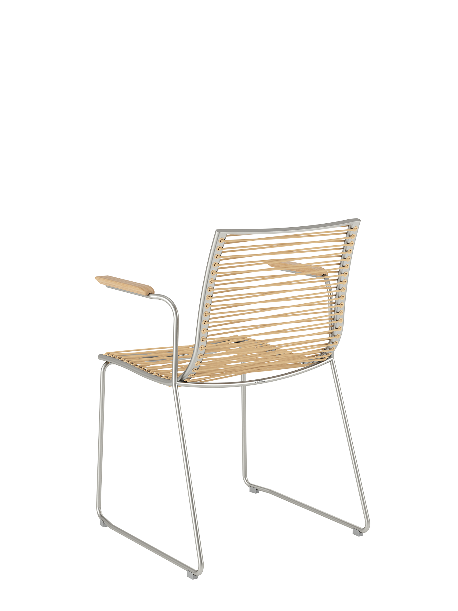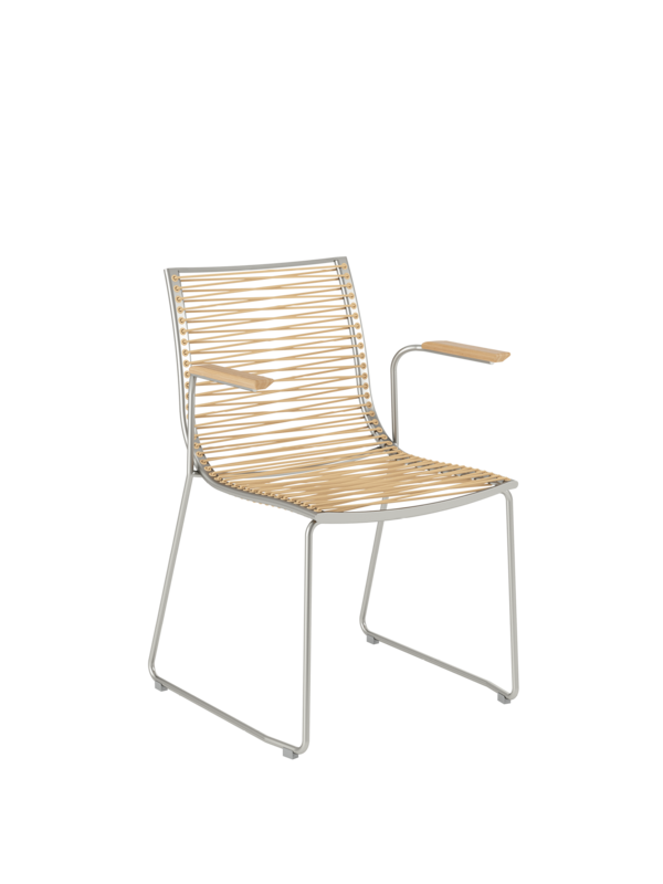 Pan wirkt luftig wie eine leichte Brise. Die eleganten, stapelbaren Stühle mit einem Edelstahlgestell sind mit einer dauerelastischen Faser bespannt, die sich bequem der Körperkontur anpasst.