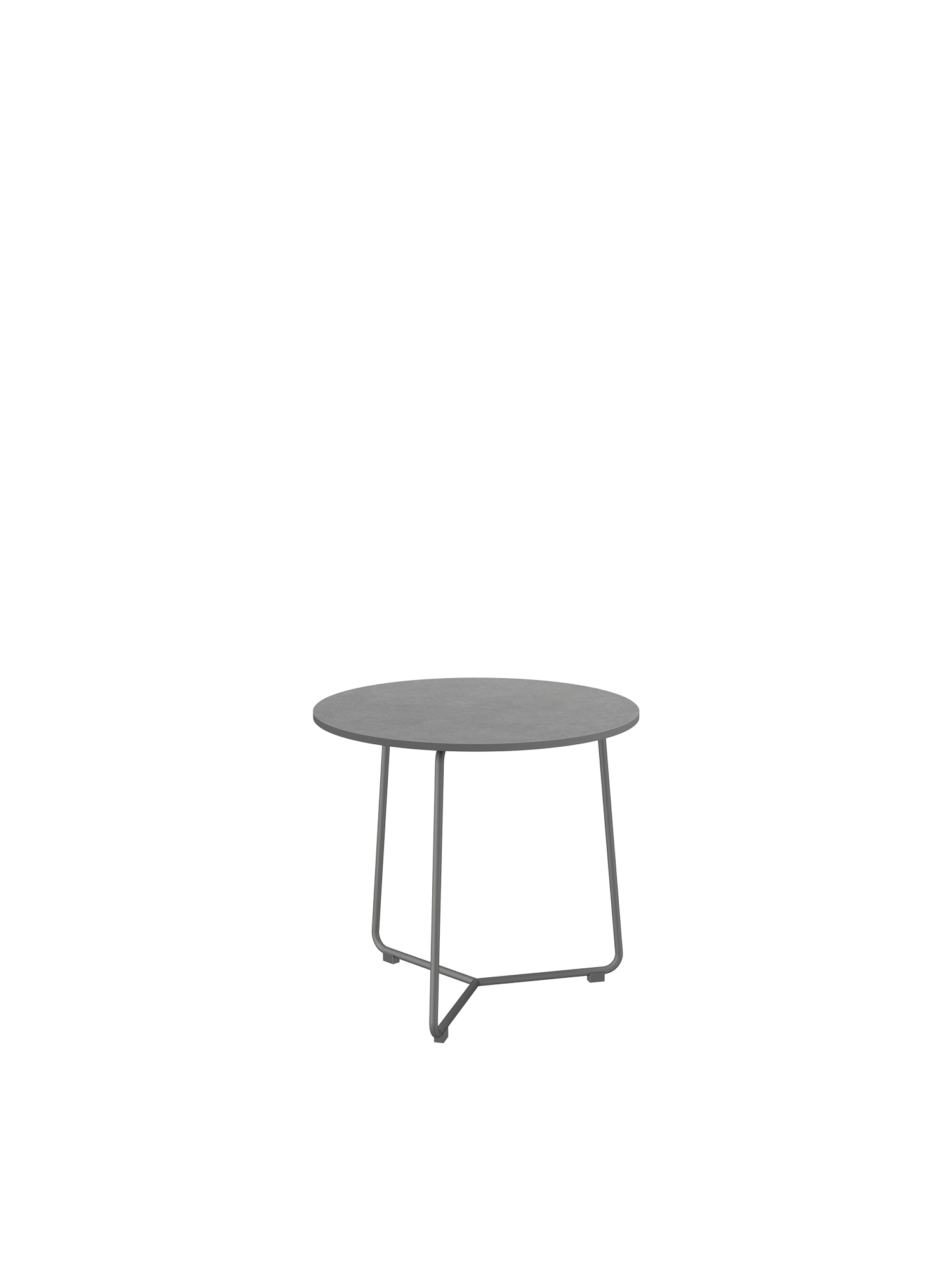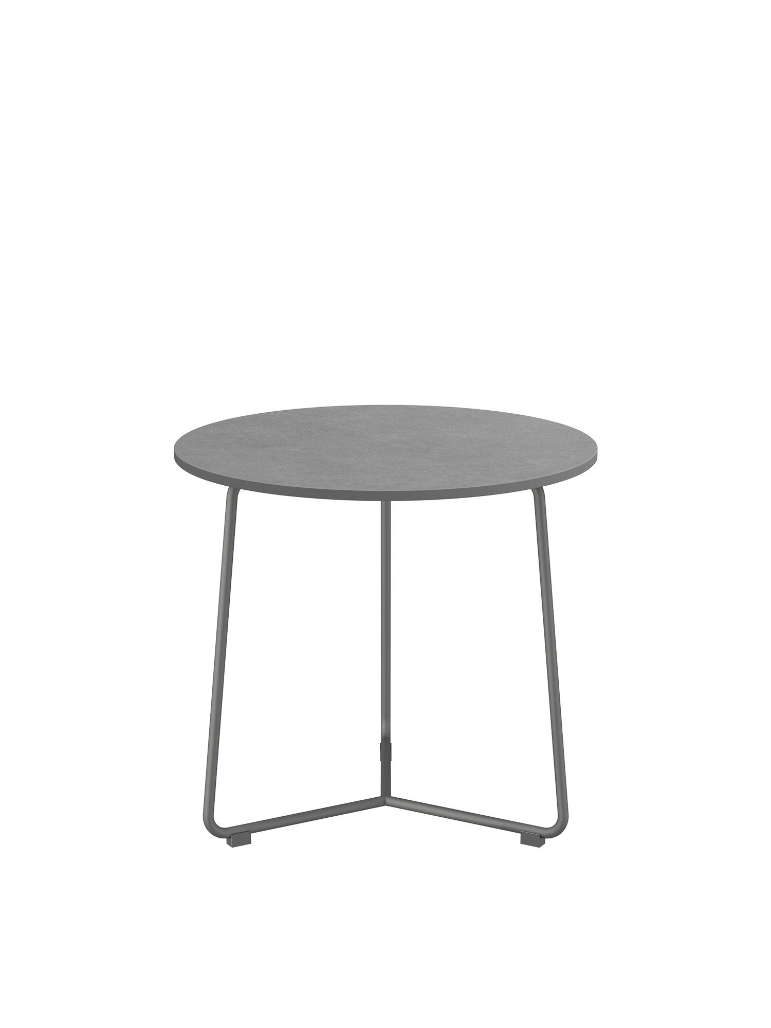 Der runde Beistelltisch mit einem Gestell aus graphitfarbenem Edelstahl trägt eine Platte aus Kunstharz in einem eleganten Grauton. Das hochwertige Material ist wetter- und UV-beständig.
