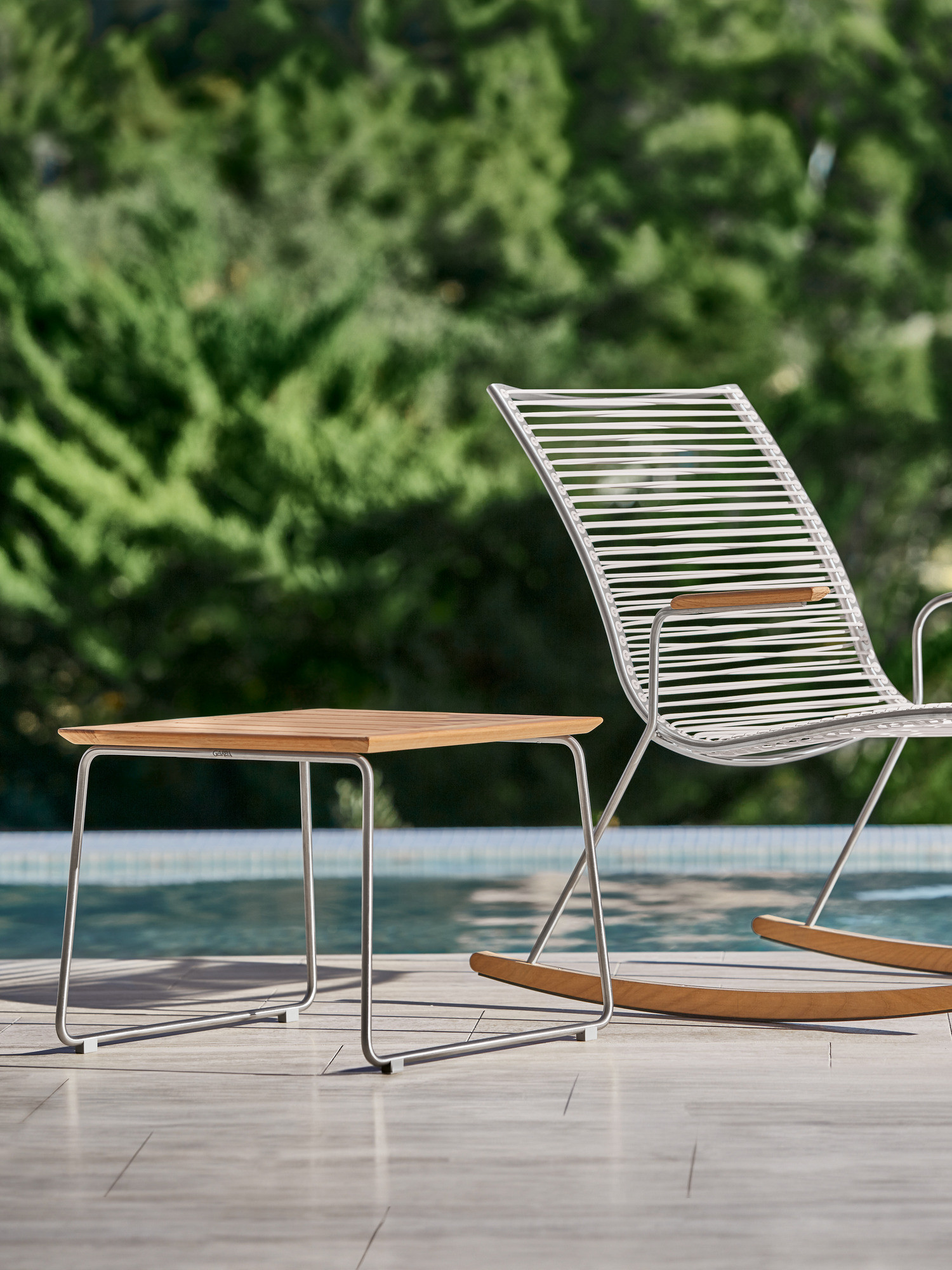 Der moderne Beistelltisch hat ein Gestell aus Edelstahl und eine Tischplatte aus Teakleisten.