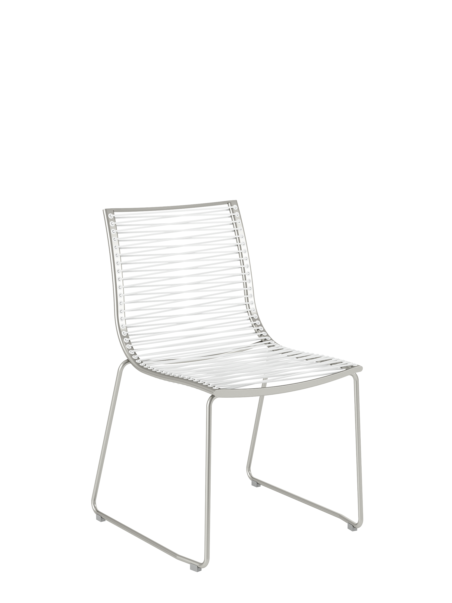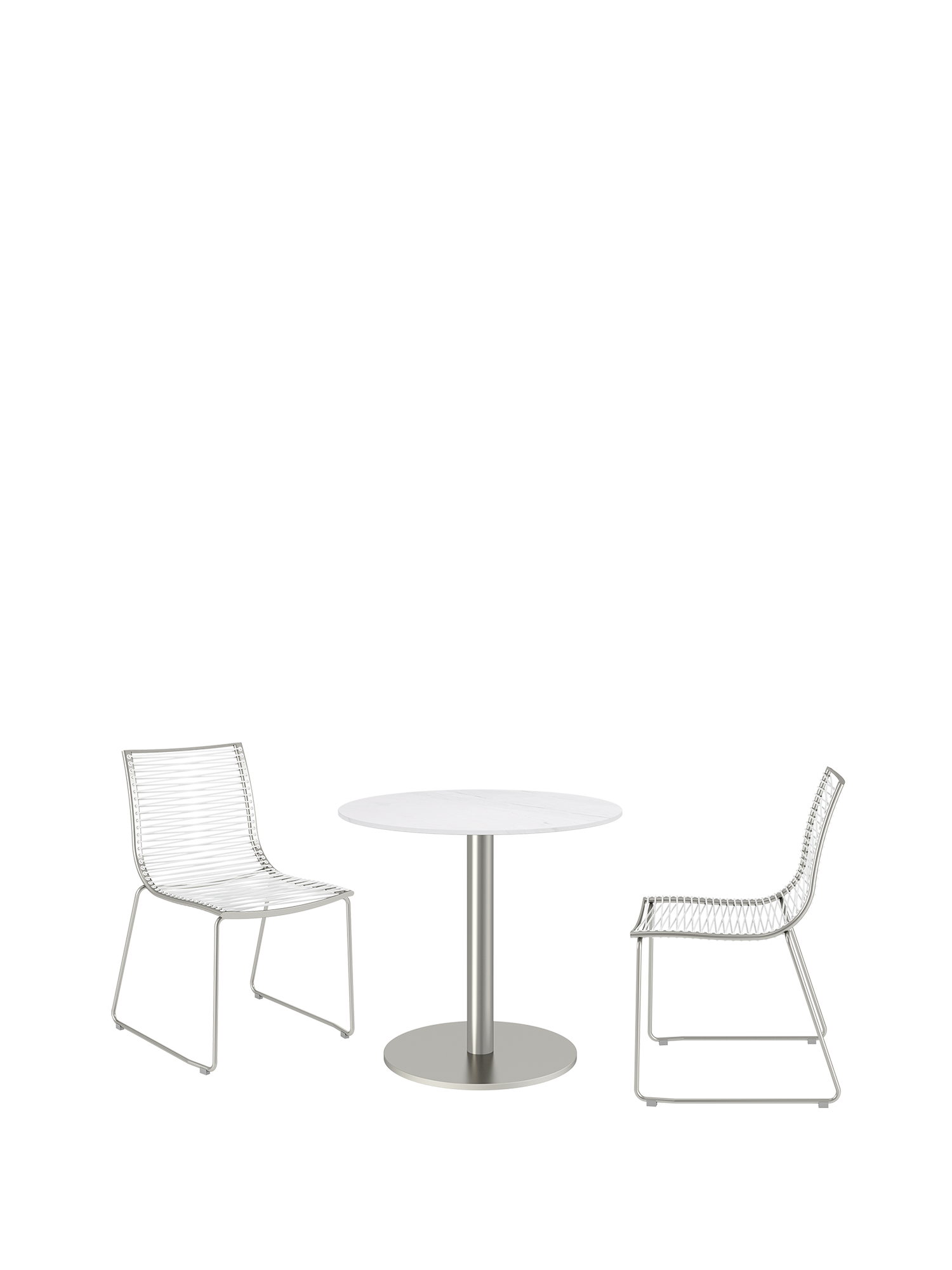 Pan wirkt luftig wie eine leichte Brise. Die stapelbaren Stühle haben Gestelle aus Edelstahl und sind mit einer dauerelastischen Faser bespannt, die sich bequem der Körperkontur anpasst. Der Ronda Mittelfußtisch kombiniert gebürsteten Edelstahl mit einer Oberfläche aus weißer Steinkeramik.
