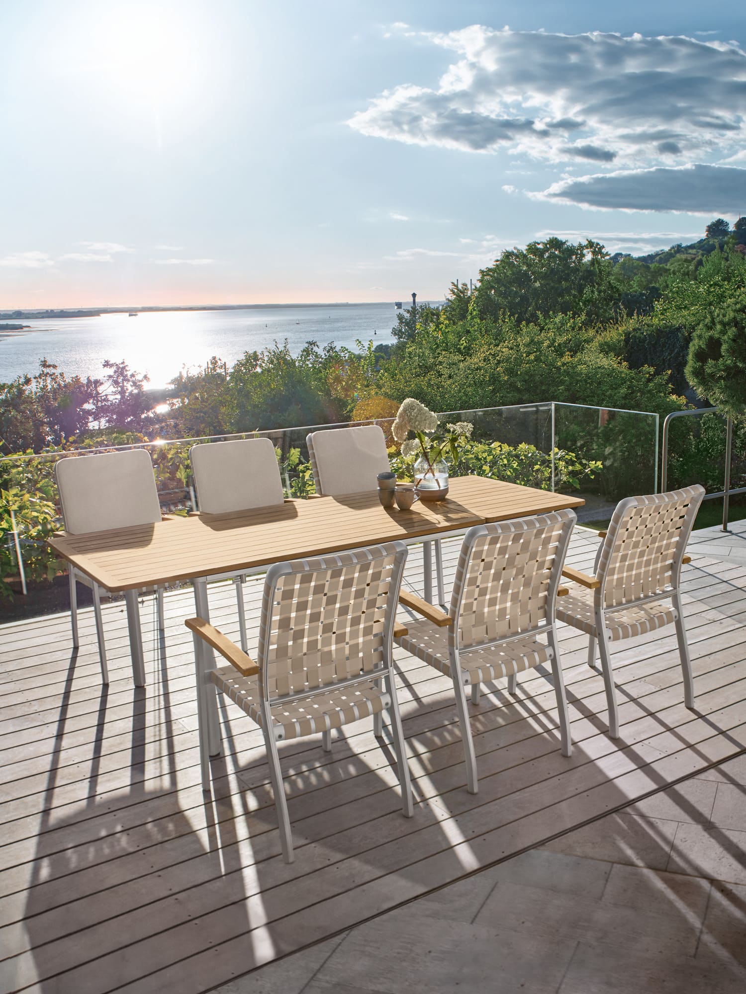 Eine umlaufende Zarge mit sanfter Rundung prägt das Design der vierbeinigen Portland Tische. Dabei lässt sie genügend Raum, um auch Stühle mit Armlehnen unter die Tischplatte zu schieben. Mit einer Tischoberfläche aus Teakleisten und einem Aluminiumgestell sind sie stilsichere Begleiter zu Stühlen der Serie Monterey.
