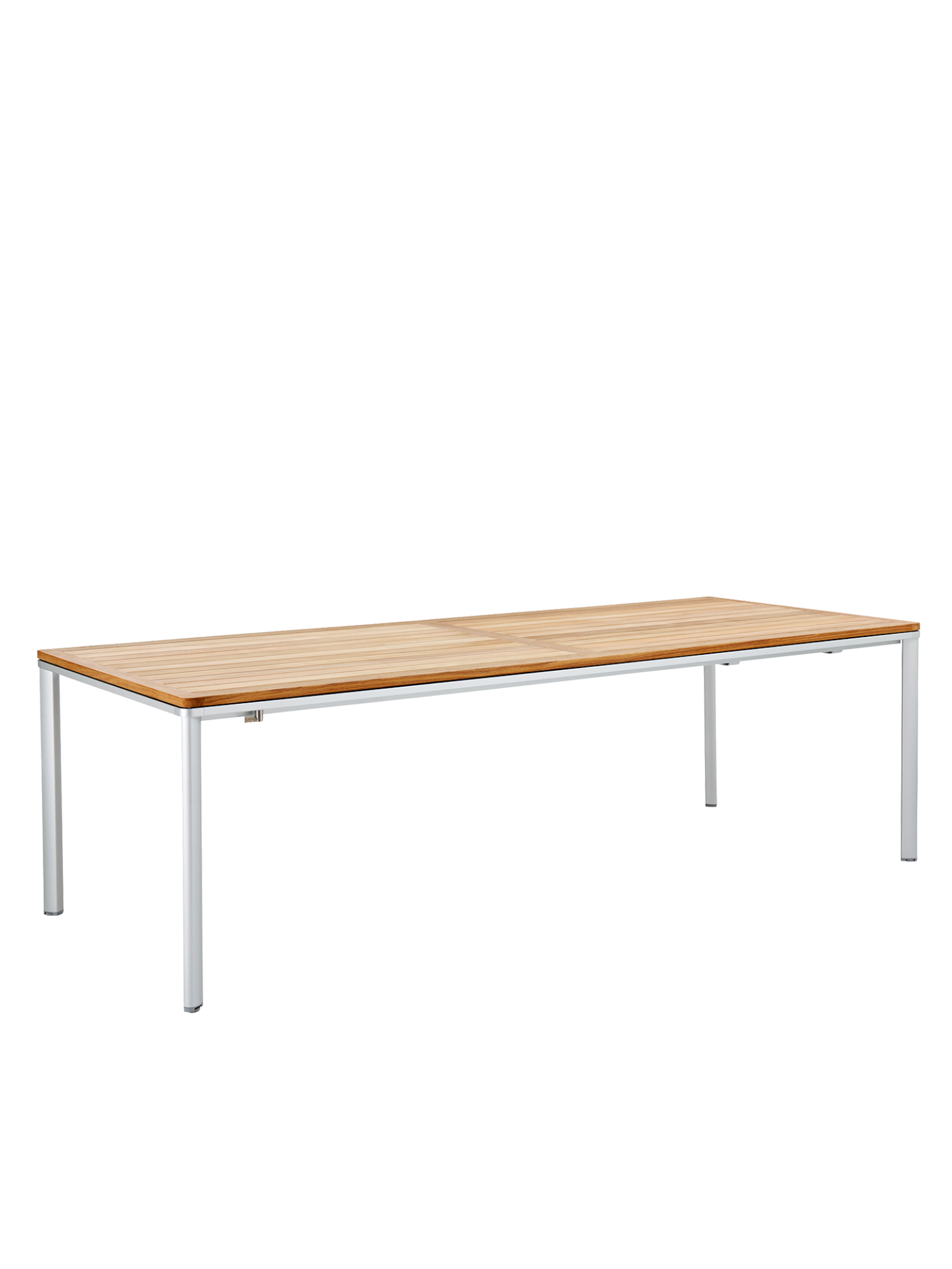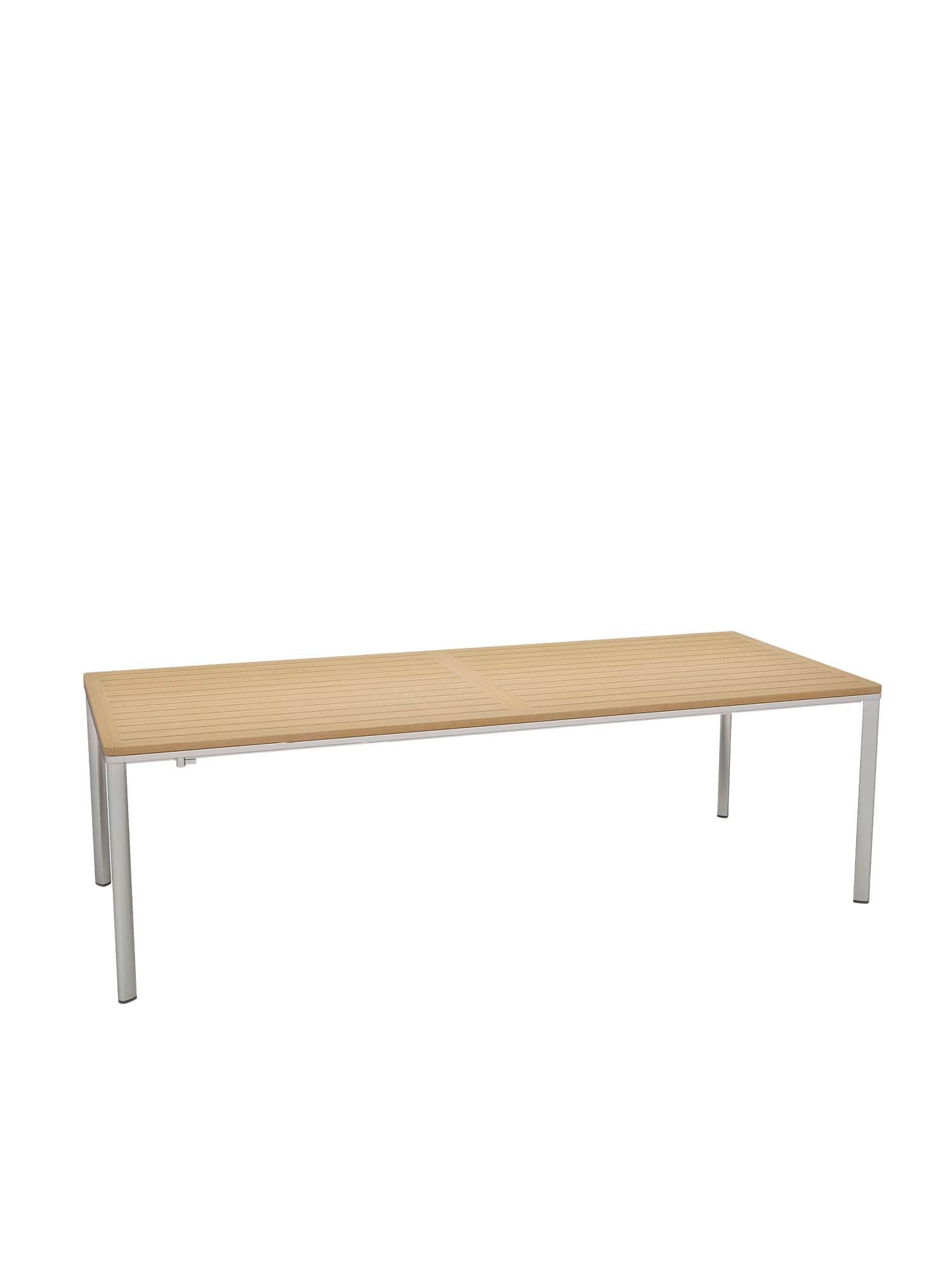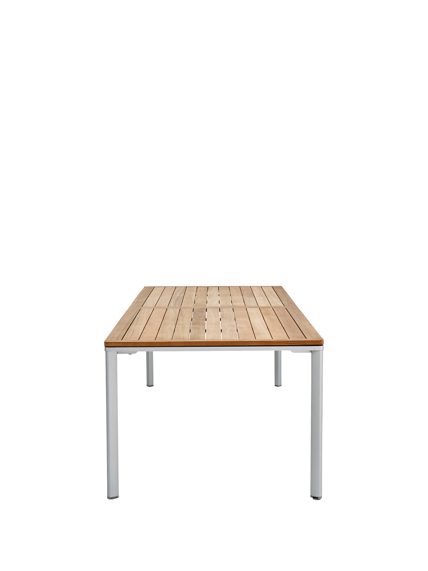 Eine umlaufende Zarge mit sanfter Rundung prägt das Design der vierbeinigen Portland Tische. Dabei lässt sie genügend Raum, um auch Stühle mit Armlehnen unter die Tischplatte zu schieben. Mit einer Tischoberfläche aus Teakleisten und einem Aluminiumgestell sind sie stilsichere Begleiter zu Stühlen der Serie Monterey.