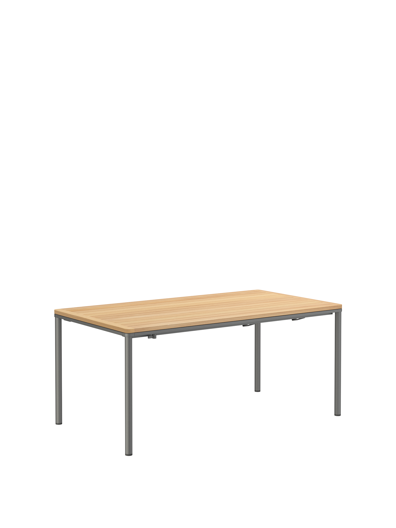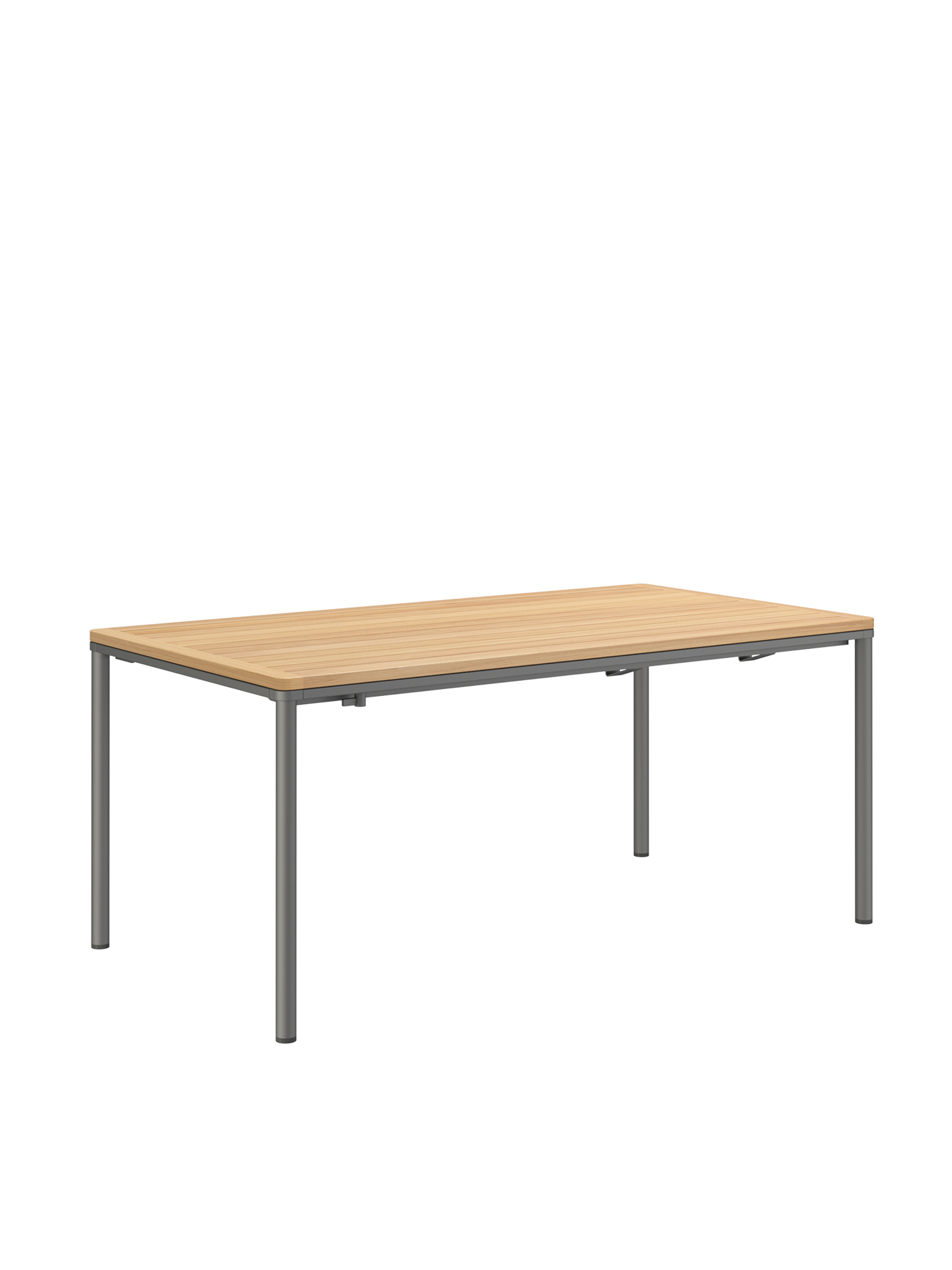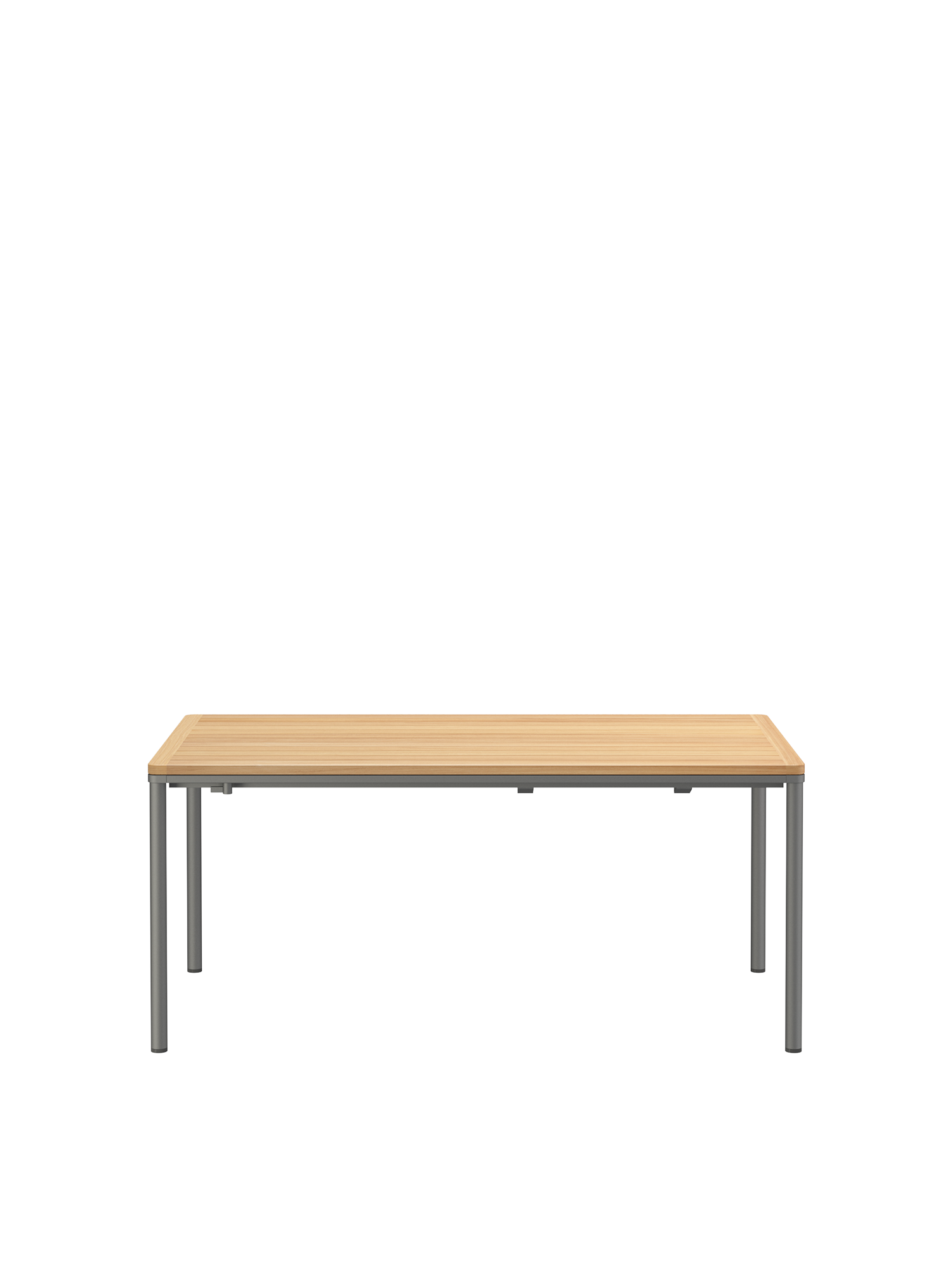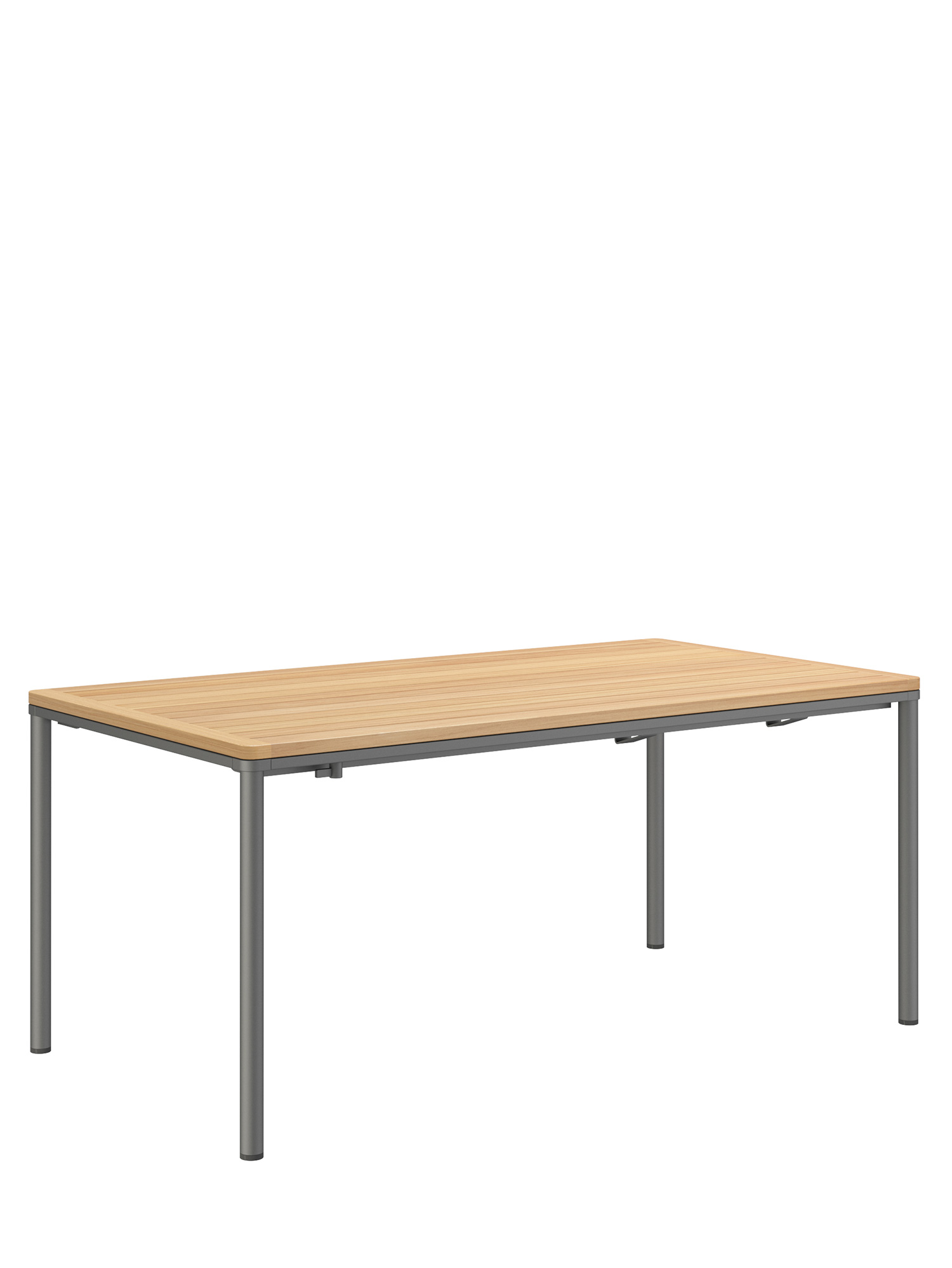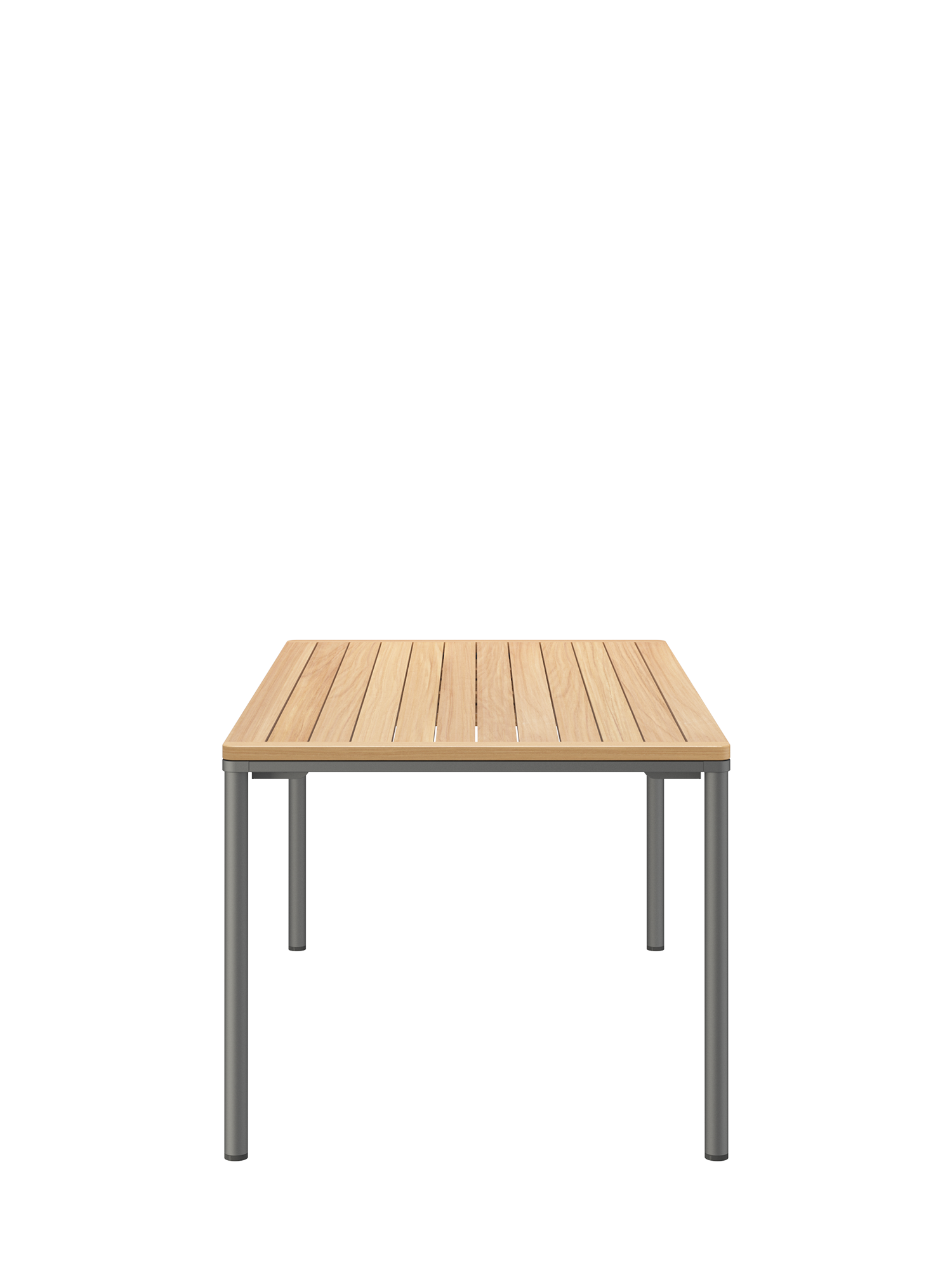 Das graphitgrau pulverbeschichtete Edelstahlgestell der Portland Tische verbindet diese mit allen Stühlen aus gleichem Material. Vier schlanke Beine tragen eine Platte, die mit der Zarge darunter wie aus einem Guss wirkt und in den Ecken der Rundung der Beine folgt. Die Oberfläche besteht aus hochwertigem Plantagenteak.