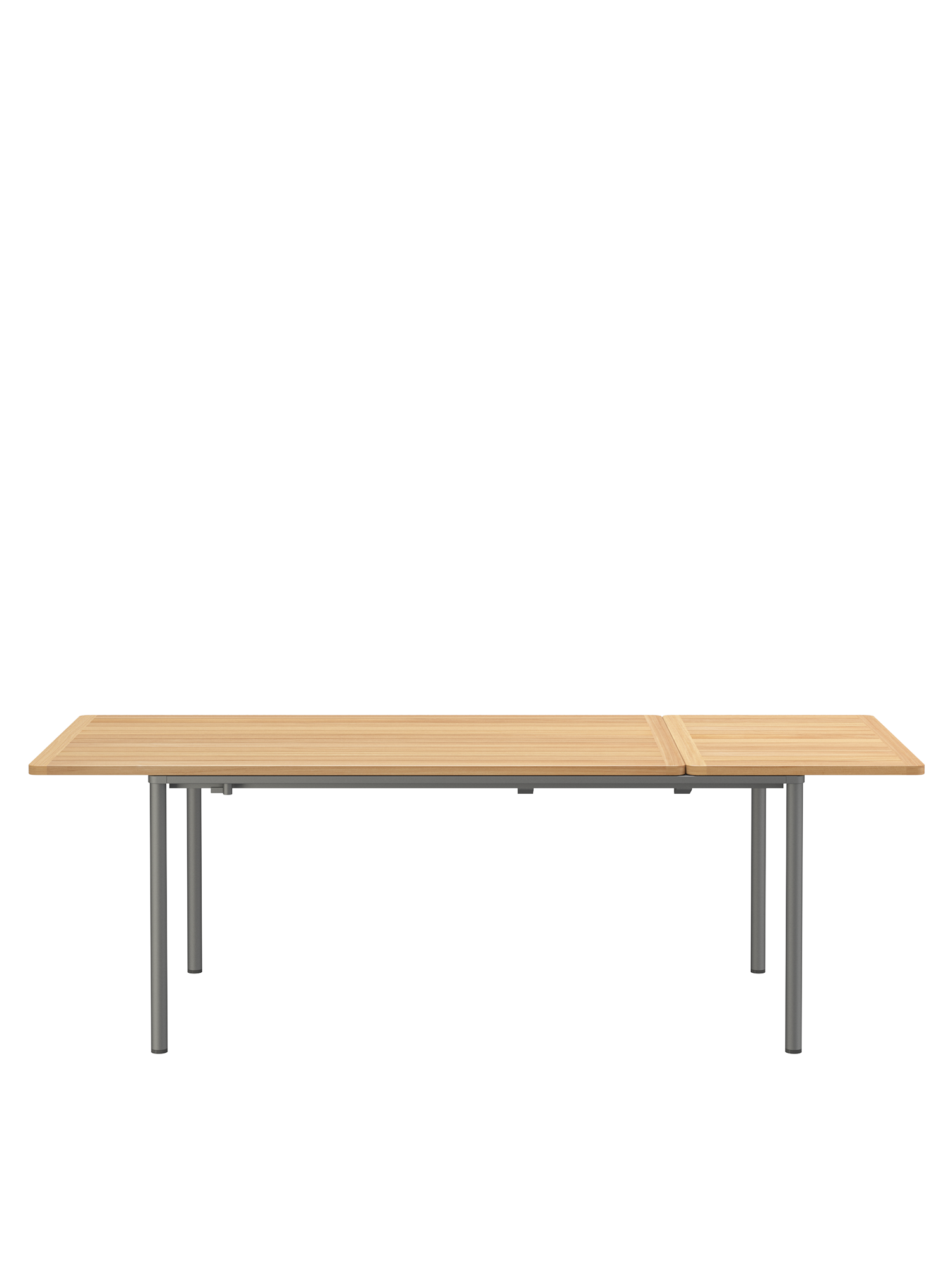 Die innovative und leichtgängige Ausziehmechanik der Portland Tische sorgt für einen fließenden Übergang vom Tisch zur Tafel. Beim mittleren und großen Modell der Serie lagert die Einlegeplatte im Tisch, beim kleinen Tisch wird sie in einer separaten Tasche verwahrt. Zur Erweiterung wird die Tischplatte leicht mit wenigen Handgriffen seitlich verschoben. Beim großen und mittleren Modell wird die Einlegeplatte so positioniert, dass die Tischplatte einen gleichen Überstand zu beiden Seiten hat oder aber auf einer Seite vollständig übersteht. In dieser Variante können alle Gäste längsseits sitzen und Beinfreiheit genießen. Beim kleinen Tisch ist die Platte immer mittig ausgerichtet.