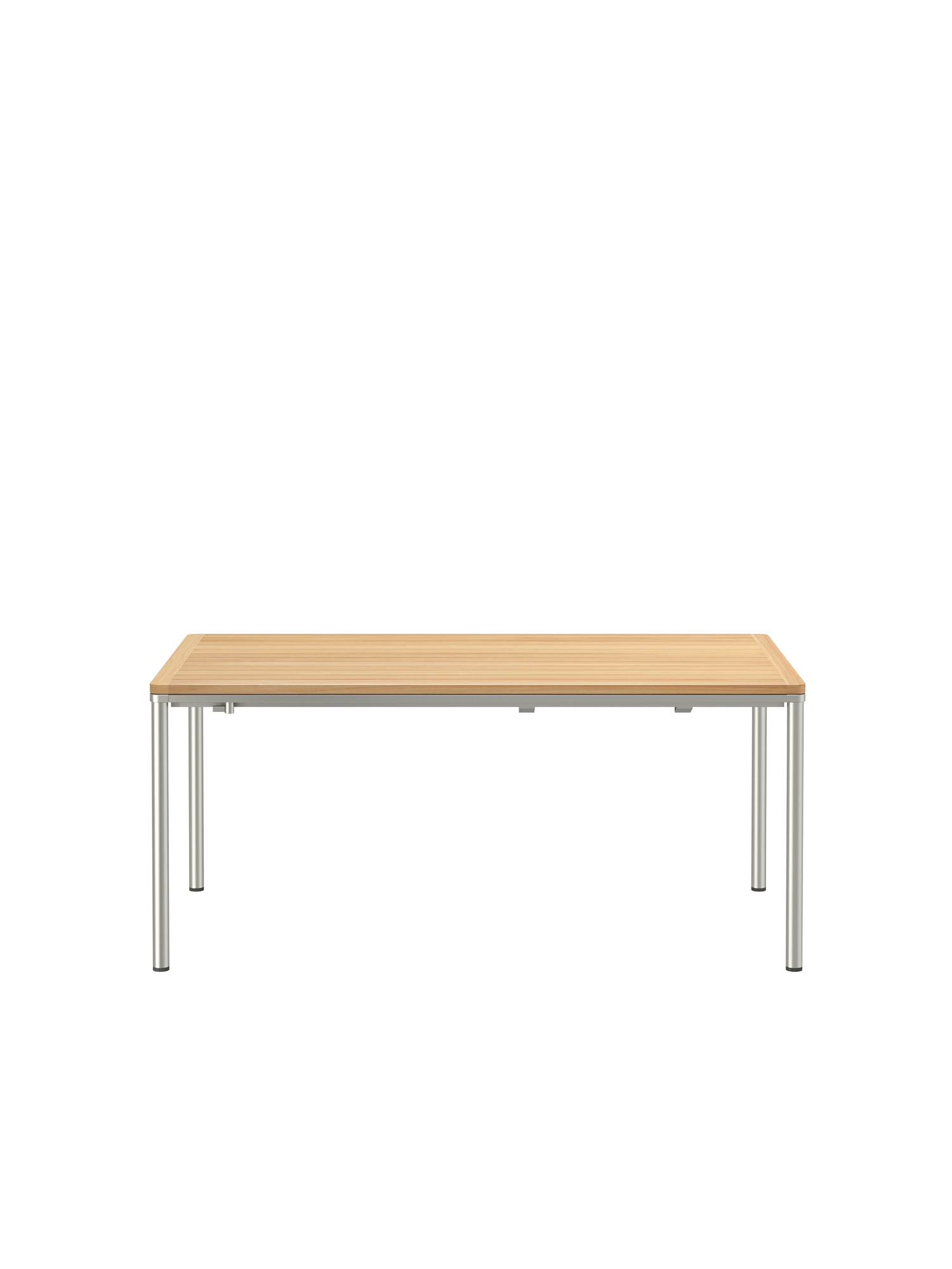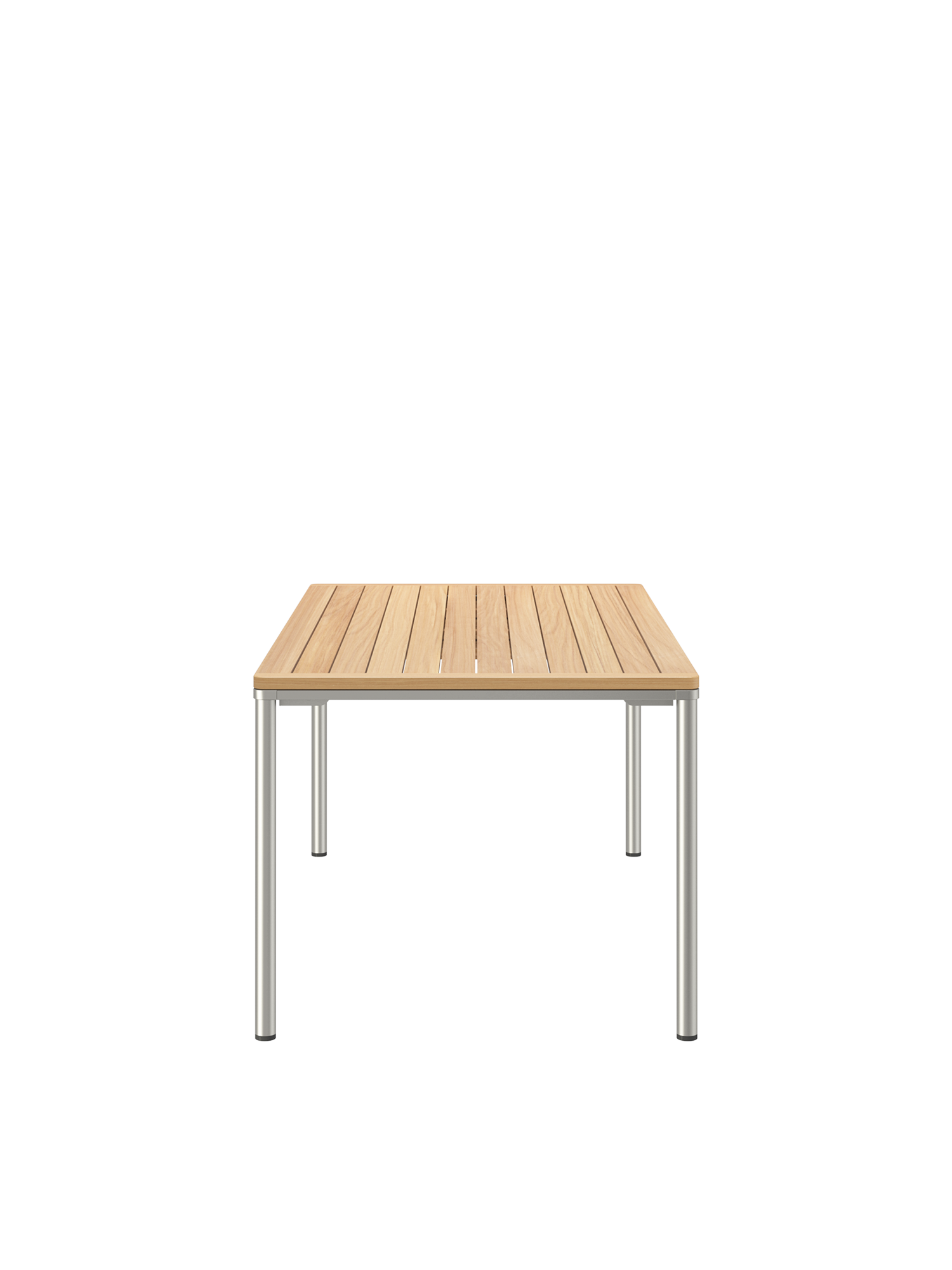 Das Edelstahlgestell der Portland Tische verbindet diese mit allen Stühlen aus gleichem Material. Vier schlanke Beine tragen eine Platte, die mit der Zarge darunter wie aus einem Guss wirkt und in den Ecken der Rundung der Beine folgt. Die Platte besteht aus Teakholz und verleiht dem Tisch damit eine natürliche Wärme.