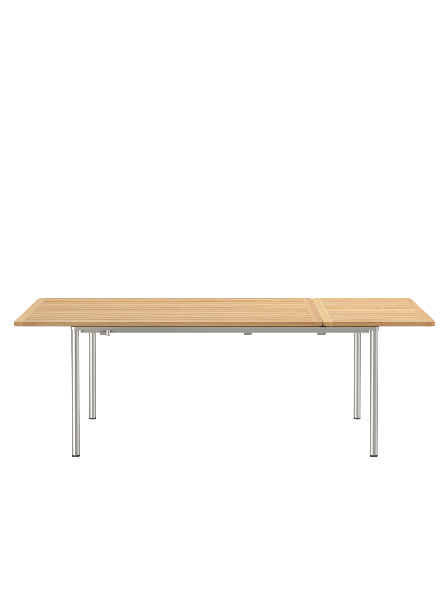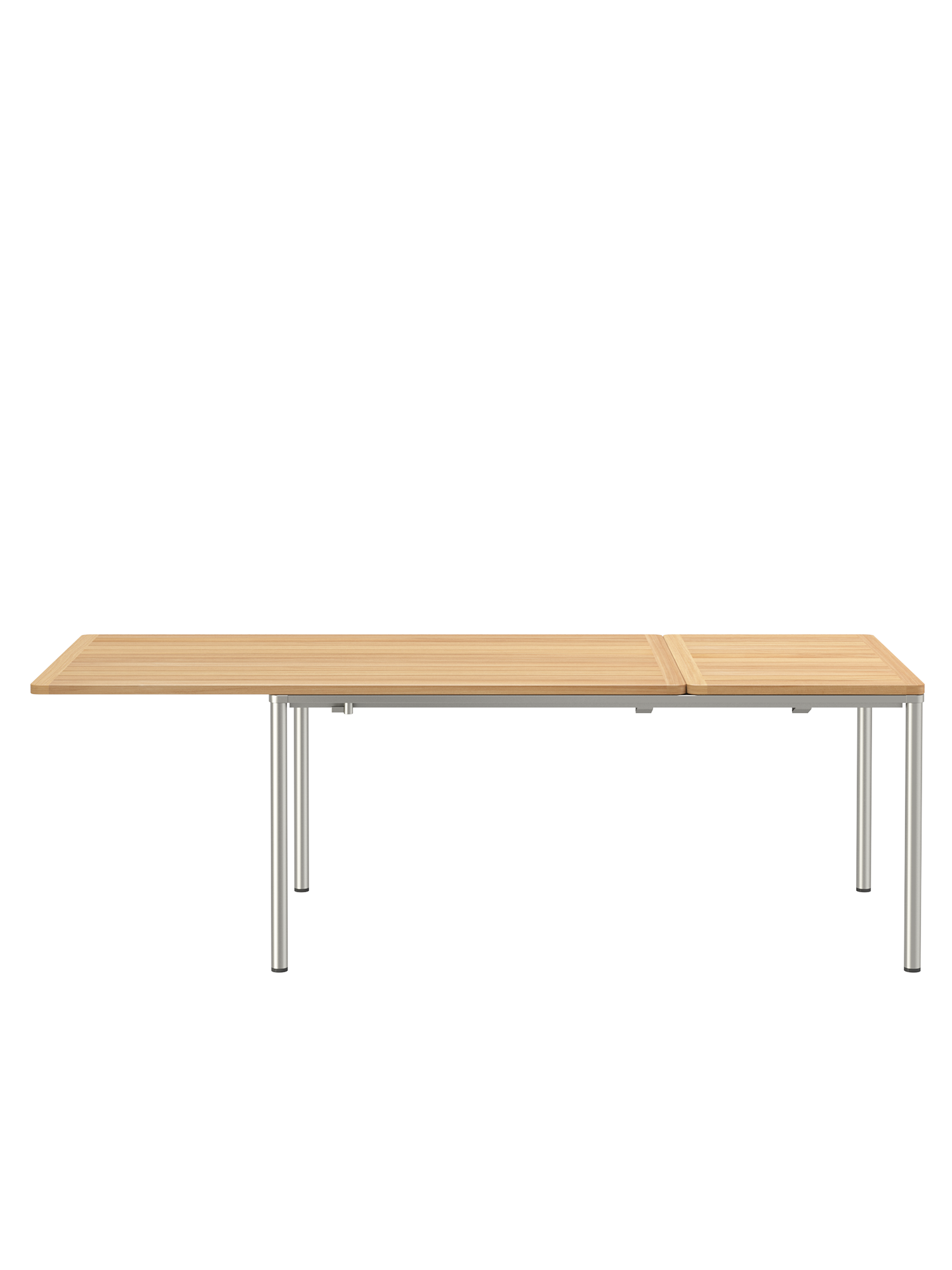 Die innovative und leichtgängige Ausziehmechanik der Portland Tische sorgt für einen fließenden Übergang vom Tisch zur Tafel. Beim mittleren und großen Modell der Serie lagert die Einlegeplatte im Tisch, beim kleinen Tisch wird sie in einer separaten Tasche verwahrt. Zur Erweiterung wird die Tischplatte leicht mit wenigen Handgriffen seitlich verschoben. Beim großen und mittleren Modell wird die Einlegeplatte so positioniert, dass die Tischplatte einen gleichen Überstand zu beiden Seiten hat oder aber auf einer Seite vollständig übersteht. In dieser Variante können alle Gäste längsseits sitzen und Beinfreiheit genießen. Beim kleinen Tisch ist die Platte immer mittig ausgerichtet.