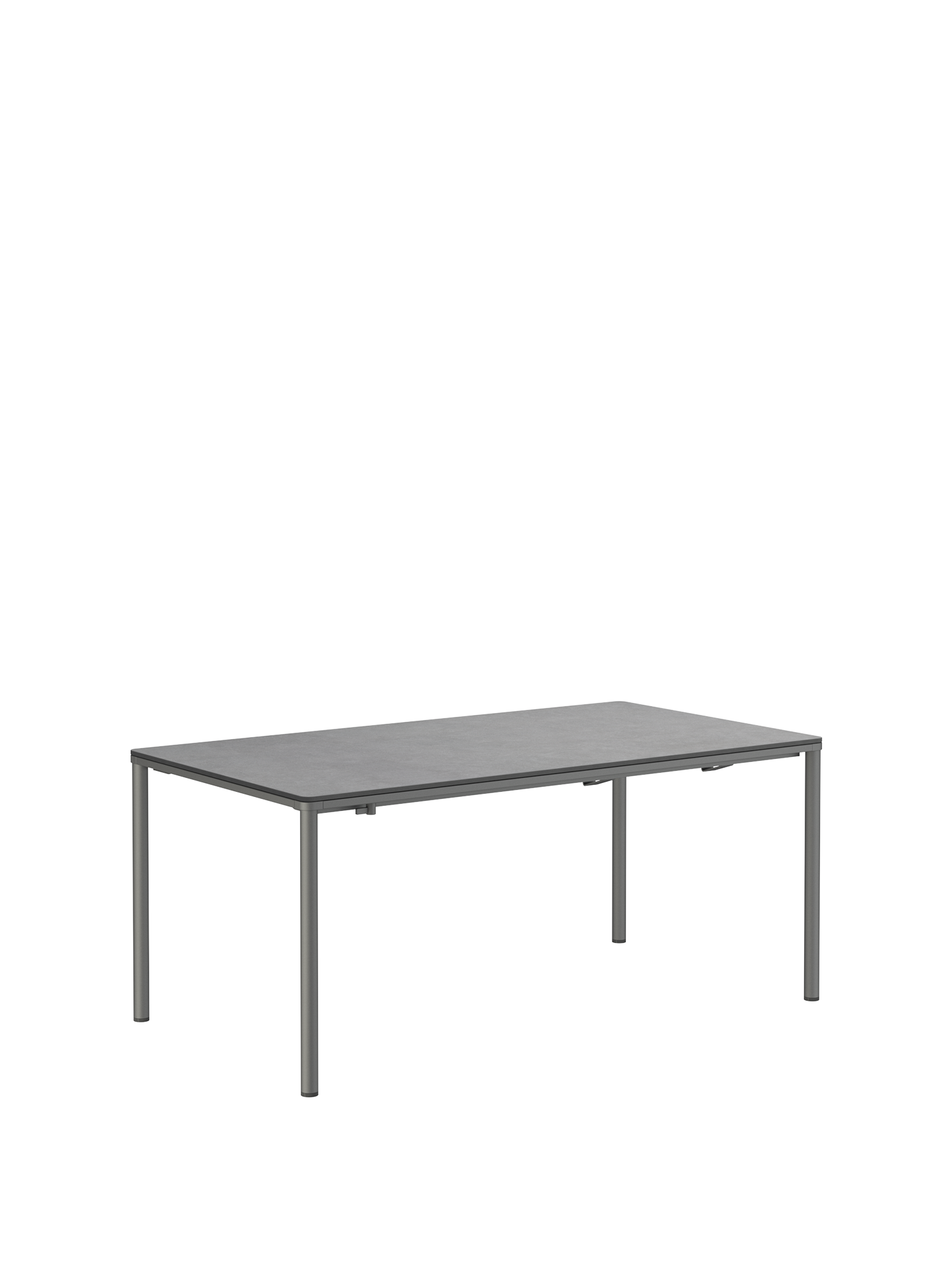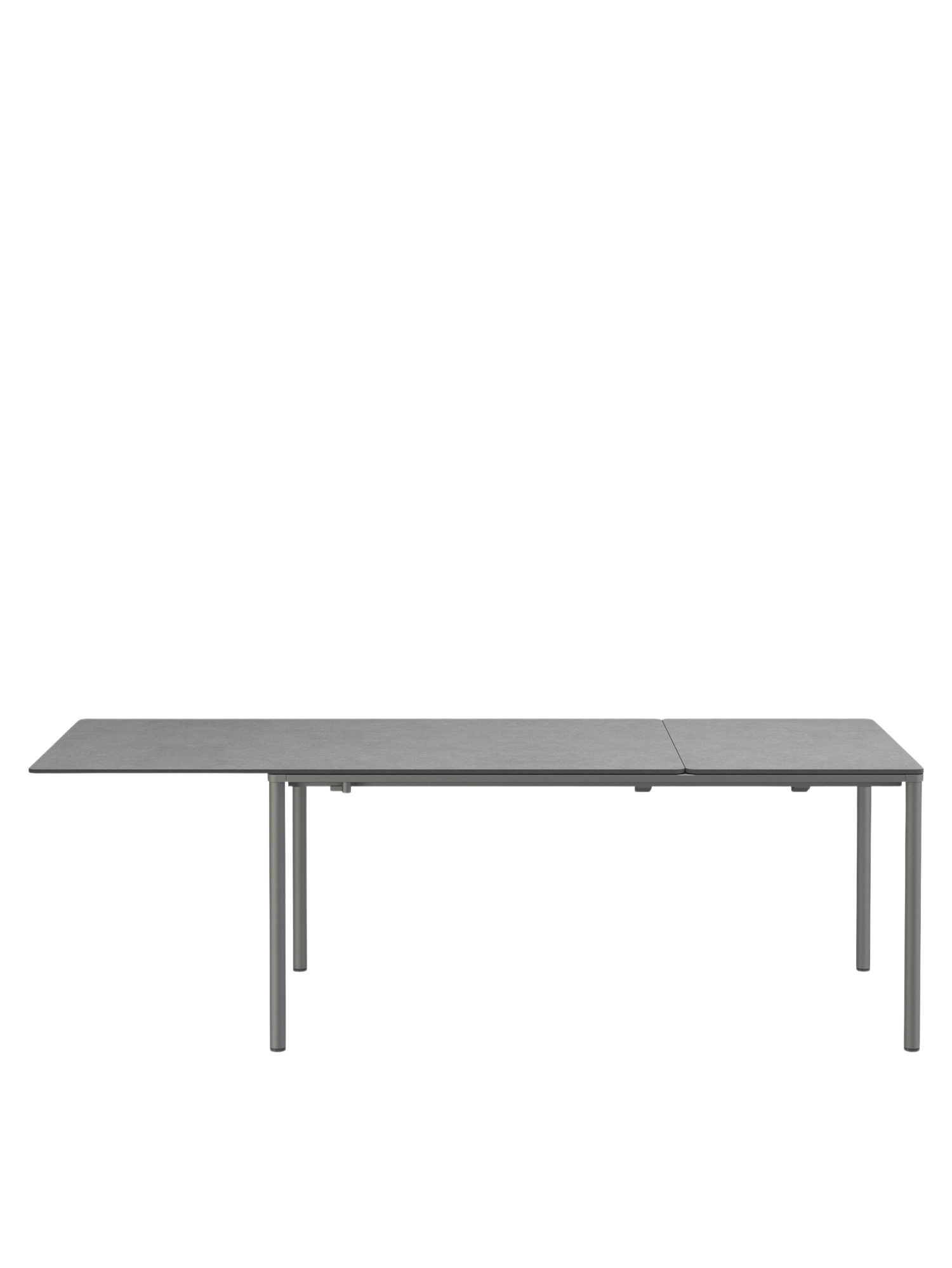 Das graphitgrau pulverbeschichtete Edelstahlgestell der Portland Tische verbindet diese mit allen Stühlen aus gleichem Material. Vier schlanke Beine tragen eine Platte, die mit der Zarge darunter wie aus einem Guss wirkt und in den Ecken der Rundung der Beine folgt. Die Oberfläche besteht aus wetterfestem Kunstharz im Farbton Shade.
