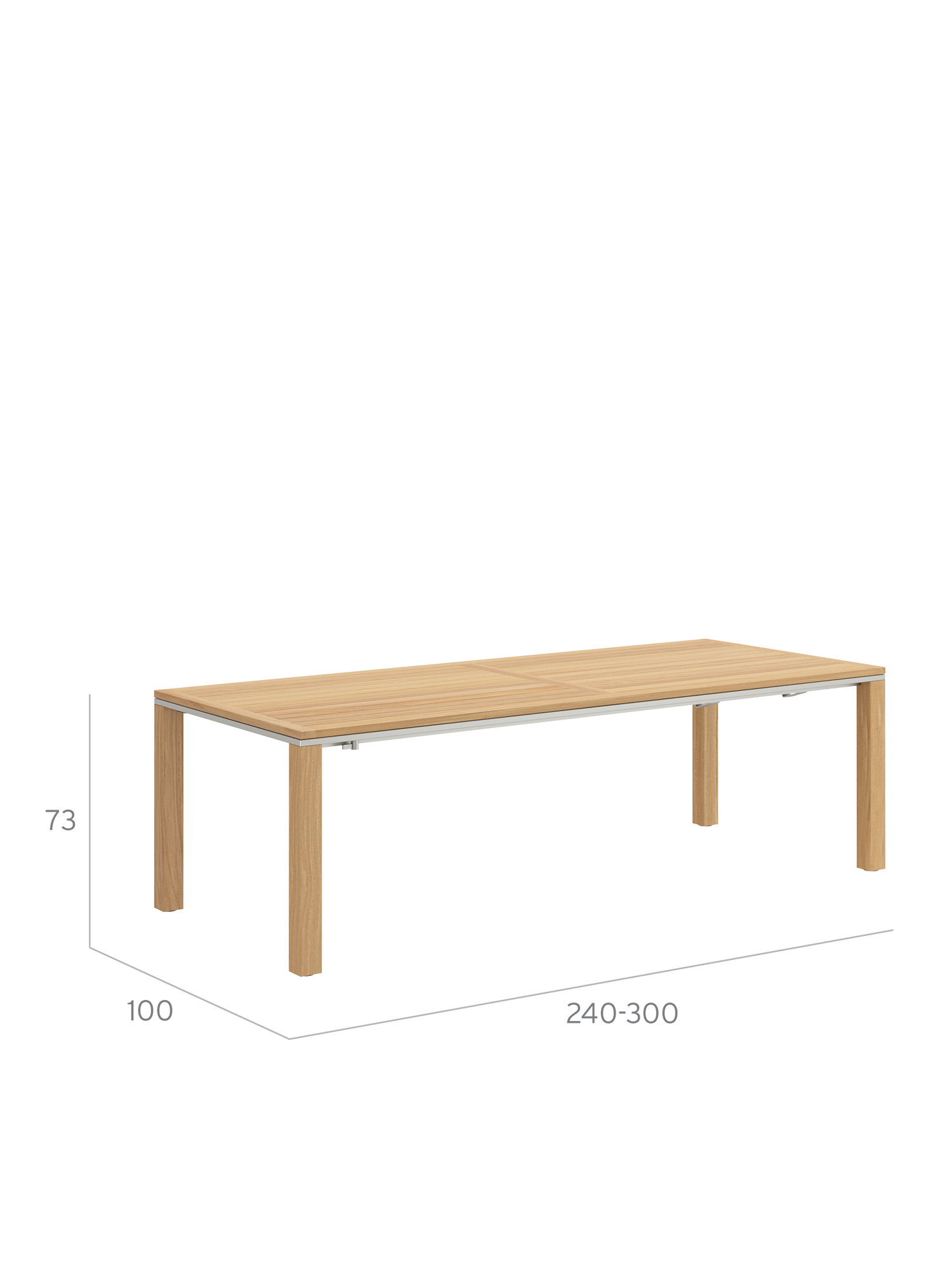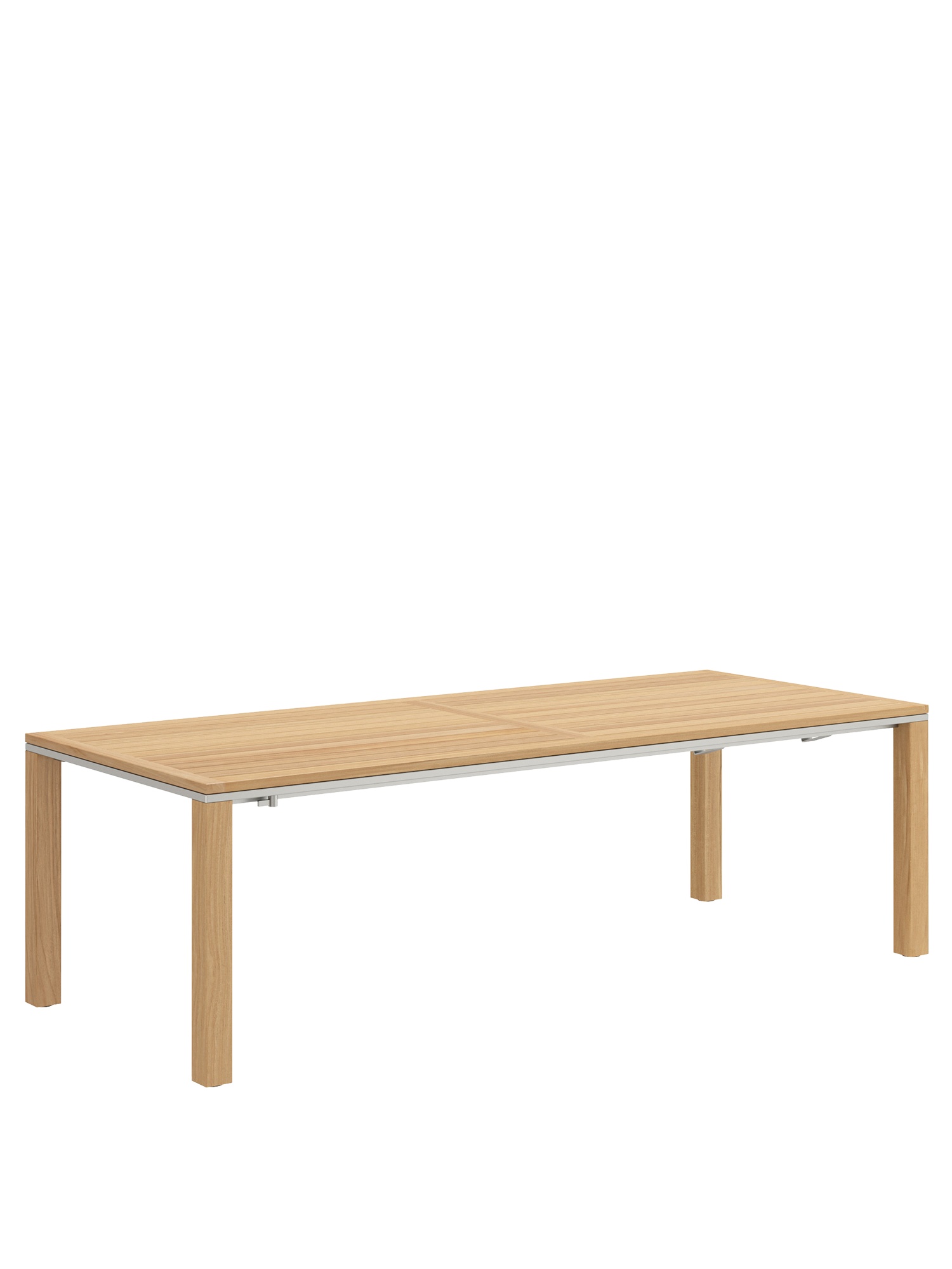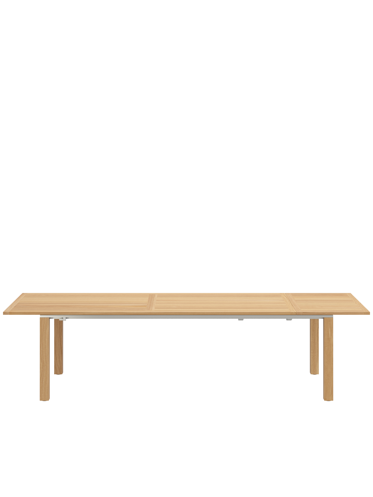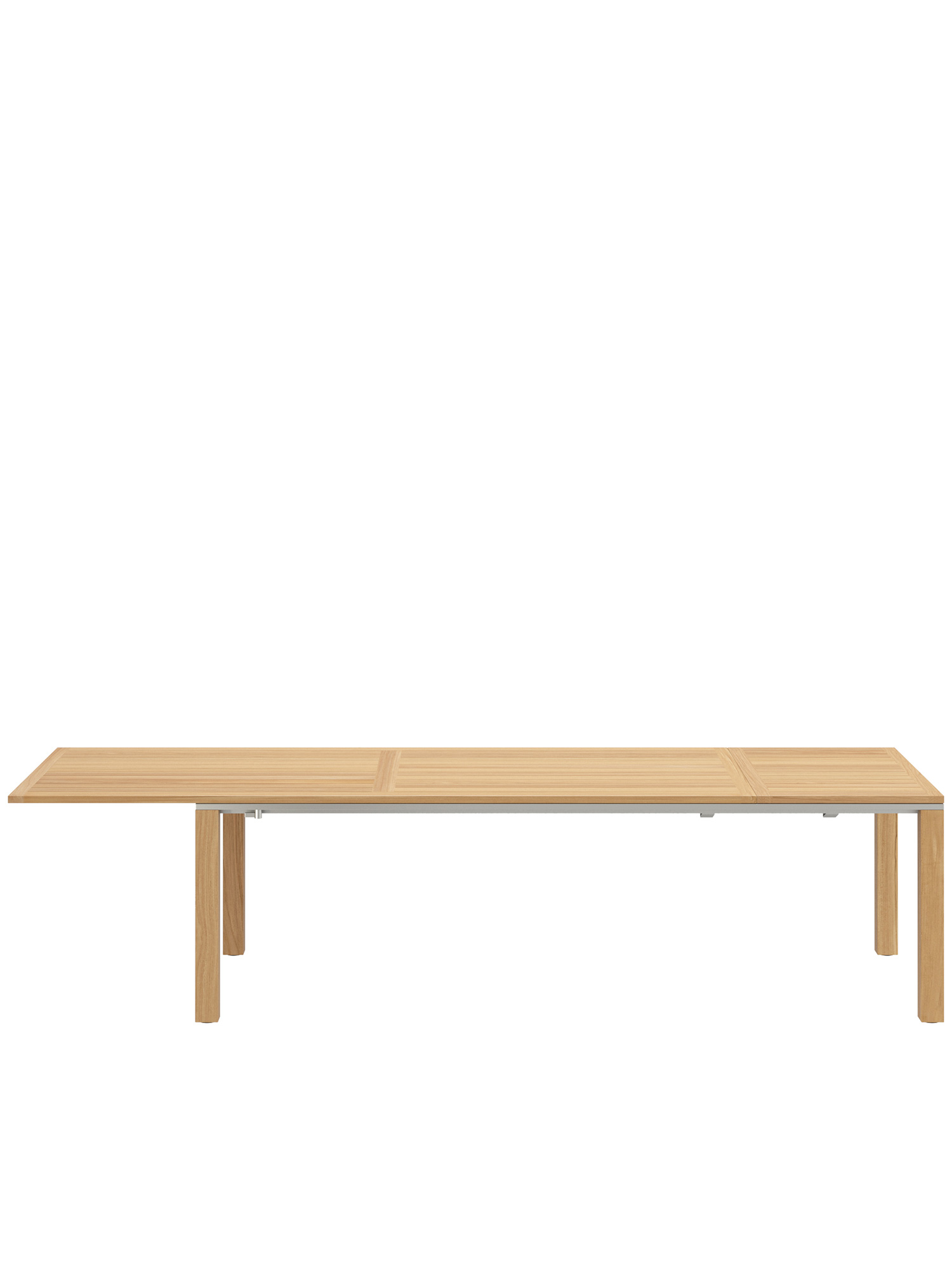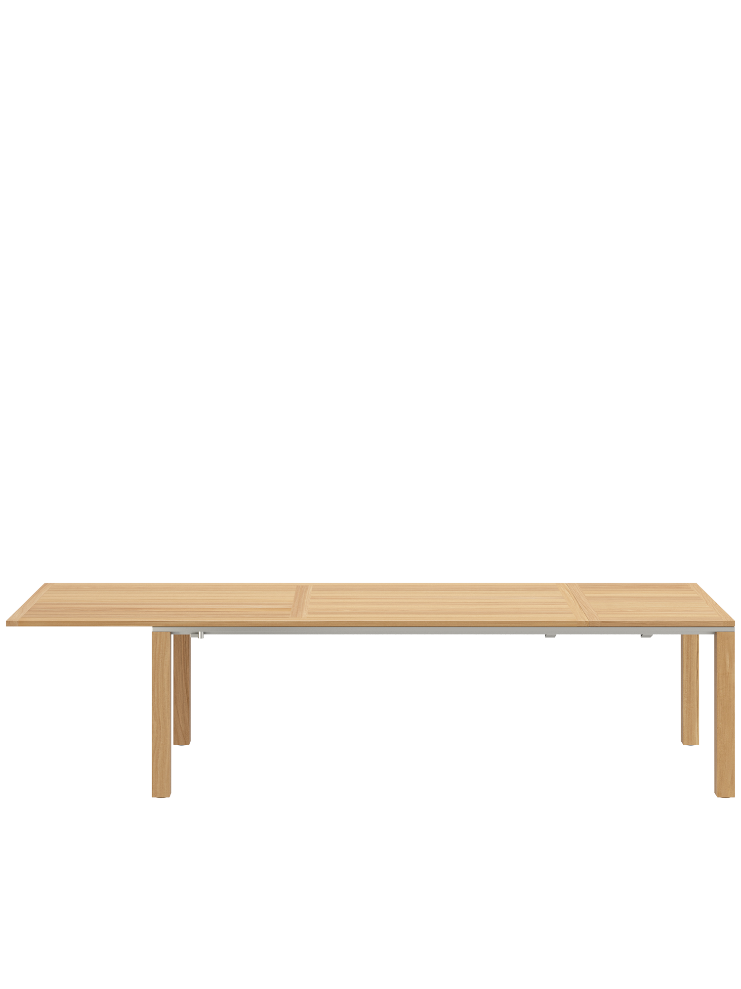 Die innovative und leichtgängige Ausziehmechanik der Portland Tische sorgt für einen fließenden Übergang vom Tisch zur Tafel. Beim mittleren und großen Modell der Serie lagert die Einlegeplatte im Tisch, beim kleinen Tisch wird sie in einer separaten Tasche verwahrt. Zur Erweiterung wird die Tischplatte leicht mit wenigen Handgriffen seitlich verschoben. Beim großen und mittleren Modell wird die Einlegeplatte so positioniert, dass die Tischplatte einen gleichen Überstand zu beiden Seiten hat oder aber auf einer Seite vollständig übersteht. In dieser Variante können alle Gäste längsseits sitzen und Beinfreiheit genießen. Beim kleinen Tisch ist die Platte immer mittig ausgerichtet.