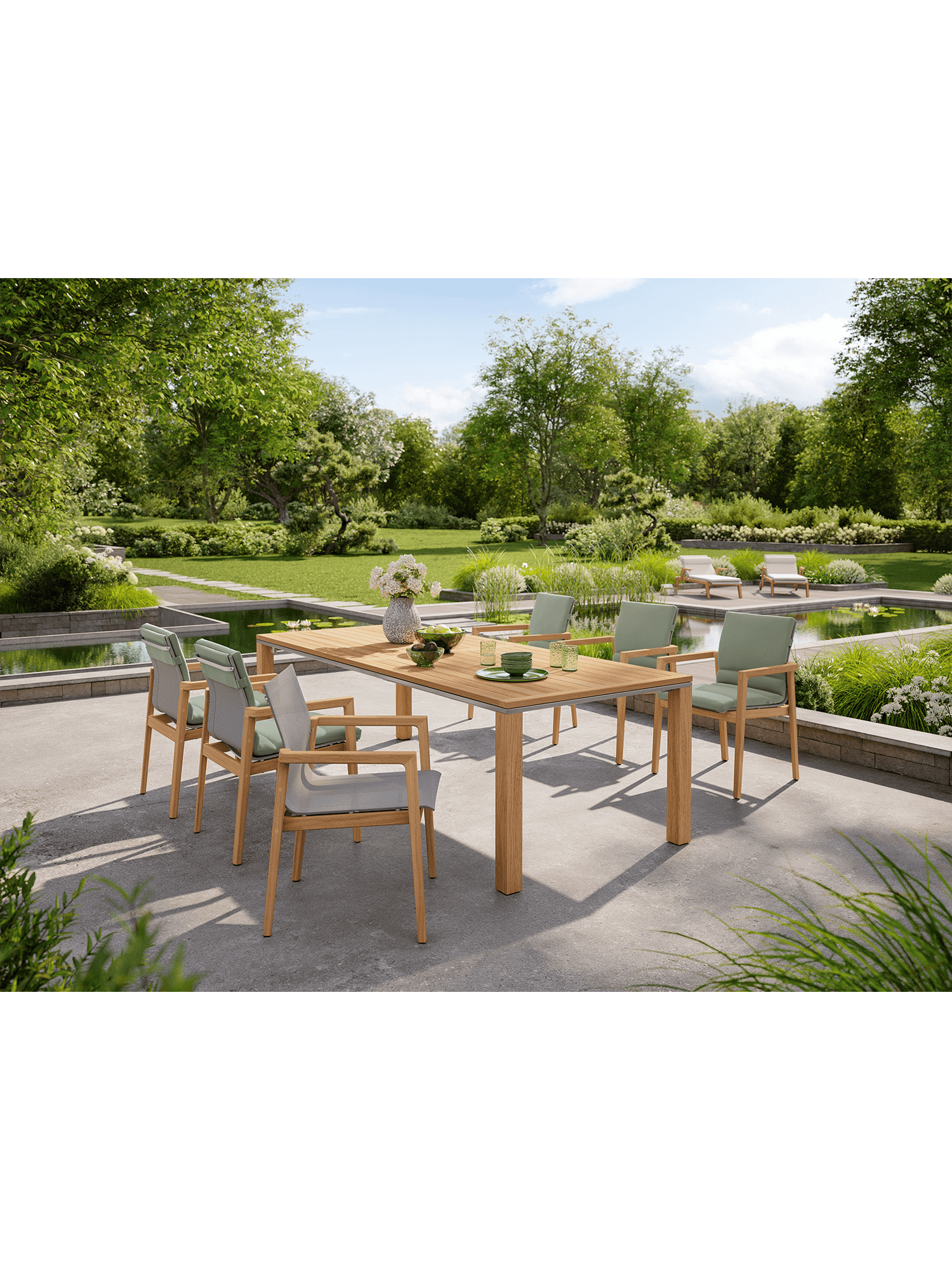 Die geradlinigen Tische verbinden massive Teakleisten mit einer umlaufenden Zarge aus Edelstahl.