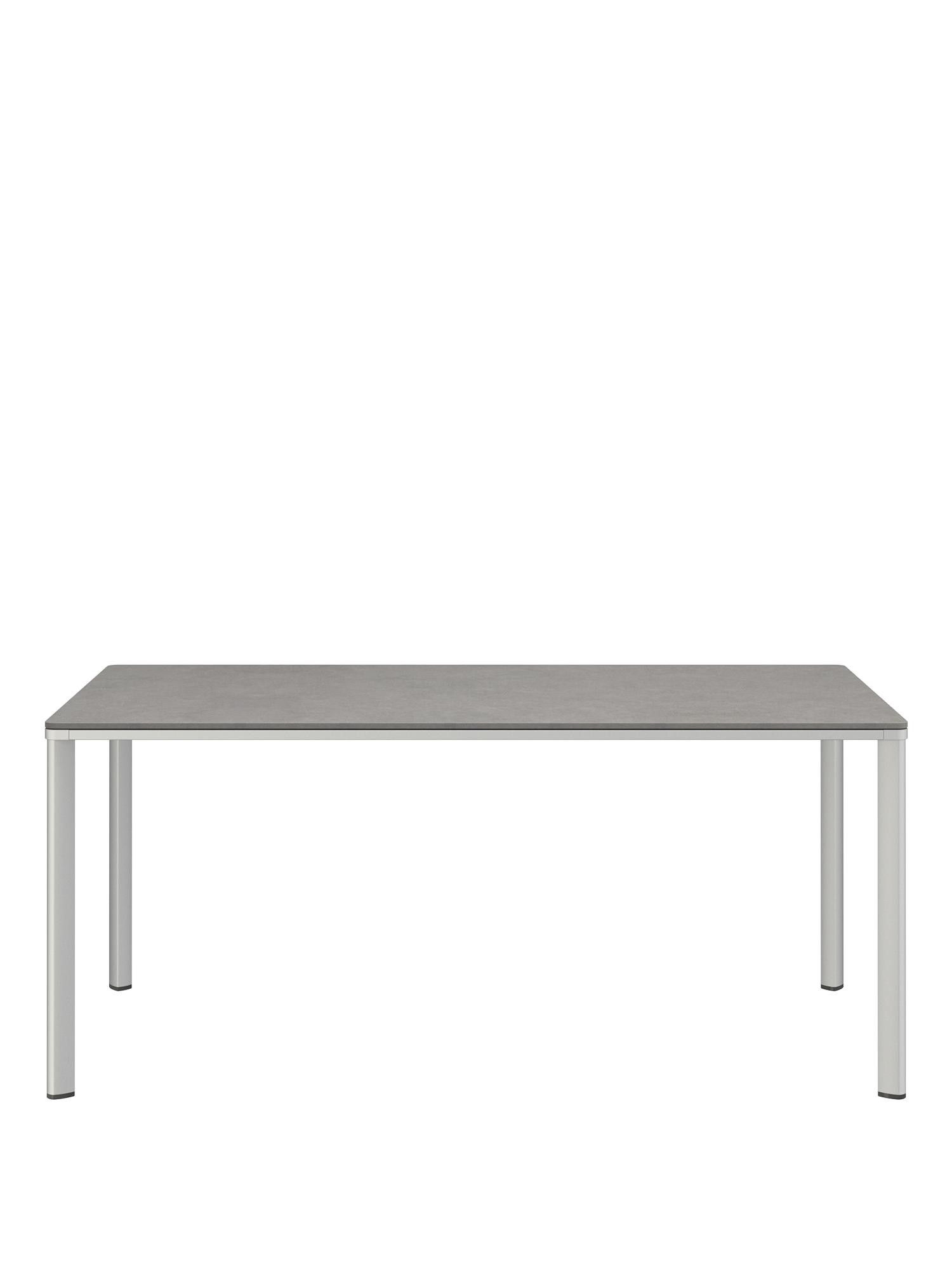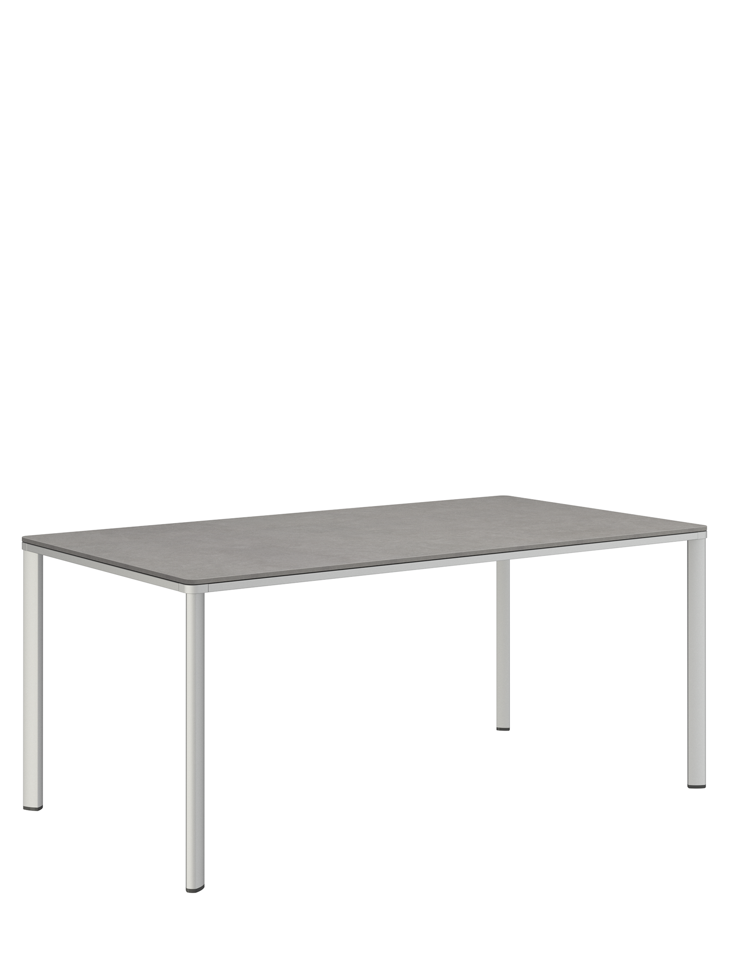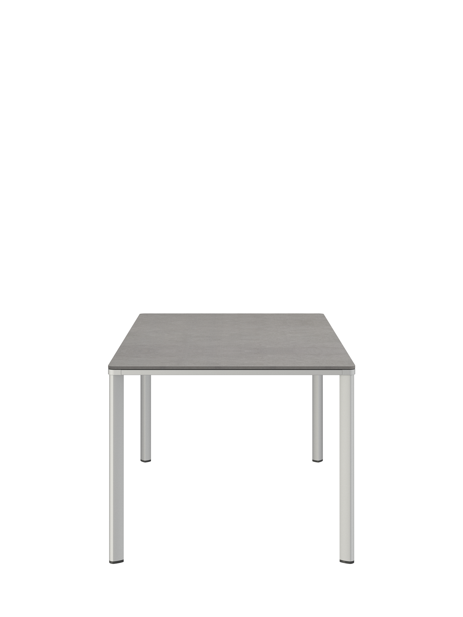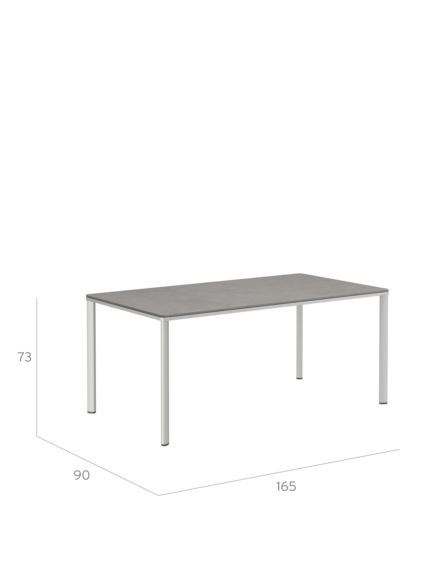 Das aufwendig eloxierte Aluminiumgestell des Portland Tisches verbindet diesen mit den Stühlen der Temper Serie. Vier schlanke Beine tragen eine Platte, die mit der Zarge darunter wie aus einem Guss wirkt und in den Ecken der Rundung der Beine folgt. Die Oberfläche besteht aus pflegeleichten, wetterfestem Kunstharz im Farbton Shade.
