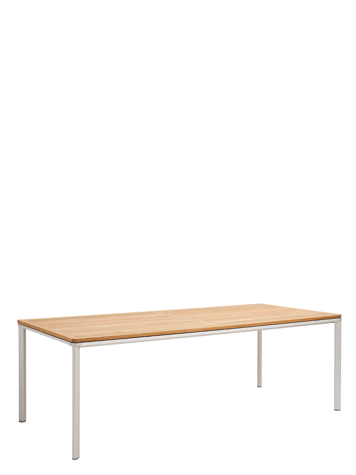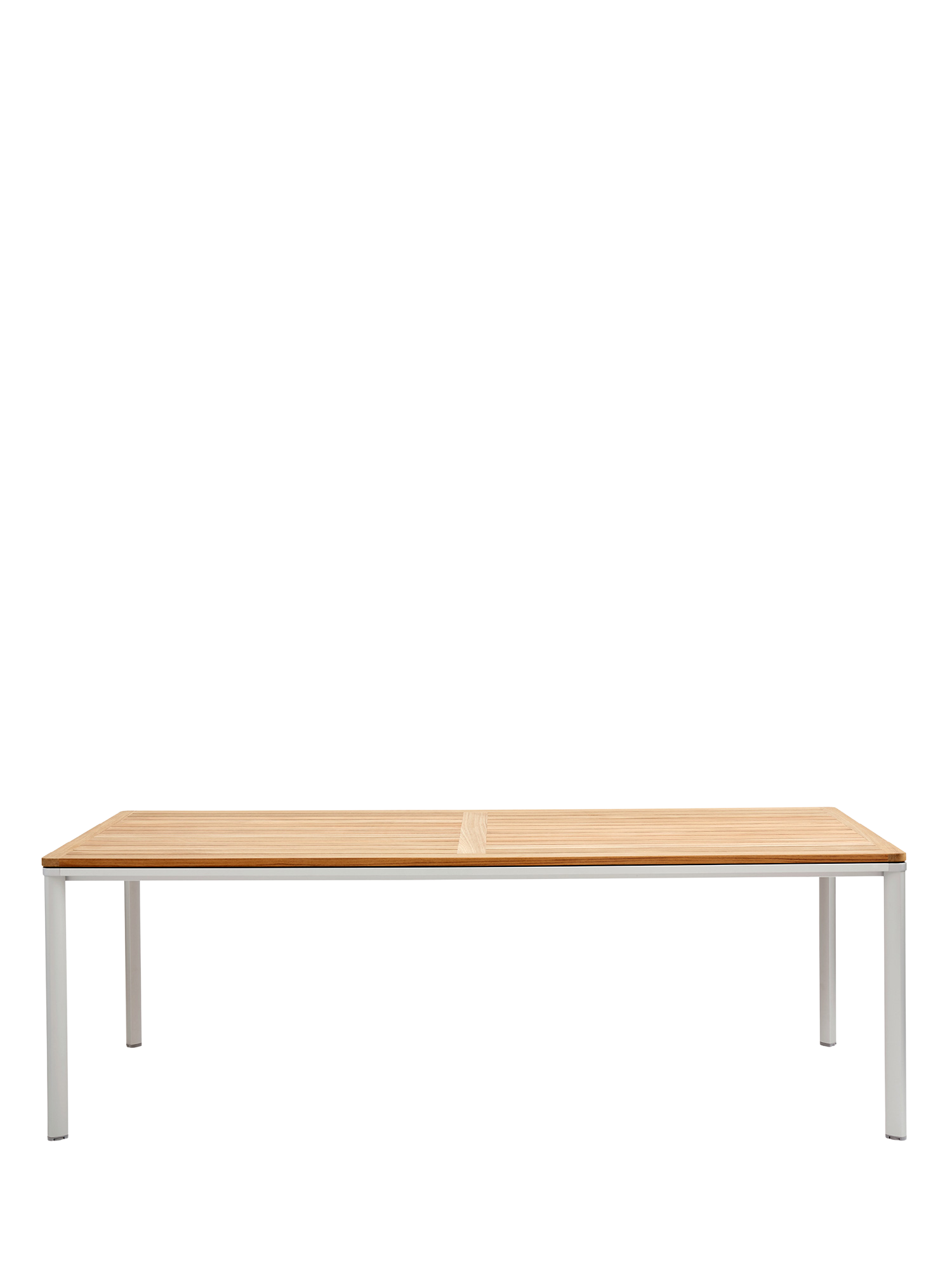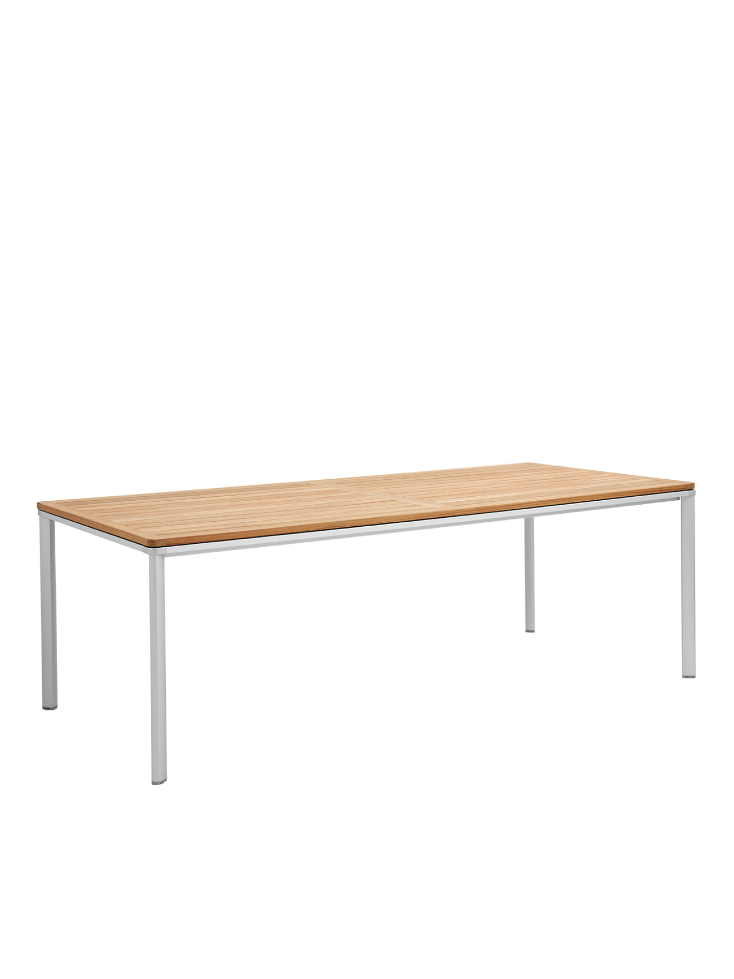 Eine umlaufende Zarge mit sanfter Rundung prägt das Design der vierbeinigen Portland Tische. Dabei lässt sie genügend Raum, um auch Stühle mit Armlehnen unter die Tischplatte zu schieben. Mit einer Tischoberfläche aus Teakleisten und einem Aluminiumgestell sind sie stilsichere Begleiter zu Stühlen der Serie Monterey.
