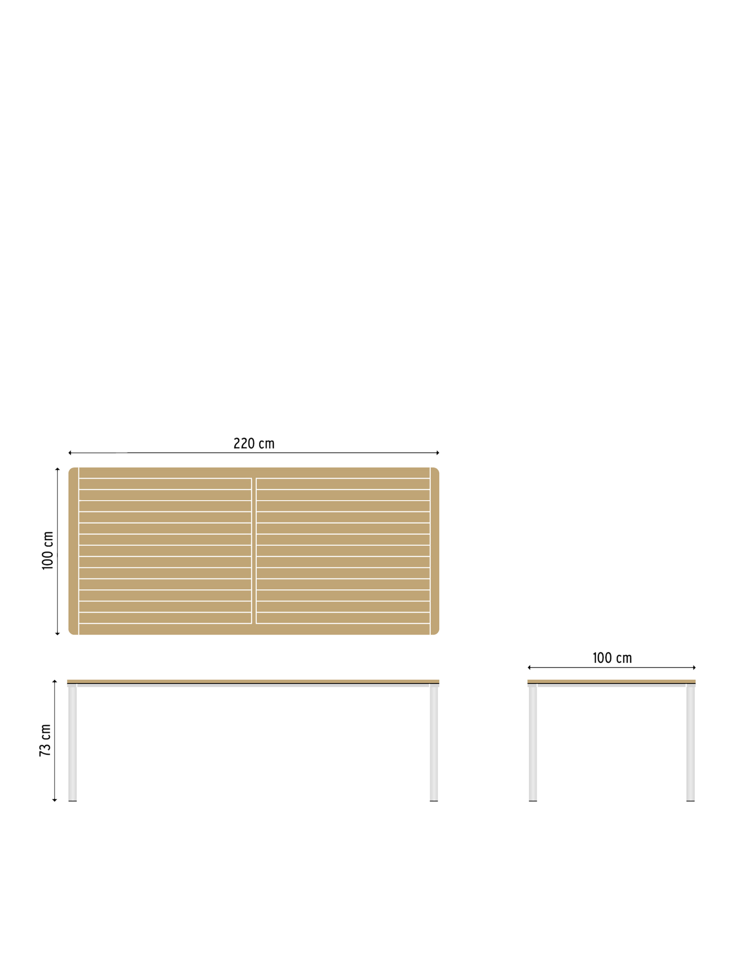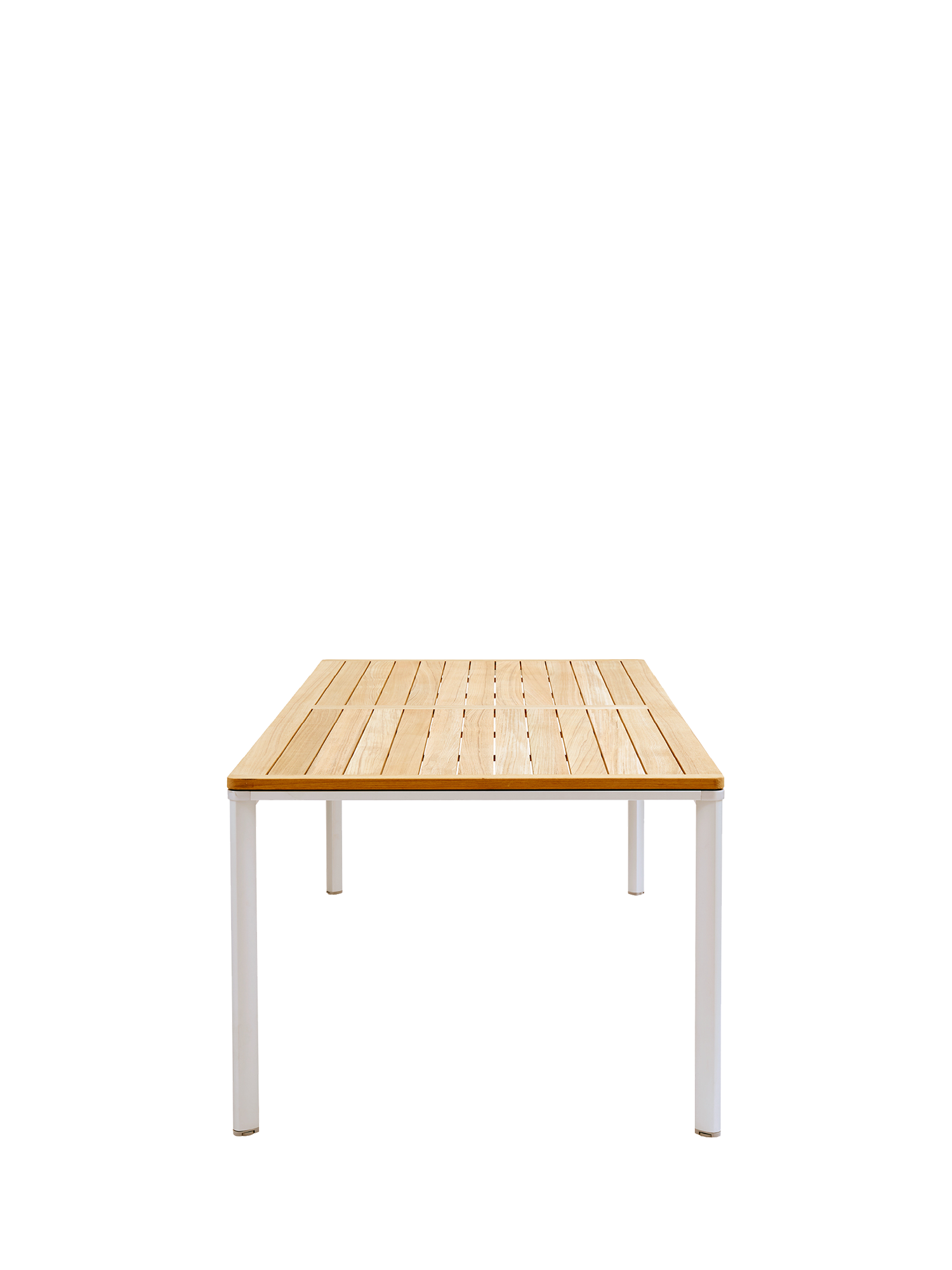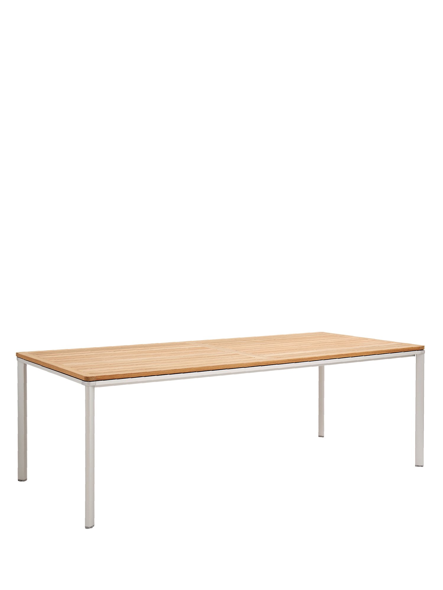 Eine umlaufende Zarge mit sanfter Rundung prägt das Design der vierbeinigen Portland Tische. Dabei lässt sie genügend Raum, um auch Stühle mit Armlehnen unter die Tischplatte zu schieben. Mit einer Tischoberfläche aus Teakleisten und einem Aluminiumgestell sind sie stilsichere Begleiter zu Stühlen der Serie Monterey.