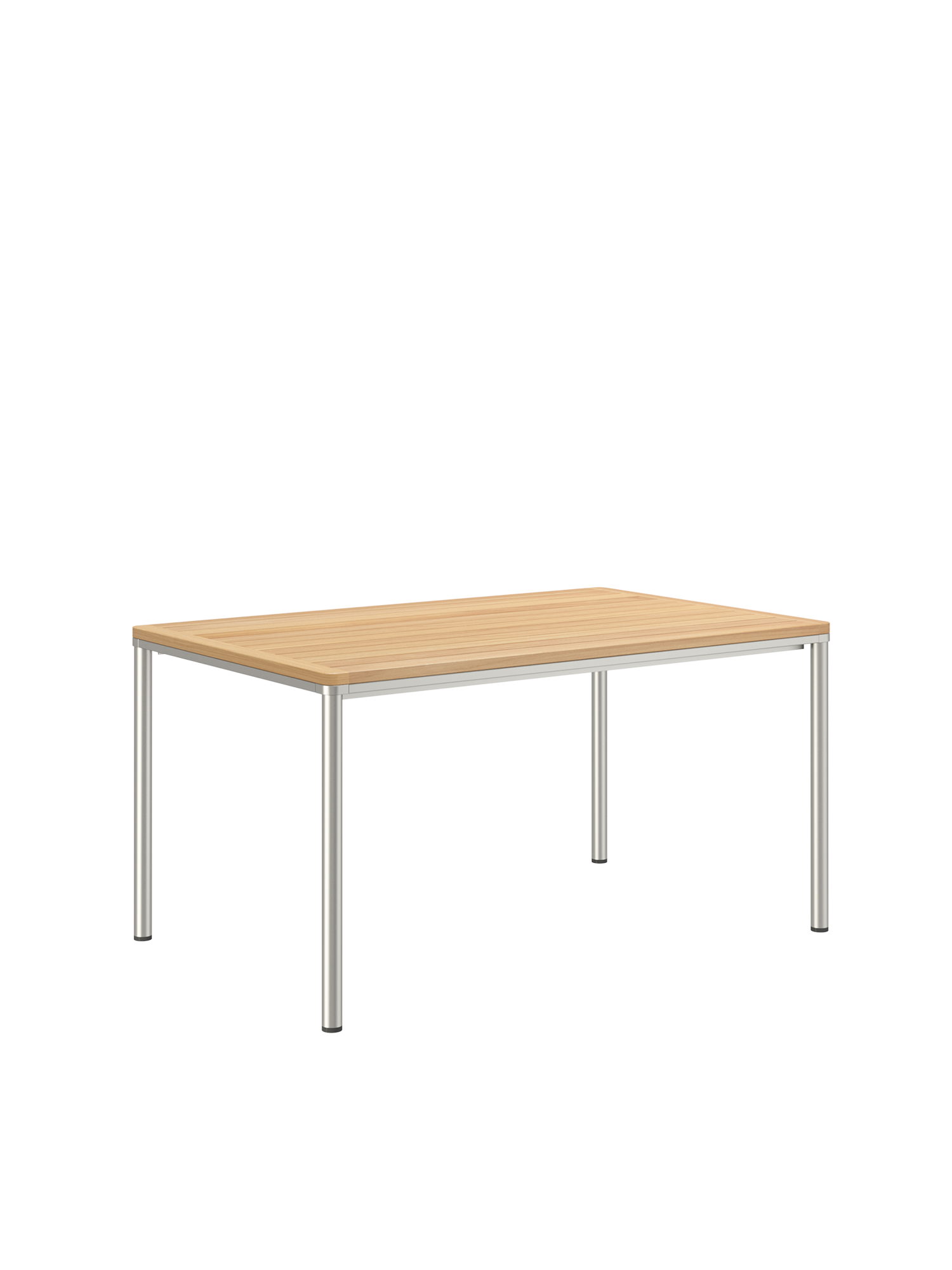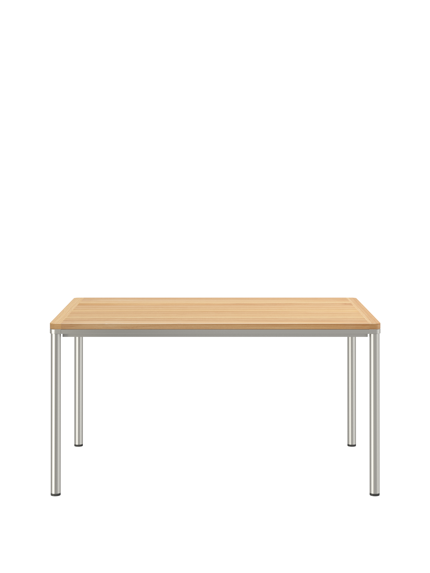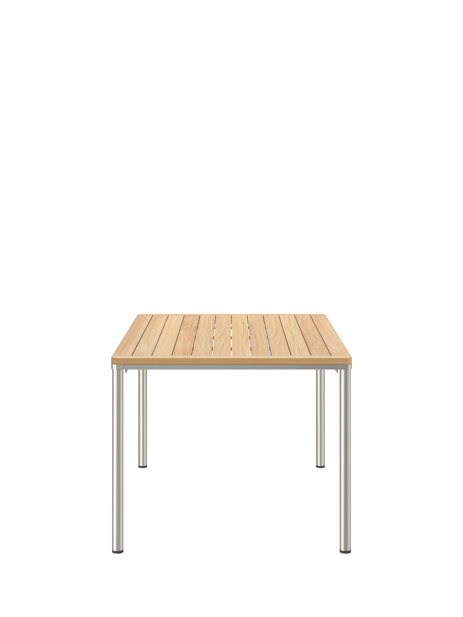 Die hochwertige Kombination aus einer Tischoberfläche aus Teakleisten und einem Gestell aus Edelstahl ermöglicht einen ganzjährigen Einsatz im Freien.