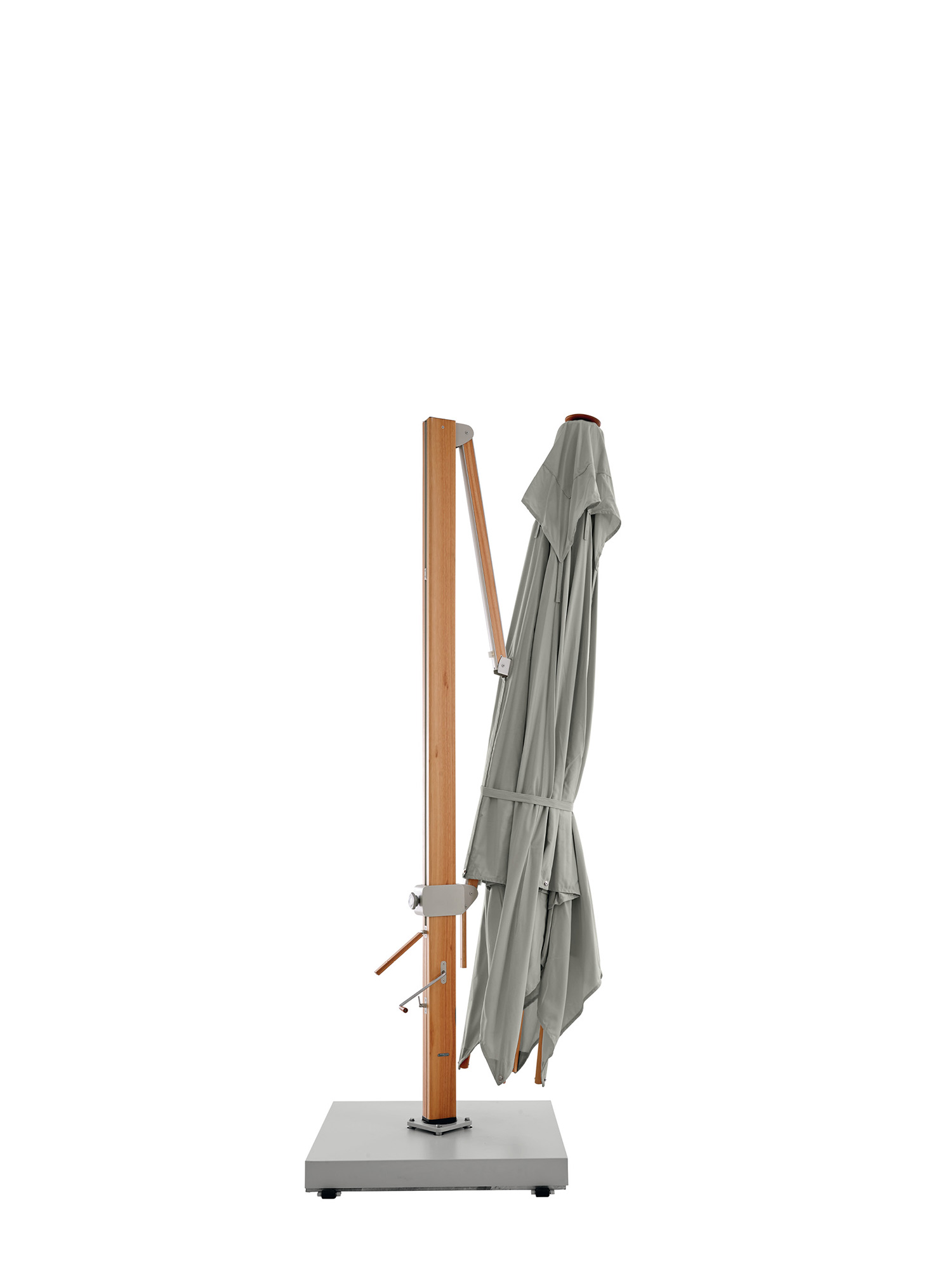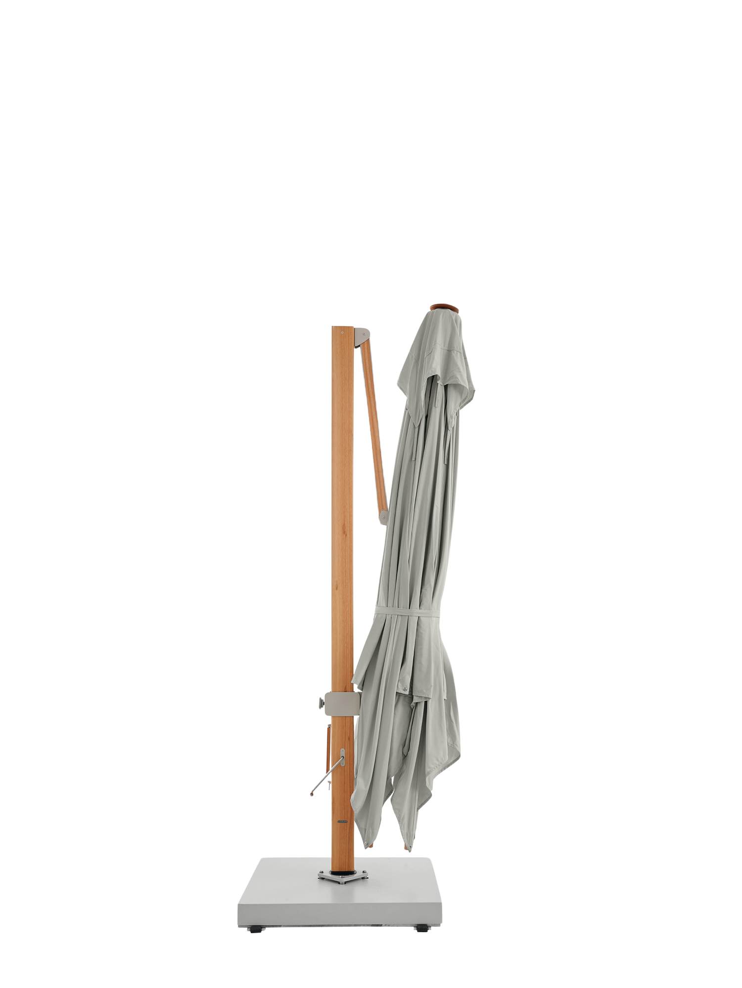 Seine Besonderheit: Ein Mast aus hochwertigem, wetterfestem Plantagenteak übernimmt die tragende Rolle. Das Schwebedach mit Windabzugshaube ist mit silbergrauem oder elfenbeinfarbenem, imprägniertem Polyacryl bespannt. Edelstahl setzt Akzente, Details aus pulverbeschichtetem Aluminium sind harmonisch auf den Farbton der Bespannung abgestimmt.