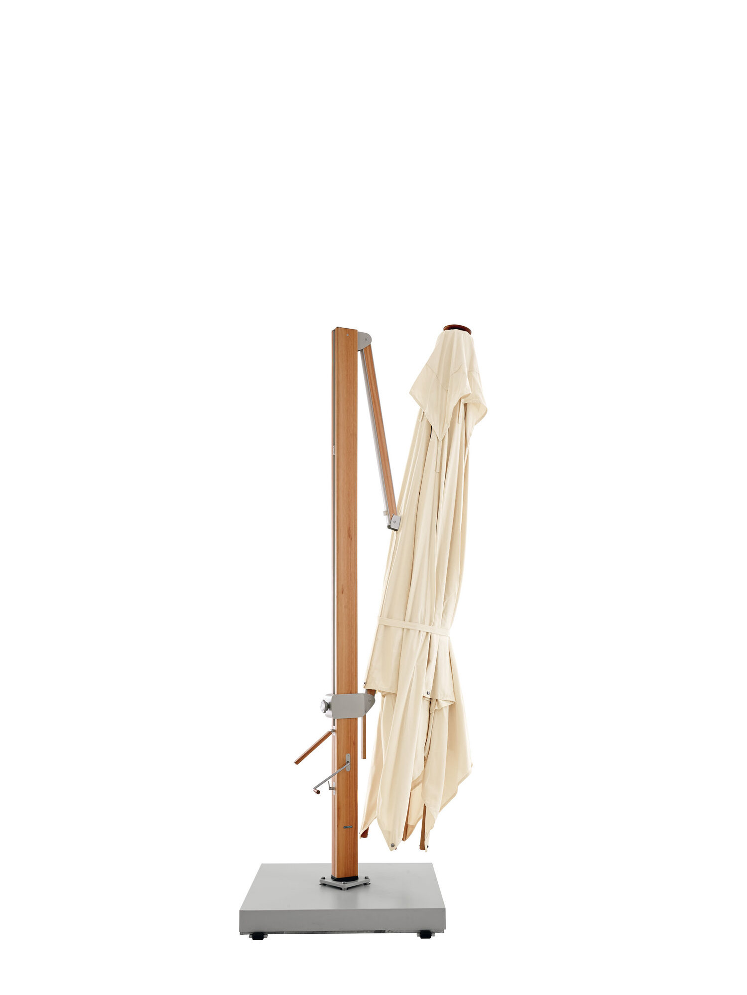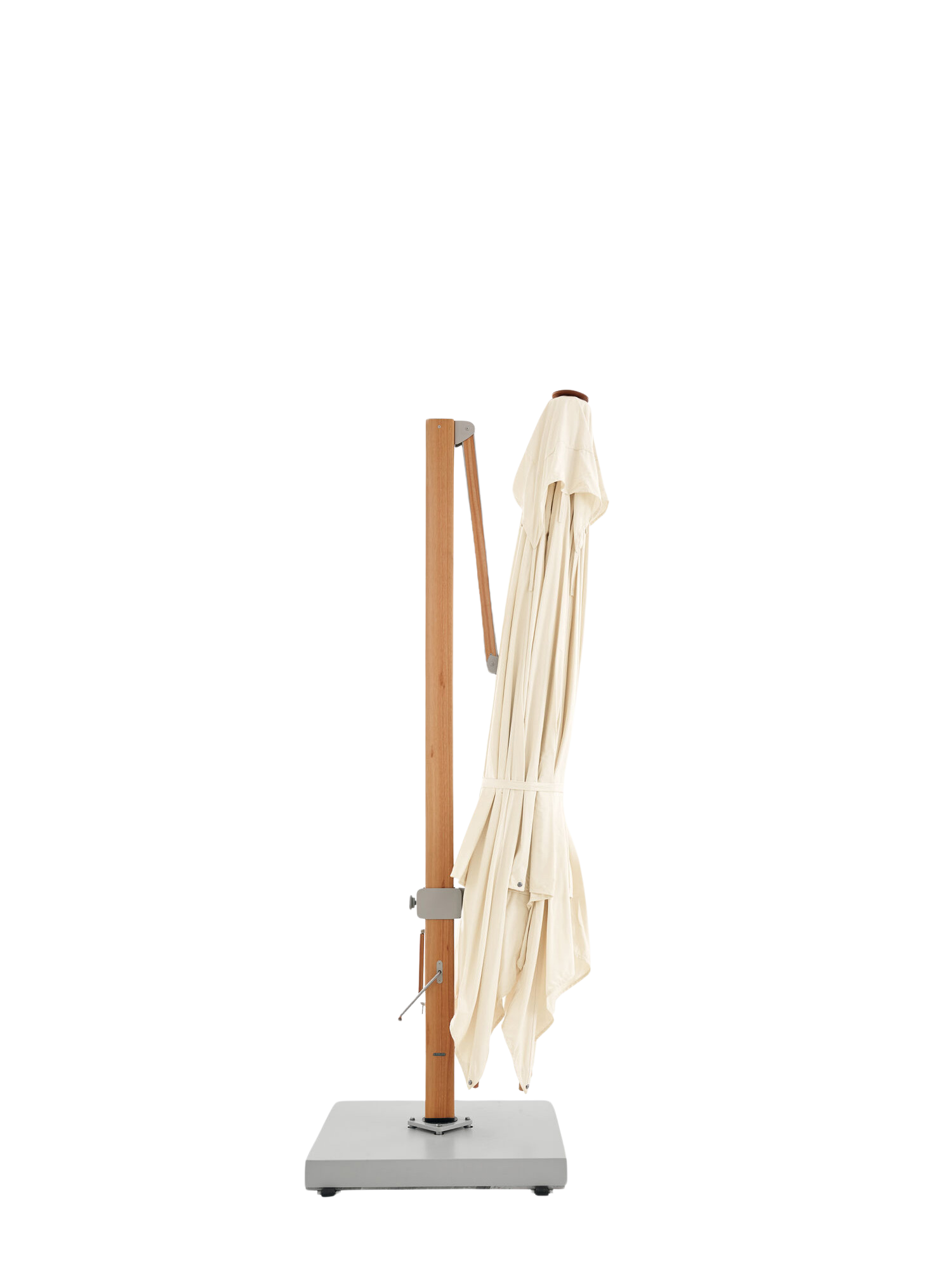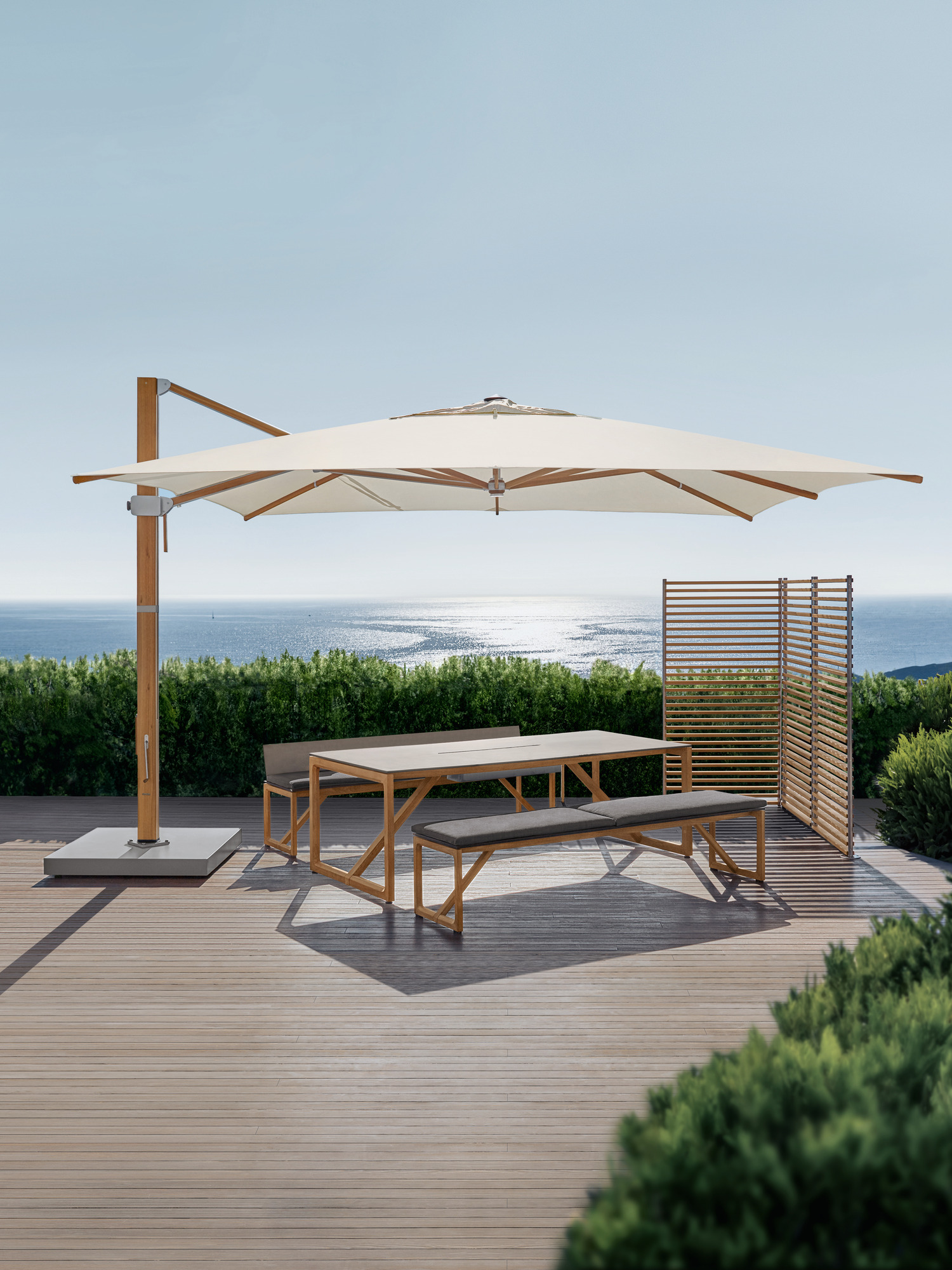 Perspektiven auf den Sommer: Der weit ausladende Schirm mit seitlichem Mast lässt sich aus der Vertikalen neigen, um die eigene Achse drehen und in acht Positionen arretieren. Sein grosszügiges Dach aus imprägniertem Polyacryl im Farbton Elfenbein bietet zuverlässigen Schutz vor der Sonne und hütet am Abend noch lange die Wärme eines Sommertages. Die komfortable Mechanik des hochwertigen Teakmastes wird mit Kurbel und Seilzug bedient. Festen Halt findet der Schirm im passenden Ständer, der eigens für die Positano Kollektion konzipiert wurde.