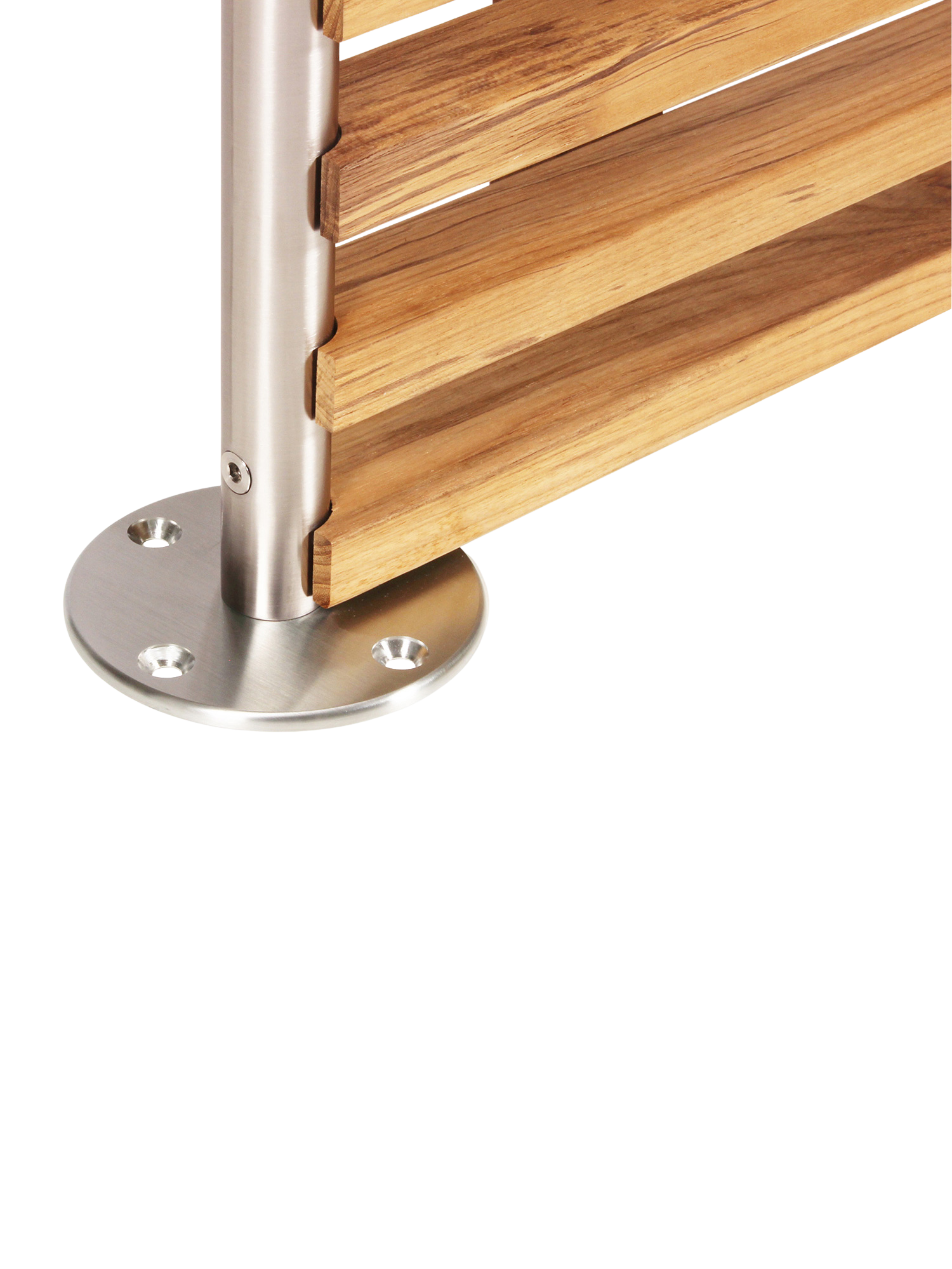 Die flachen runden Bodenteller aus Edelstahl bieten den Sichtschutzwänden aus Teak sicheren Stand.