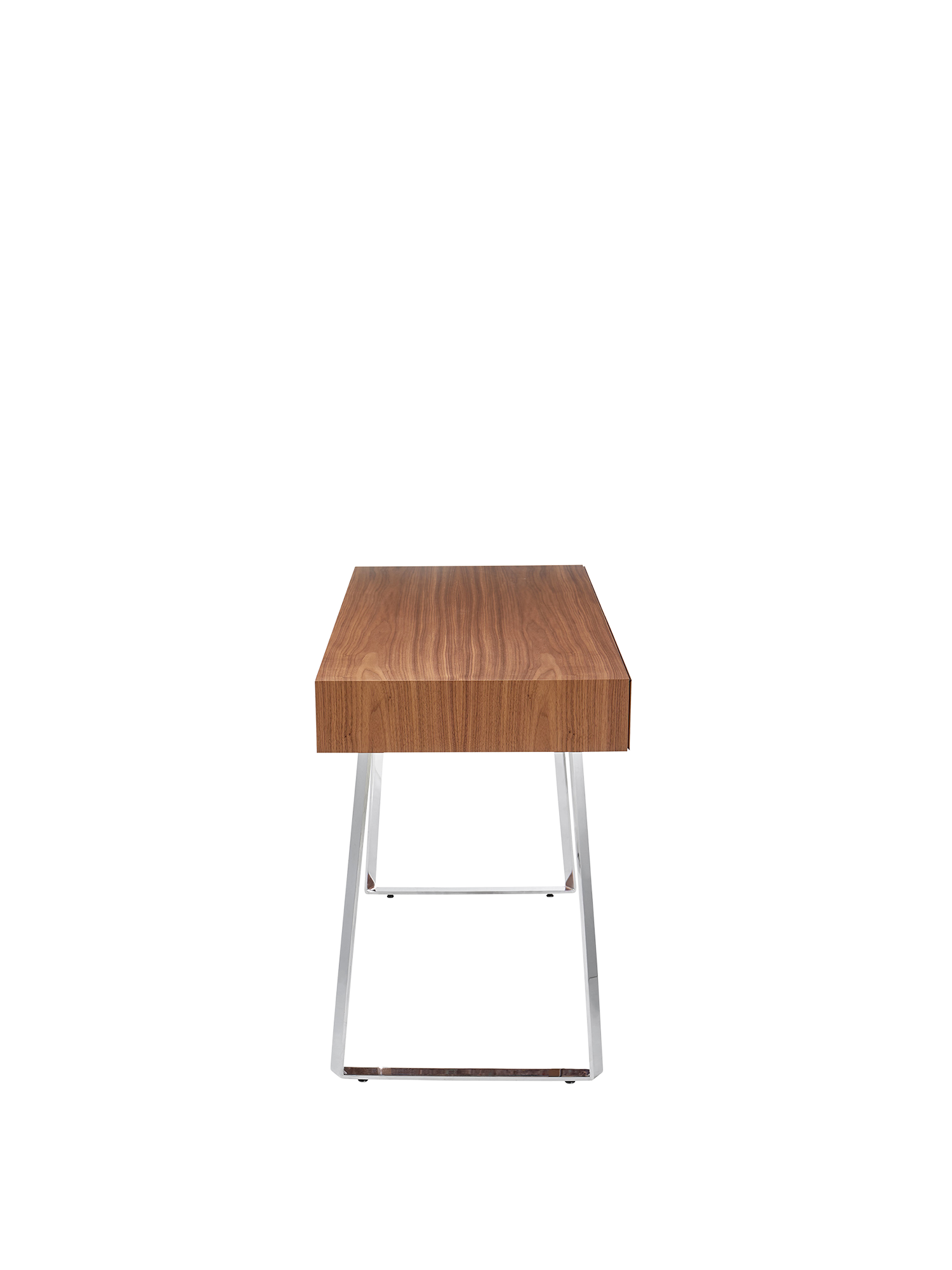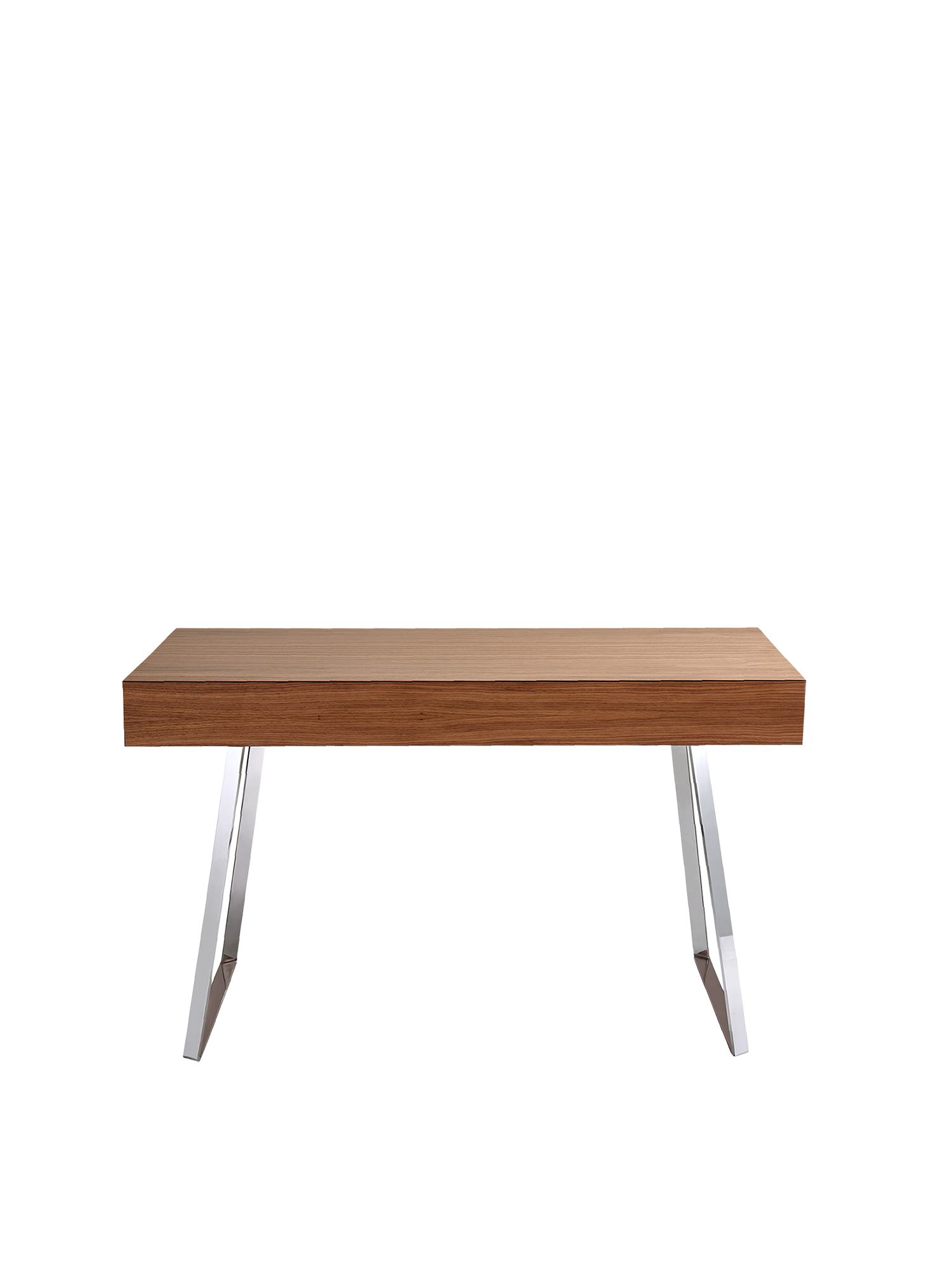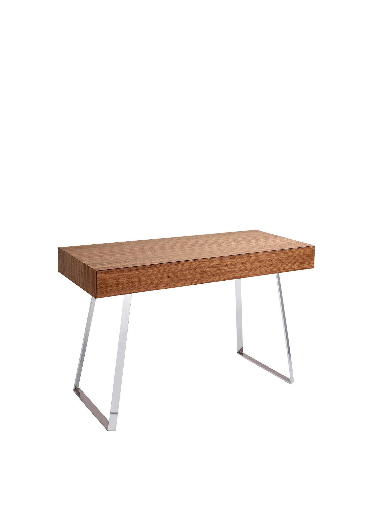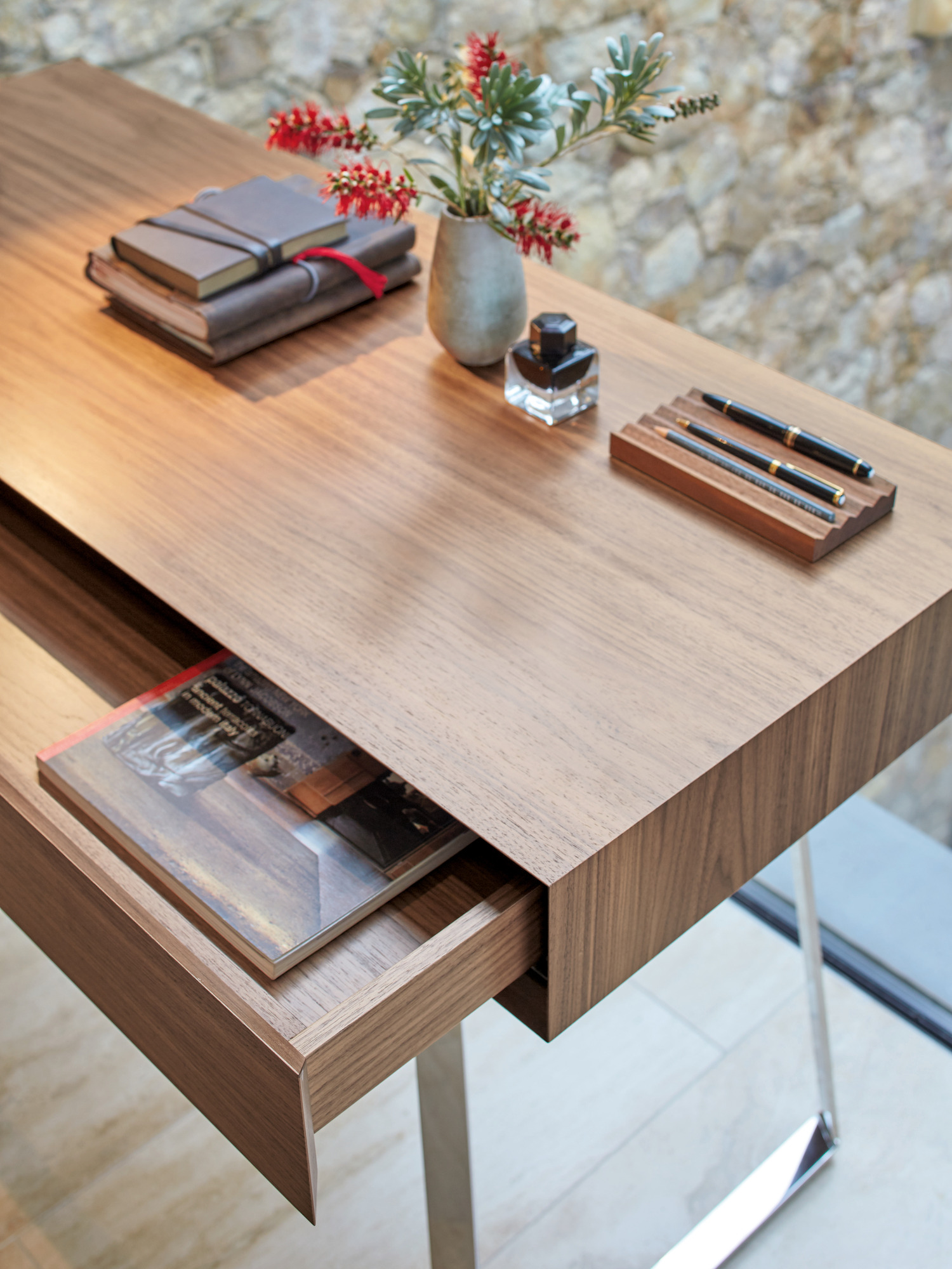 Am Konsoltisch Reeva ist alles etwas leichter, nicht nur das Arbeiten. Den besonderen Charme macht dabei die Perfektion der Holzbearbeitung des amerikanischen Nussbaums aus: Denn die leise gleitende breite Schublade der Konsole ist zunächst nicht zu erkennen – so genau schließen die mit 45 Grad gewinkelten Holzkanten der Lade in die Passform des Korpus. Dass auch die Beine des Gestells aus poliertem Edelstahl in diesem Winkel gedreht sind, optimiert das elegante Design.