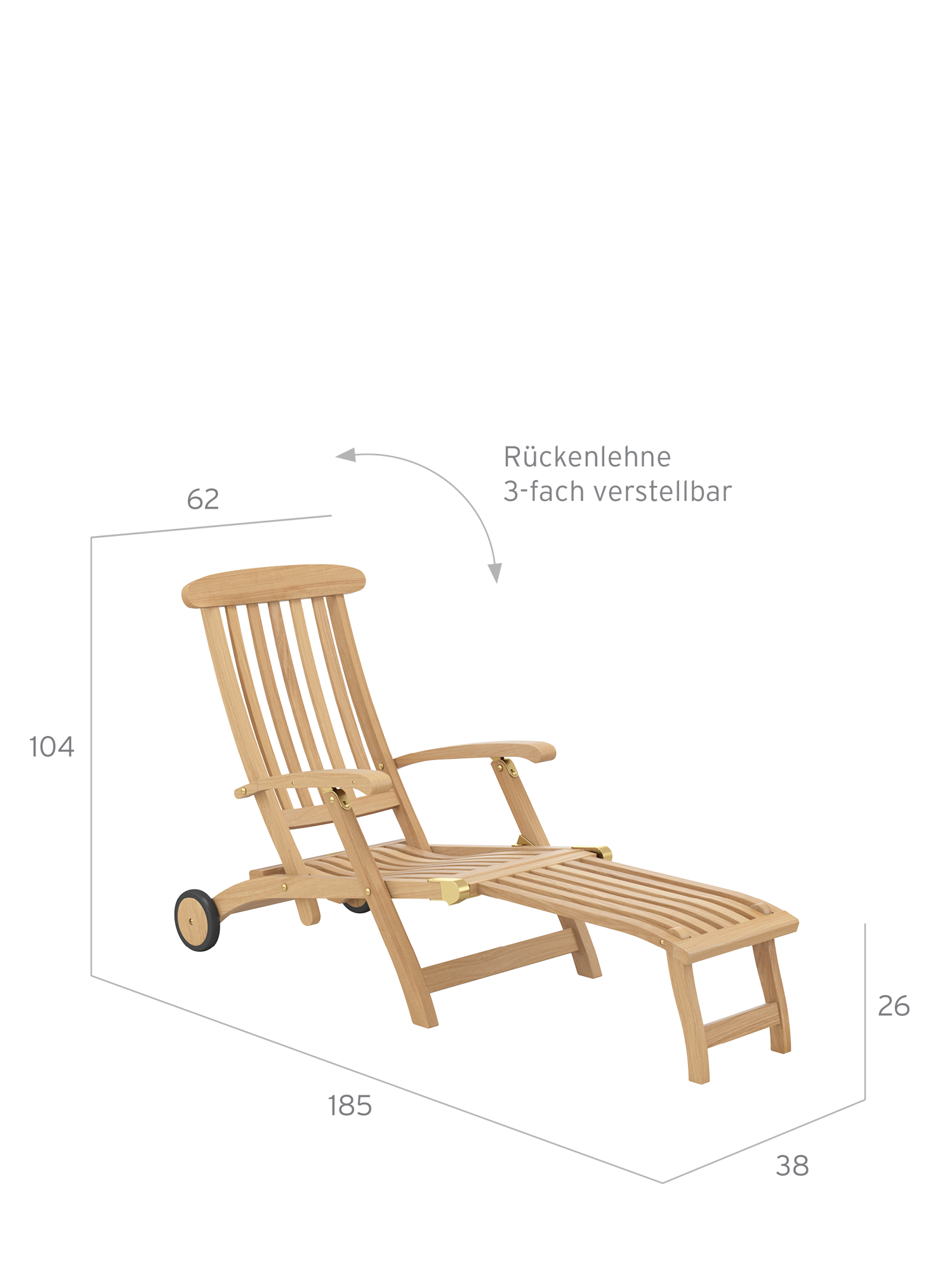 Mit seiner verlängerten Fußstütze empfiehlt sich der Deck Chair besonders für Menschen ab 1,80 m Körpergröße.