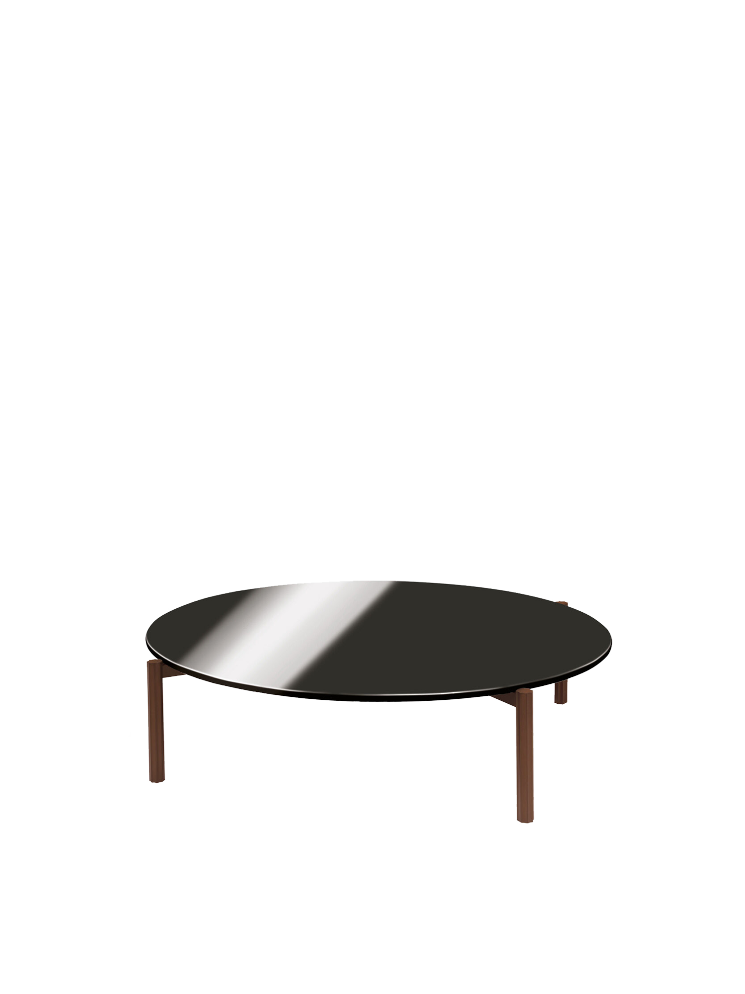 Die Formgebung des bronzefarbenen Gestells des runden Couchtisches ist von klassischen Säulen inspiriert. Im Zusammenwirken mit dem umgebenden Licht erzeugen die kannelierten Oberflächen reizvolle Effekte. Die Glasplatte ist schwarz lackiert und an den Rändern sanft gerundet. Im Zentrum der Sitzgruppe bietet sie Ablagefläche für Lektüre, Gläser und Erfrischungen. Und setzt mit ihrem schlichten Design vielfältige Wohnaccessoires attraktiv in Szene.