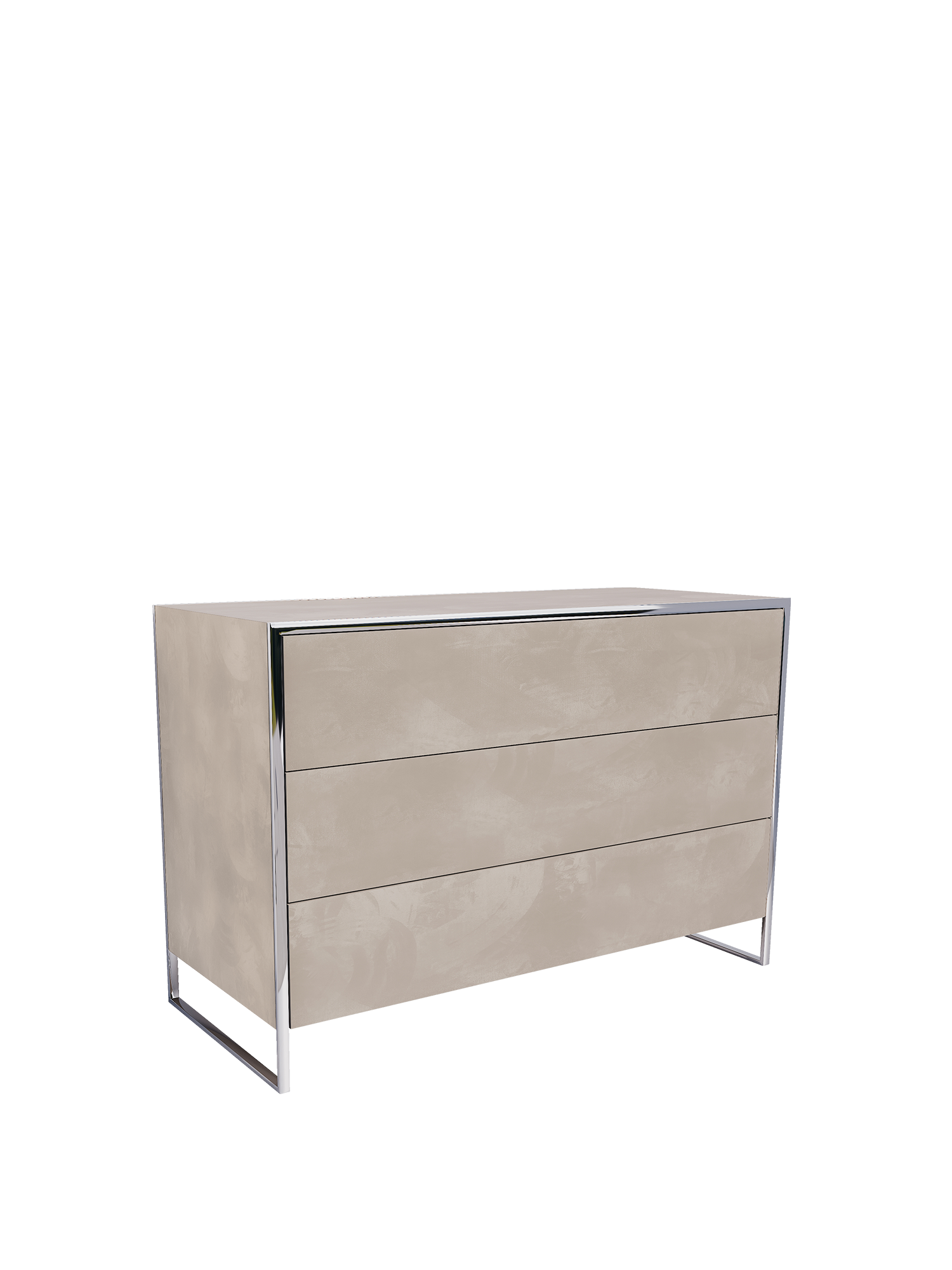 Klare Linien kennzeichnen das schlichte aber markante Design des eleganten Sideboards mit drei Schubladen, die sich per Soft Close schließen. Die kompakte Größe schafft auch in kleineren Räumen zusätzlichen Platz zum Verstauen. Ein Gestell aus glänzend poliertem Edelstahl sorgt für Standfestigkeit, die sanft changierenden Oberflächen aus pflegeleichtem Mikroleder in dezentem Beige fügen sich harmonisch in jedes Ambiente.