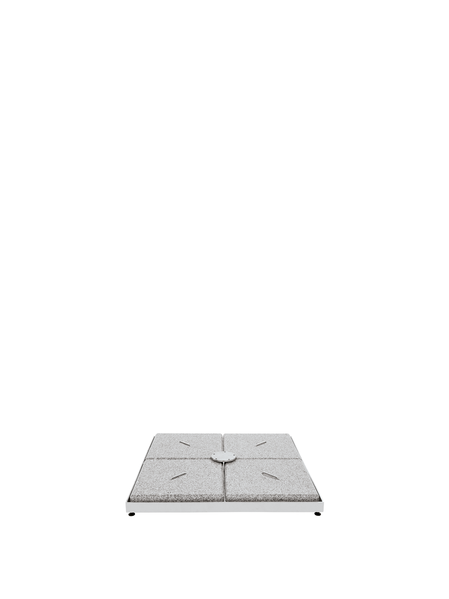 Der quadratische Schirmständer bietet soliden Halt für den Sonnenschirm Trentino. Er ist wartungsfrei feuerverzinkt und wird mit vier Einlegeplatten aus poliertem Granit mit kleinen Edelstahlgriffen beschwert.