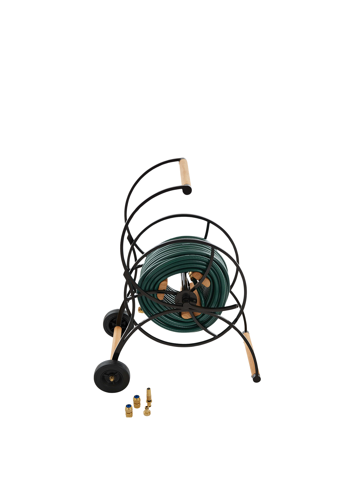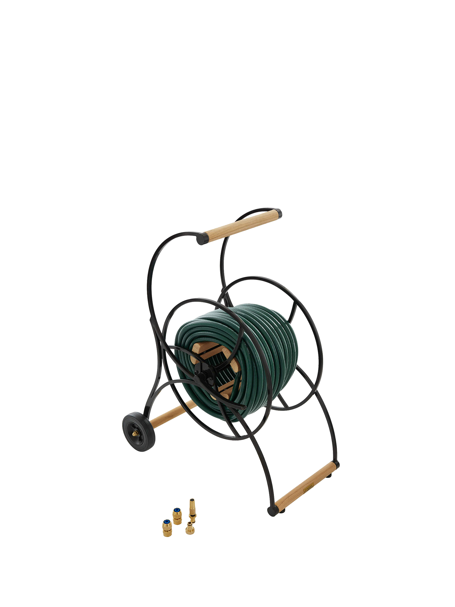 Der stabile Caddie für den Gartenschlauch hat Griffe aus Teak und besteht aus galvanisiertem, pulverbeschichtetem Stahl. Der 50 m lange 1/2-Zoll-Schlauch in elegantem Dunkelgrün wird mit einer Handkurbel aufgerollt und inklusive Steckanschlüssen aus hochwertigem Messing geliefert.