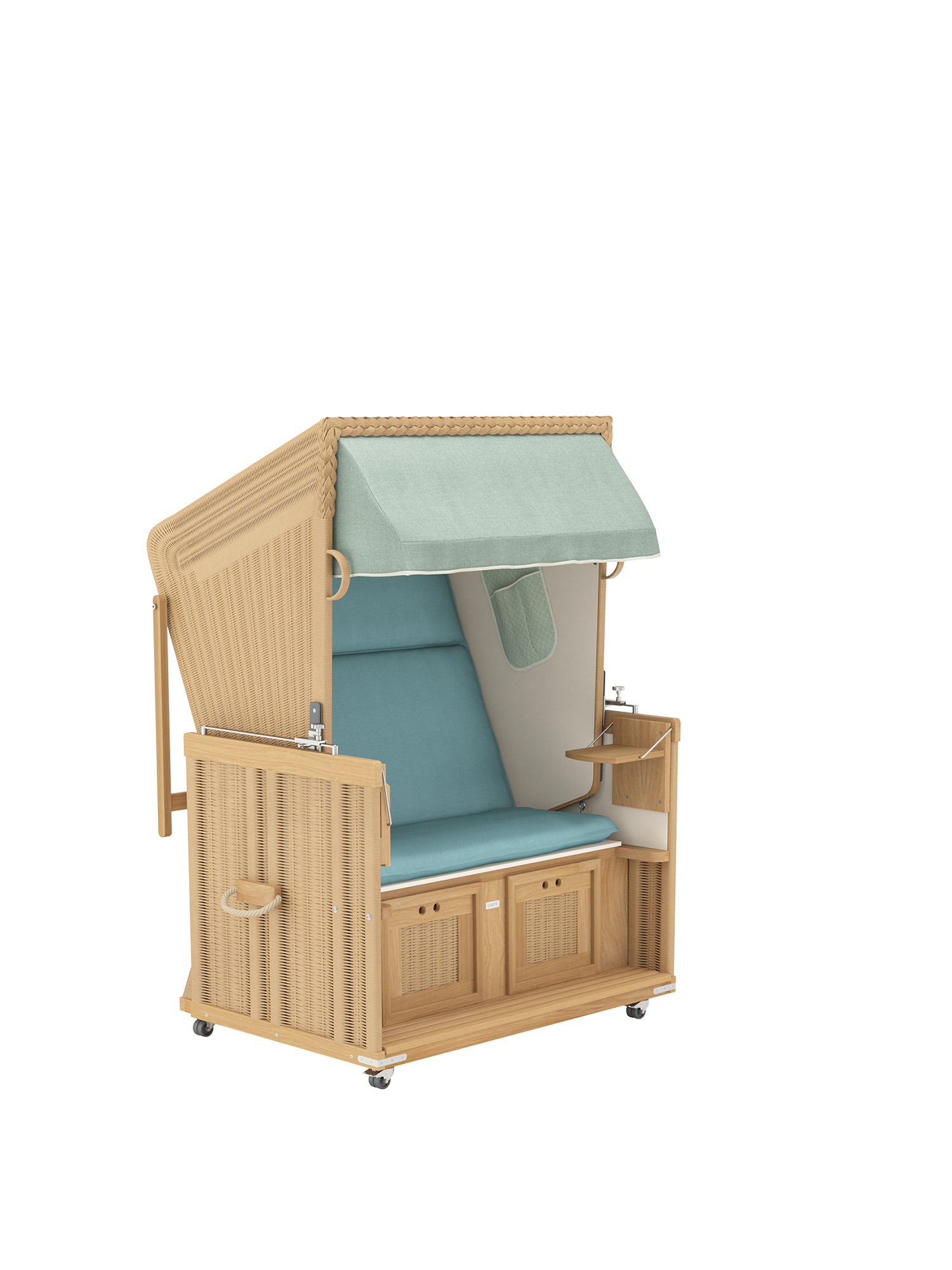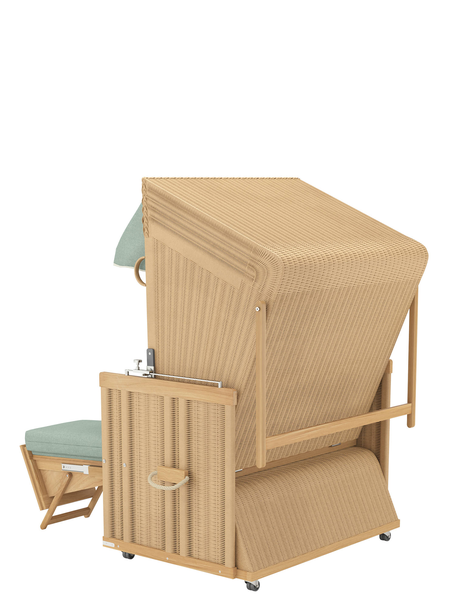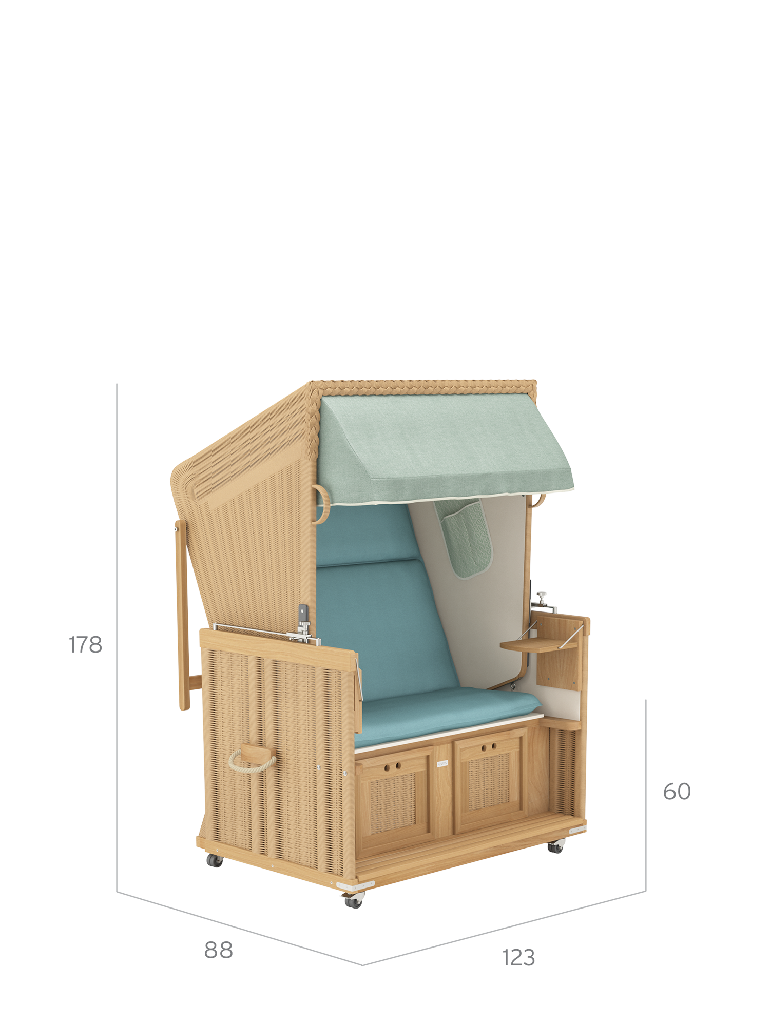 Der Strandkorb besteht aus einem massiven Teakkorpus, der mit einem wetterfesten Kunststoffgeflecht und Edelstahlbeschlägen kombiniert wird. Der elegante Stoff ist unempfindlich und bis auf die Innenauskleidung abnehm- und waschbar.