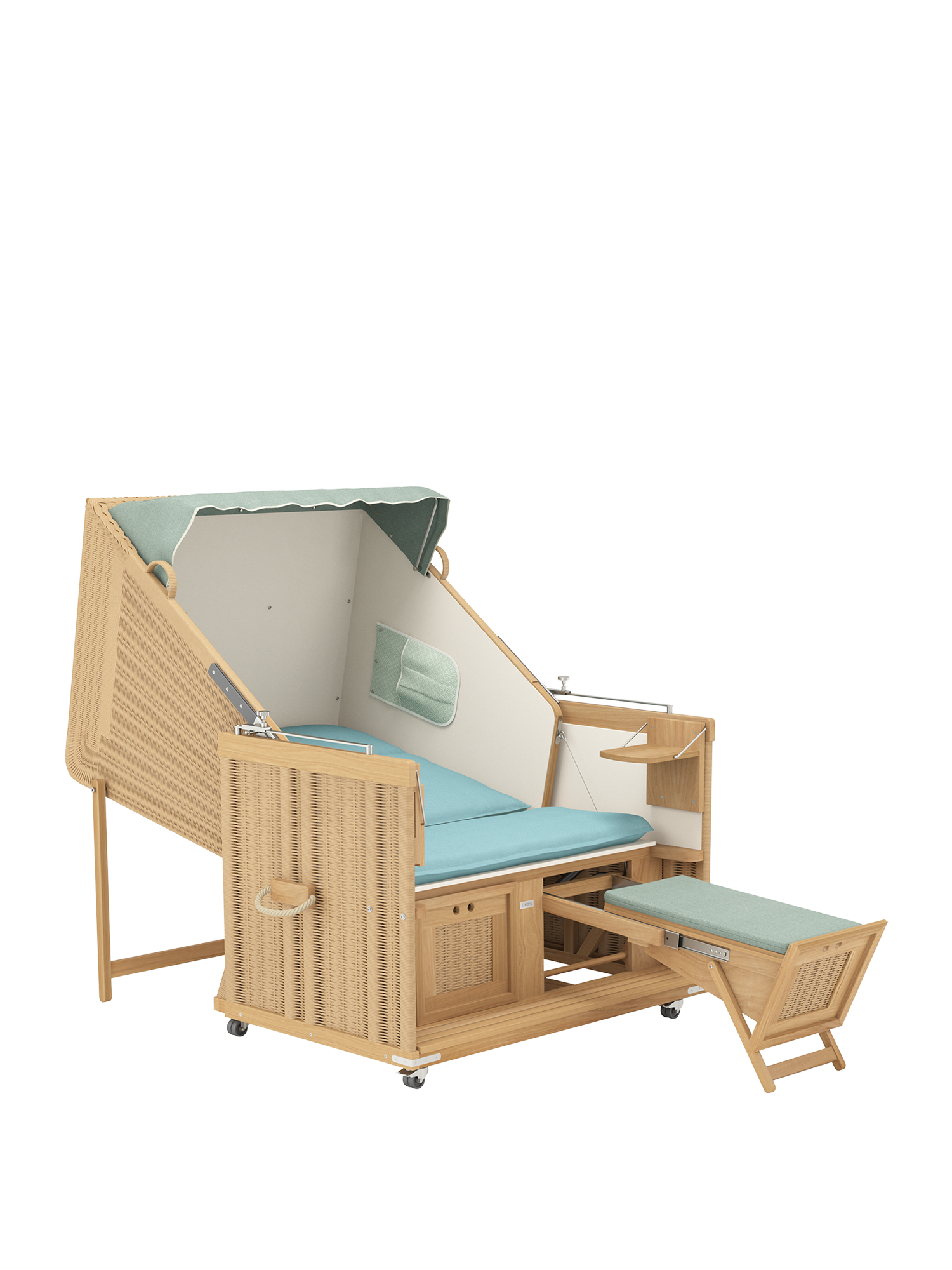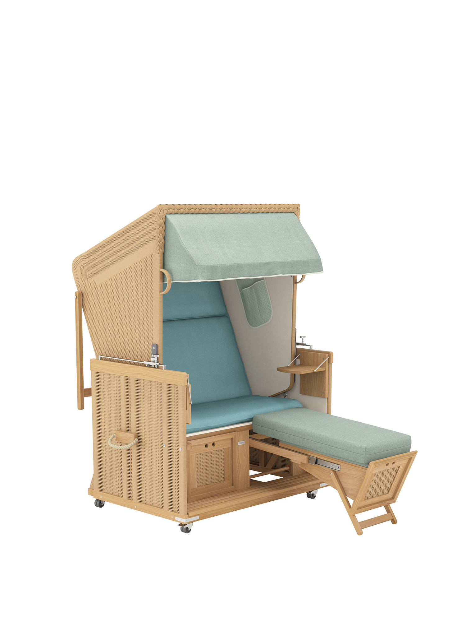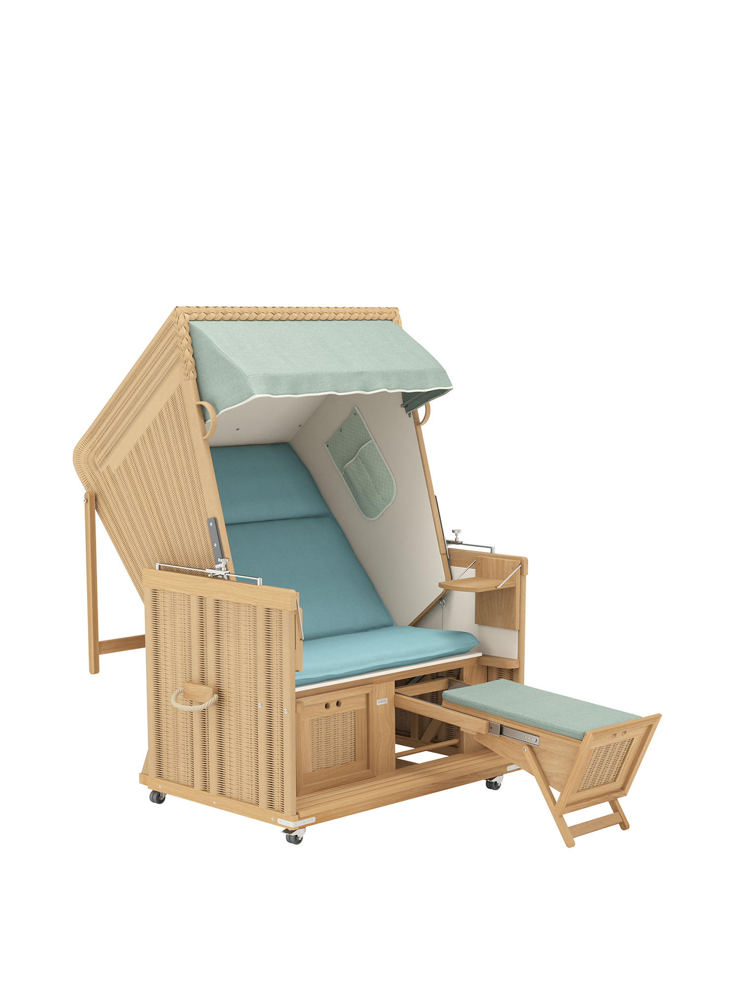 Der Strandkorb besteht aus einem massiven Teakkorpus, der mit einem wetterfesten Kunststoffgeflecht und Edelstahlbeschlägen kombiniert wird. Der elegante Stoff ist unempfindlich und bis auf die Innenauskleidung abnehm- und waschbar.