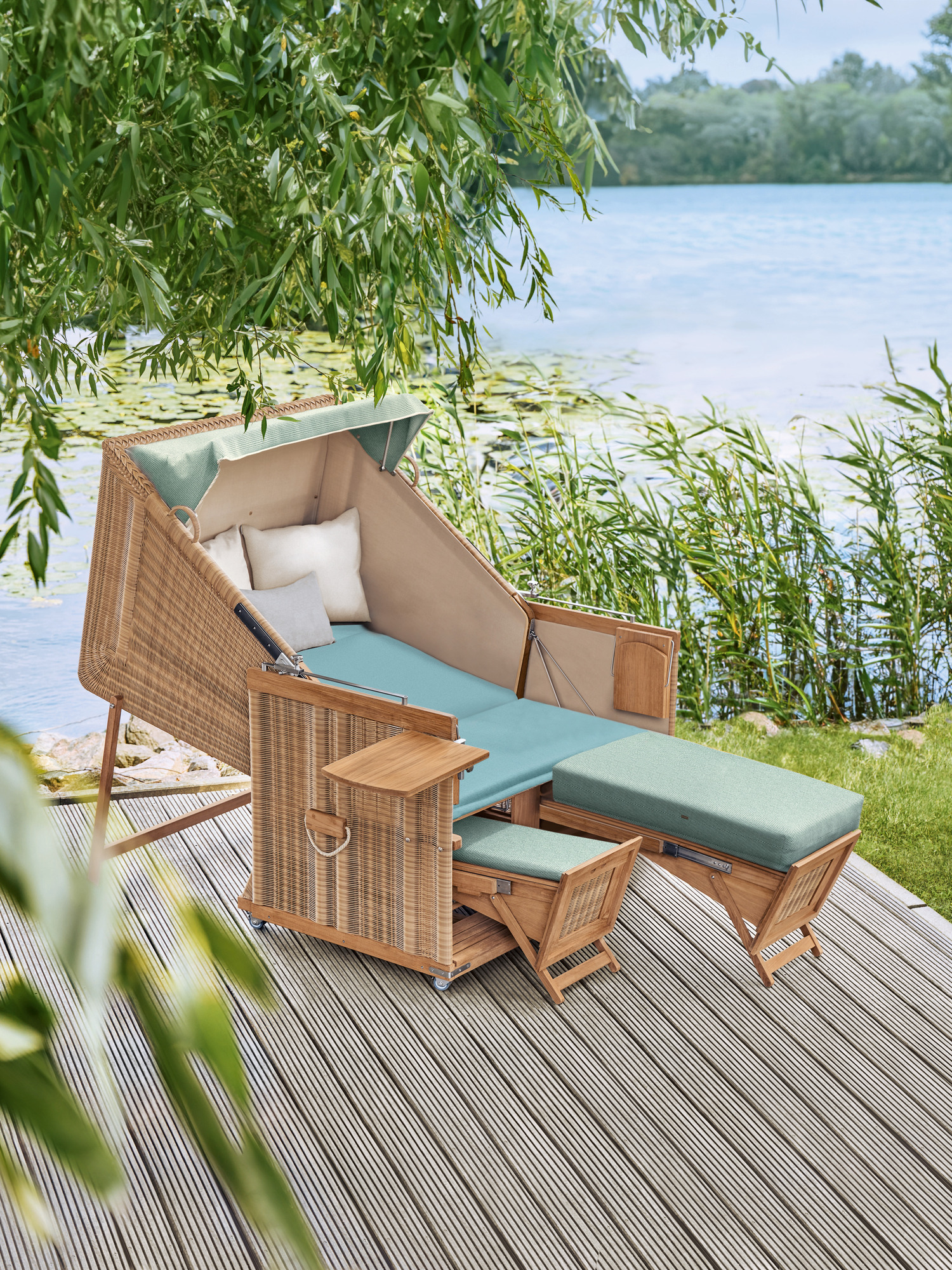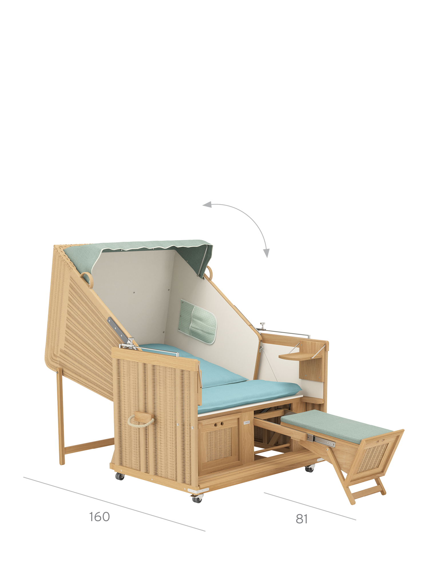 Zum Lieferumfang gehören zwei Teaktabletts und eine Lektüretasche. Räder, die auch festgestellt werden können, machen den Strandkorb beweglich. Zum Schutz vor Nässe wird außerdem eine Abdeckhaube mitgeliefert.