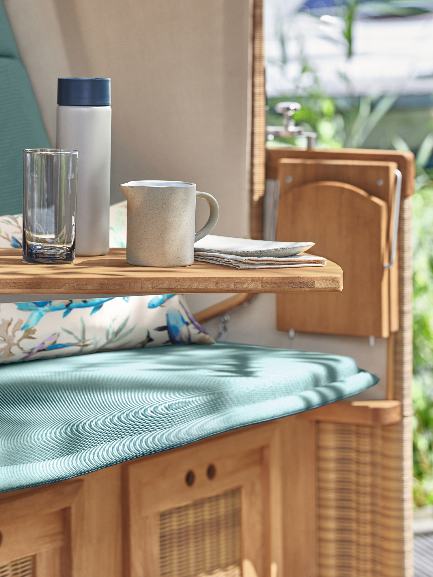 - massiver Teakkorpus und robustes Kunststoffgeflecht