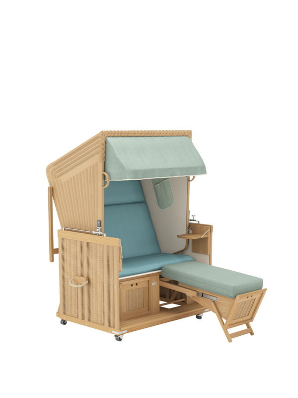 Der geräumige und gepolsterte Sitz des Strandkorbs lässt sich stufenlos zur komplett flachen Doppelliege verstellen. Dank einer Rückholfeder kann der Korb an zwei Griffen leicht wieder aufgerichtet werden.