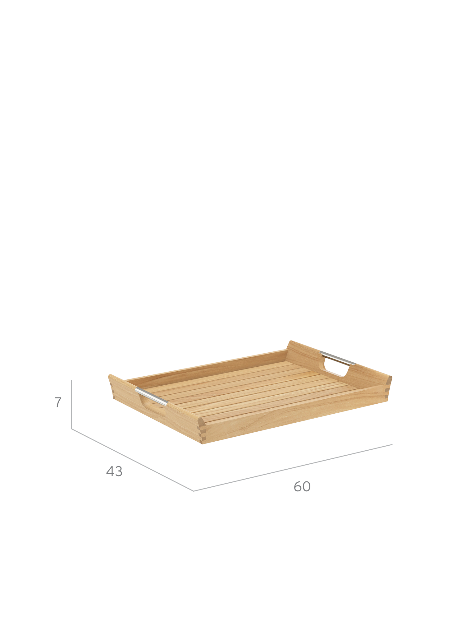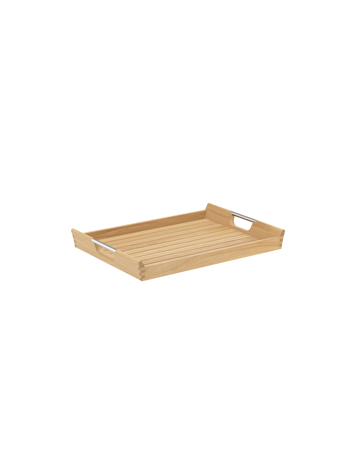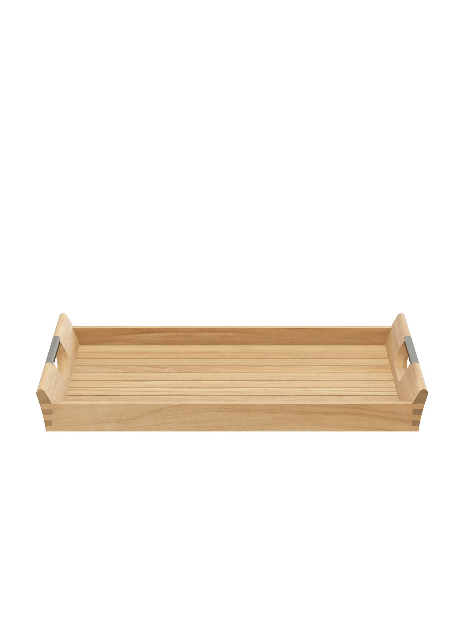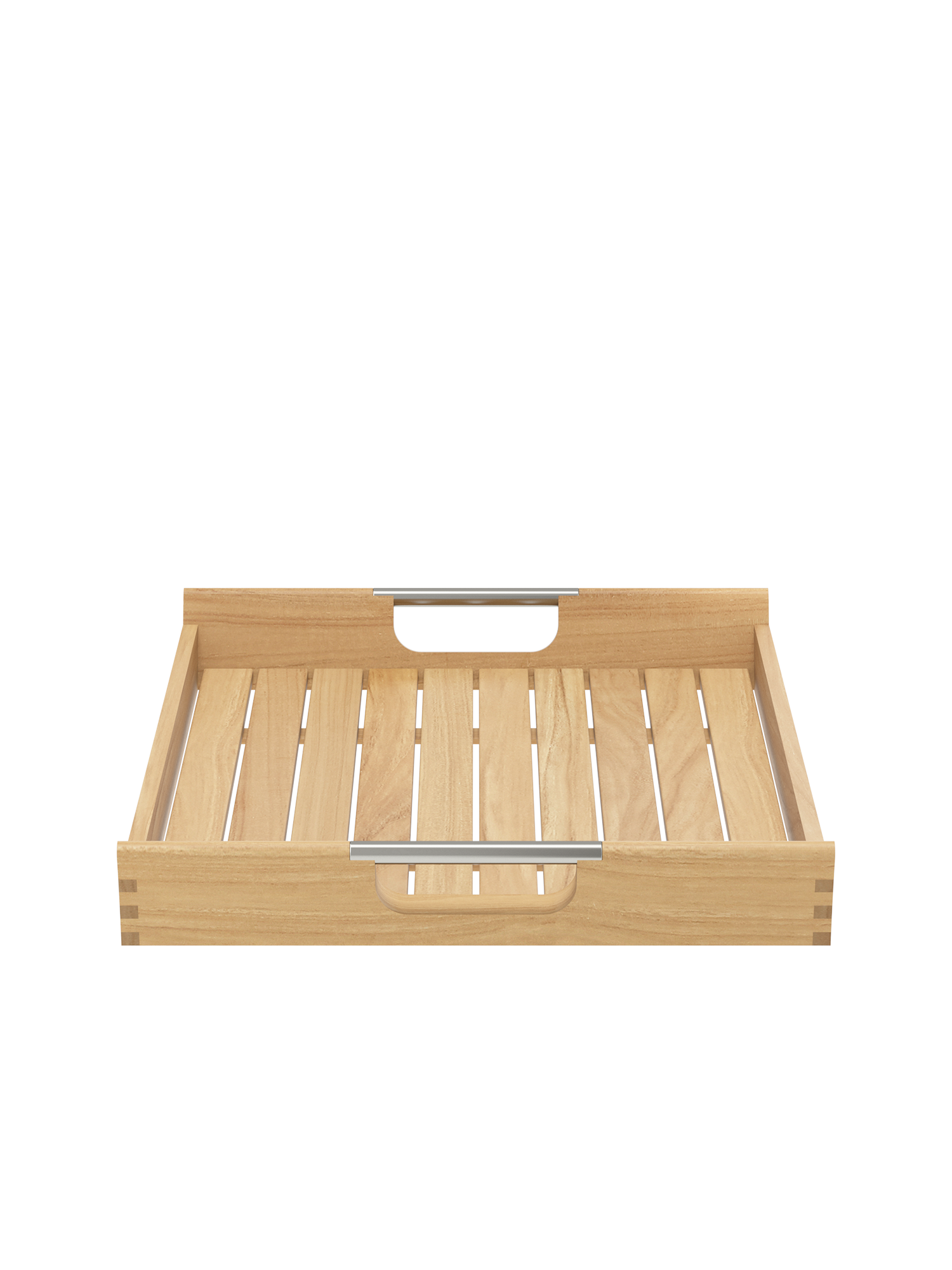 Das abnehmbare Tablett des mobilen Butler's Tray ist als schönes Accessoire auch einzeln erhältlich. Es besteht aus massivem Teak mit zwei eleganten Edelstahlgriffen.